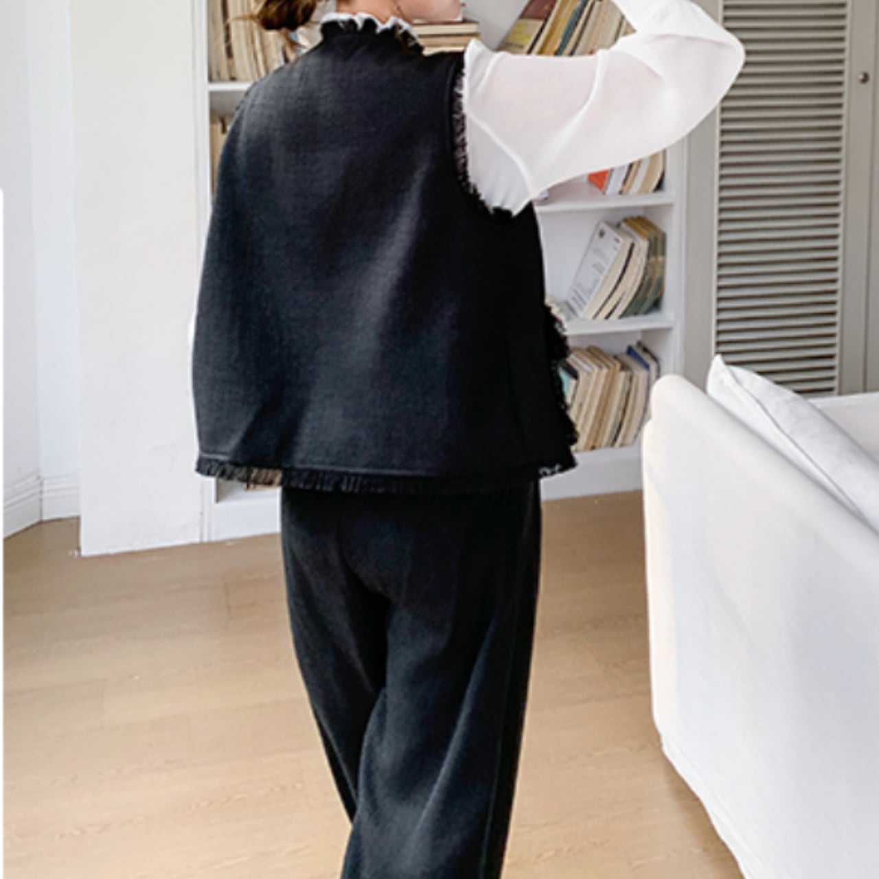 裾と襟周りのフリンジ加工で遊び心をプラスしたデザインのセットアップ。