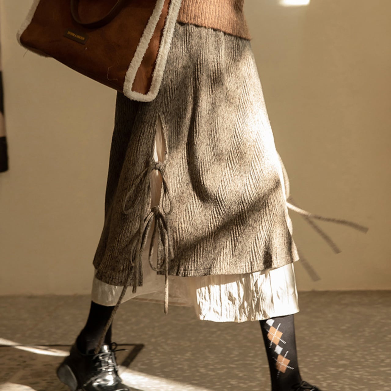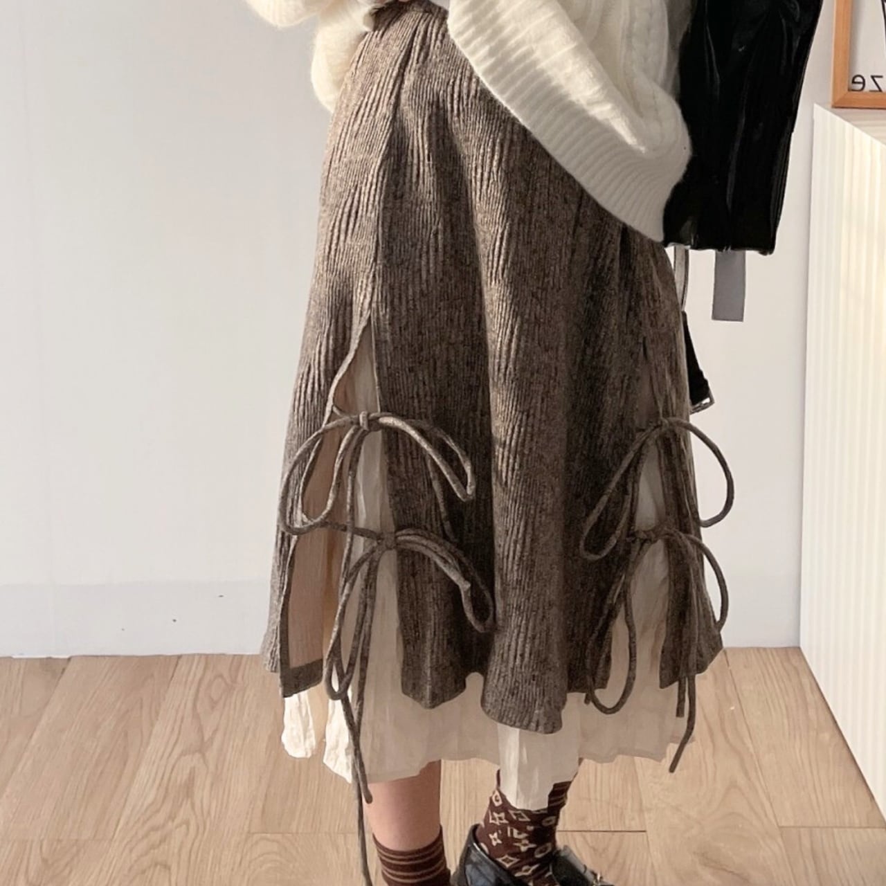 サイドに施されたリボンディテールと、裾から覗くレイヤードデザインが印象的なスカート。