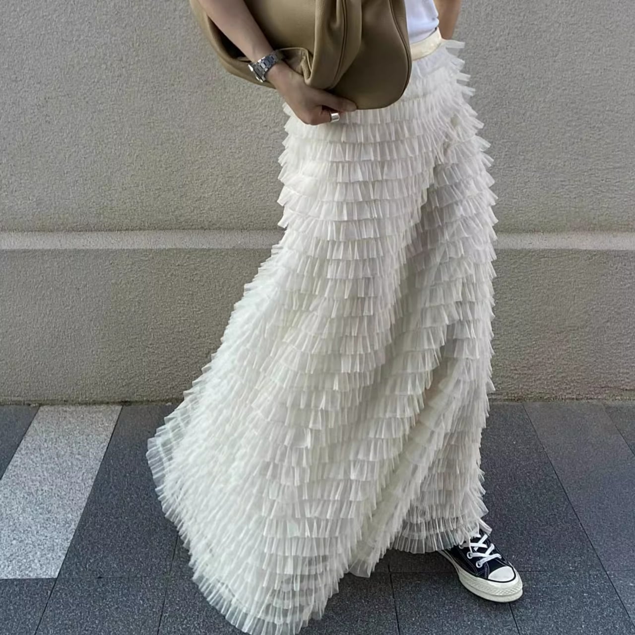 幾層にも重ねられたティアードデザインが、歩くたびに優雅に揺れるAラインシルエットのマキシスカートです。純白の清楚なカラーリングと、計算されたフリンジの重なりが生み出すエレガントな立体感で、女性らしい上品な印象を演出します。