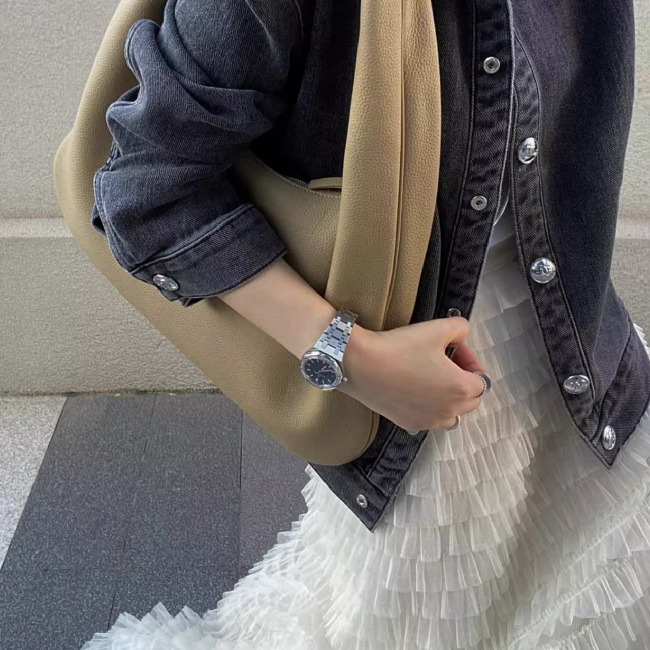 ・シンプルなTシャツやブラウスと合わせて、デイリースタイルを楽しむ。