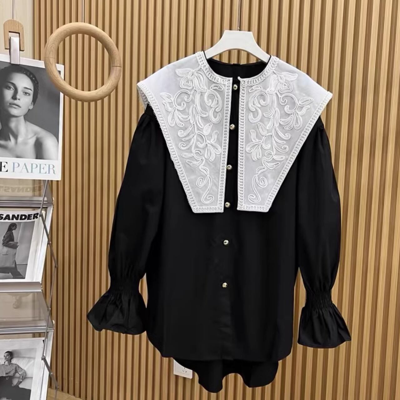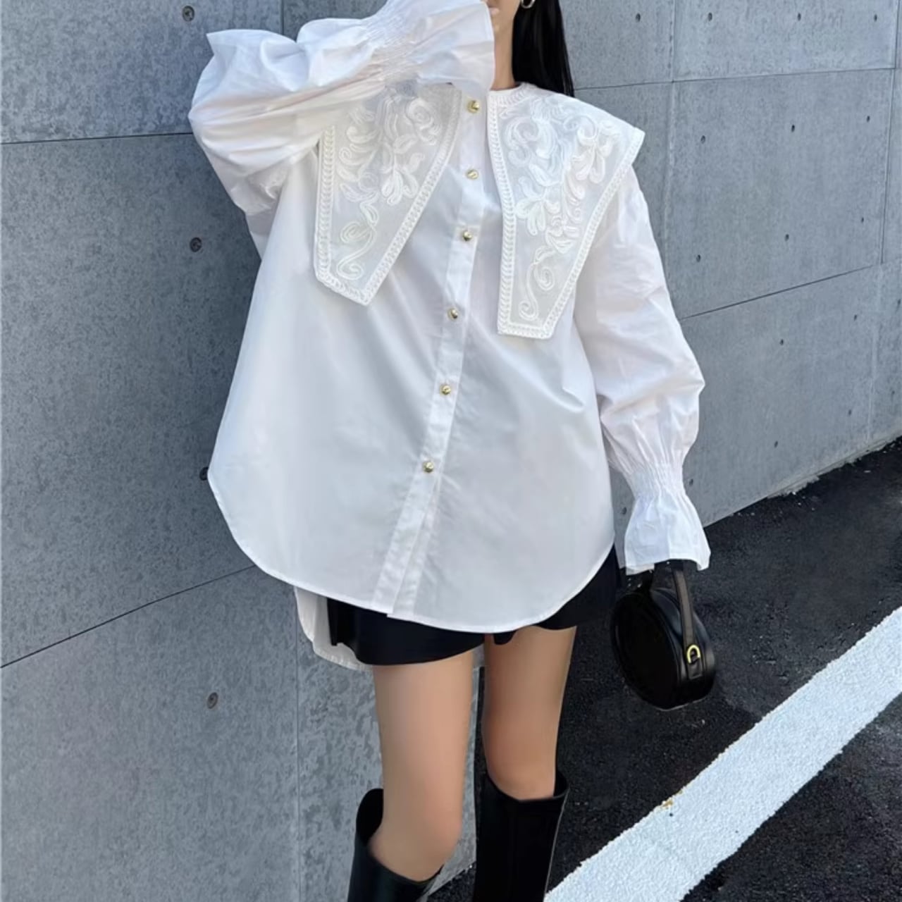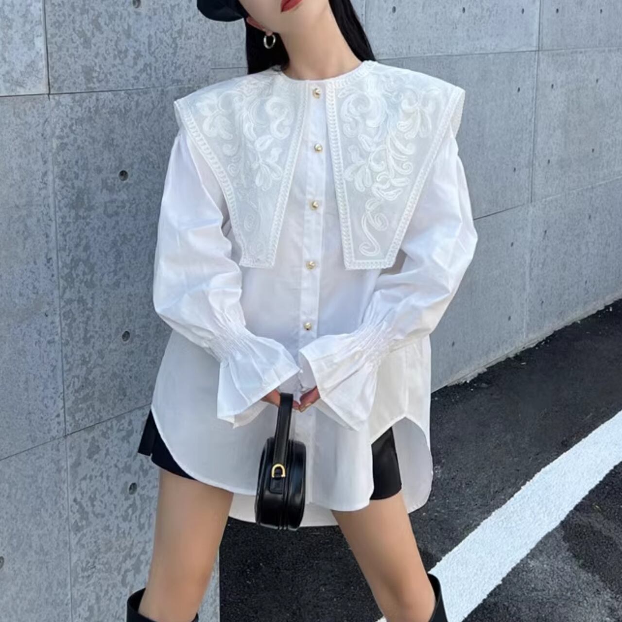胸元を華やかに彩る繊細なレース刺繍の襟が、一枚でコーディネートを格上げしてくれる特別な一枚。