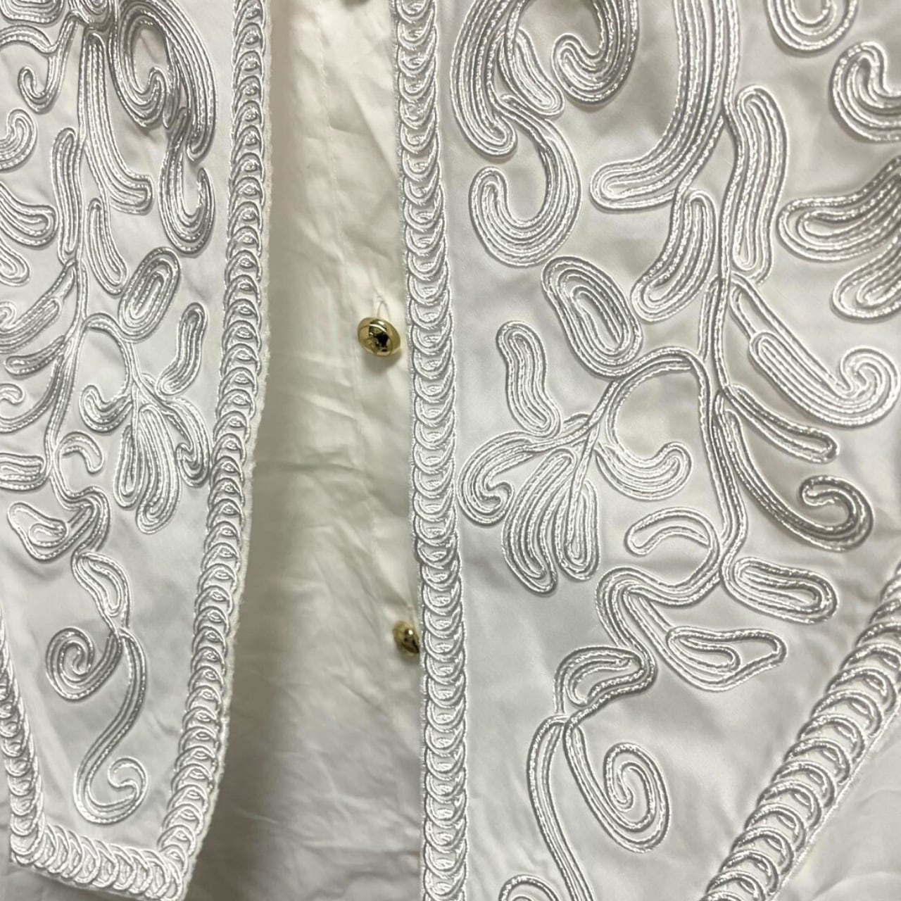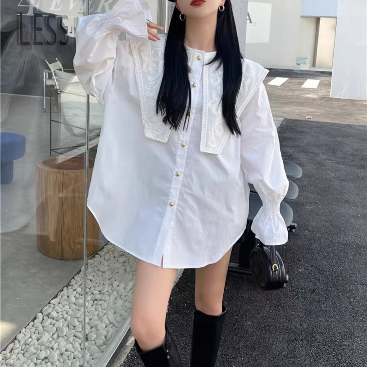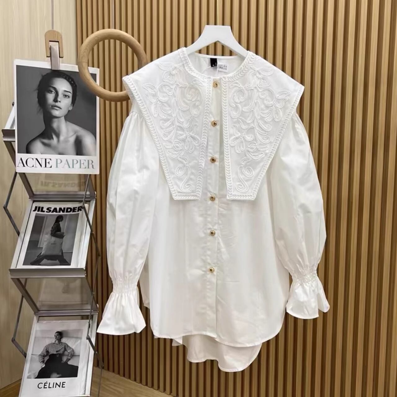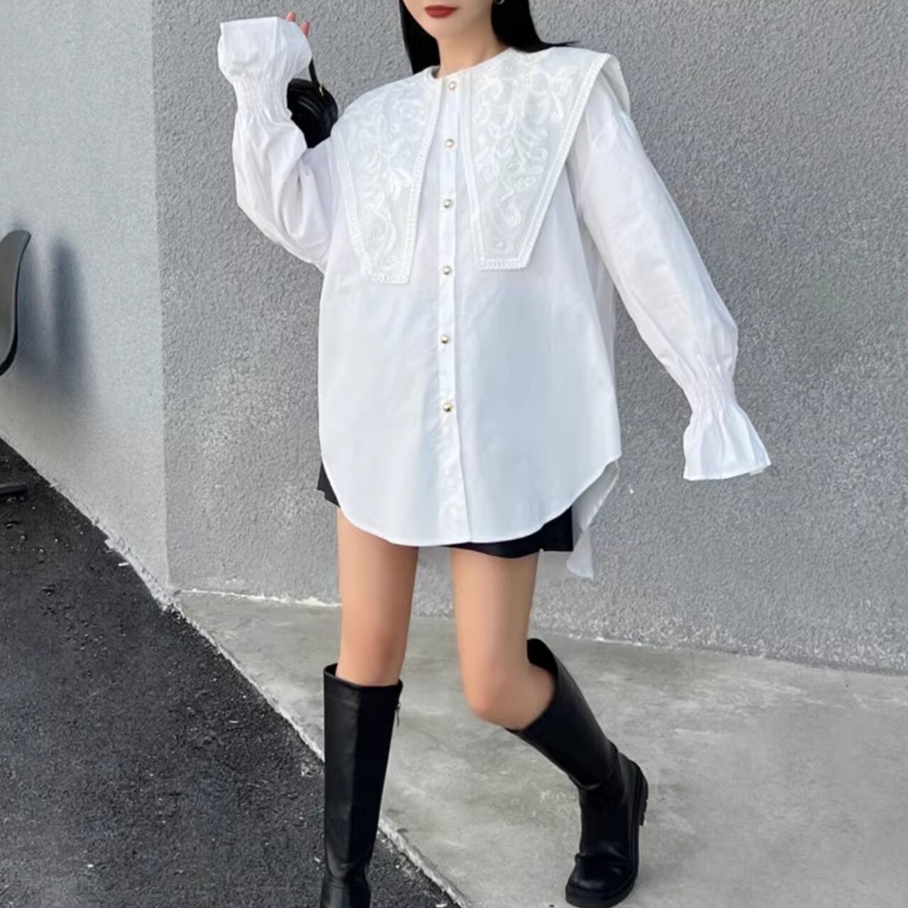 胸元を華やかに彩る繊細なレース刺繍の襟が、一枚でコーディネートを格上げしてくれる特別な一枚。