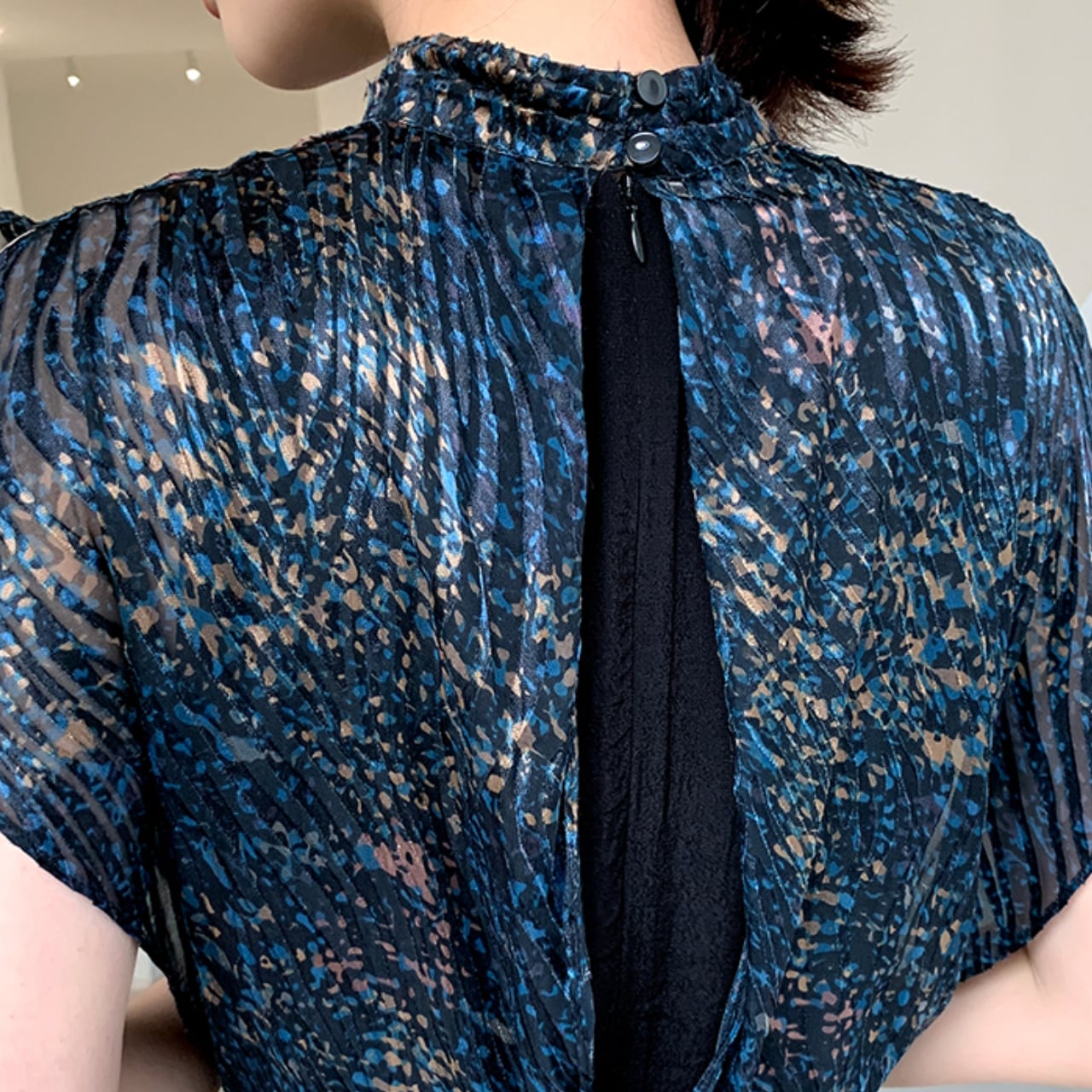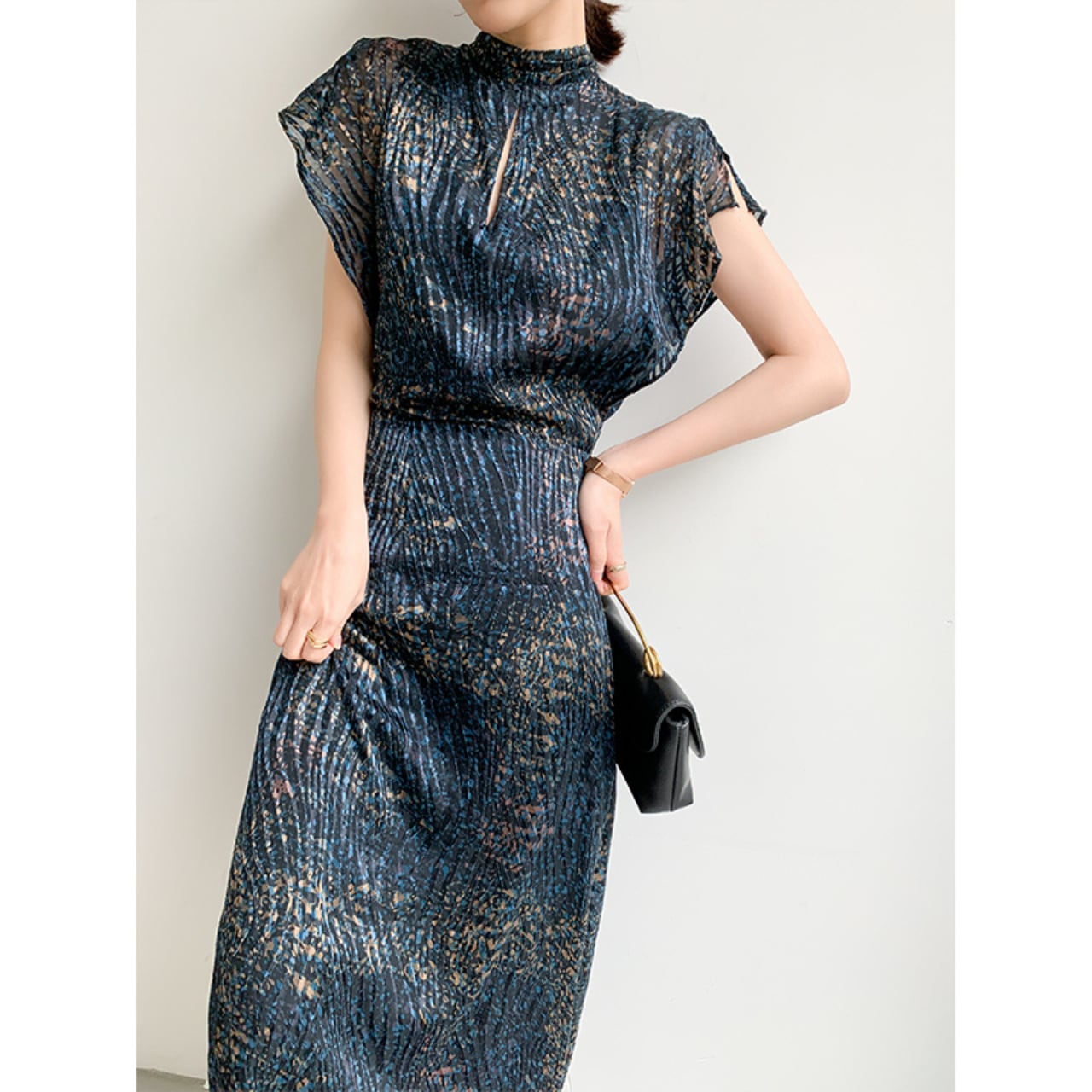 繊細なプリーツ加工に施された幻想的なブルーグラデーションプリント。光の角度によって表情を変える、まさにアート作品のようなワンピースです。