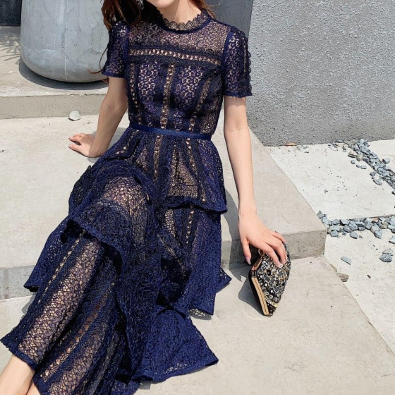 4段のティアードデザインが生み出す立体的なシルエットと、透け感のあるレースが織りなす上品なセクシーさが、特別な日のあなたを演出します。