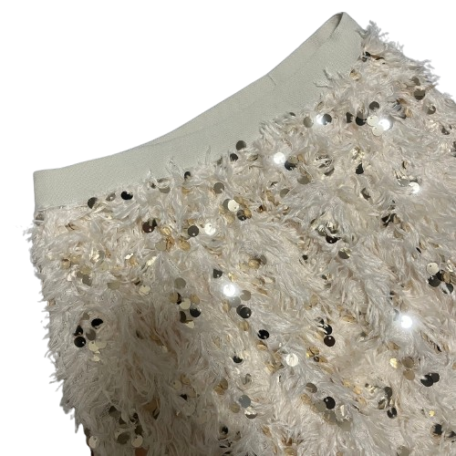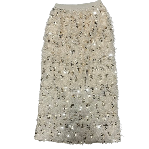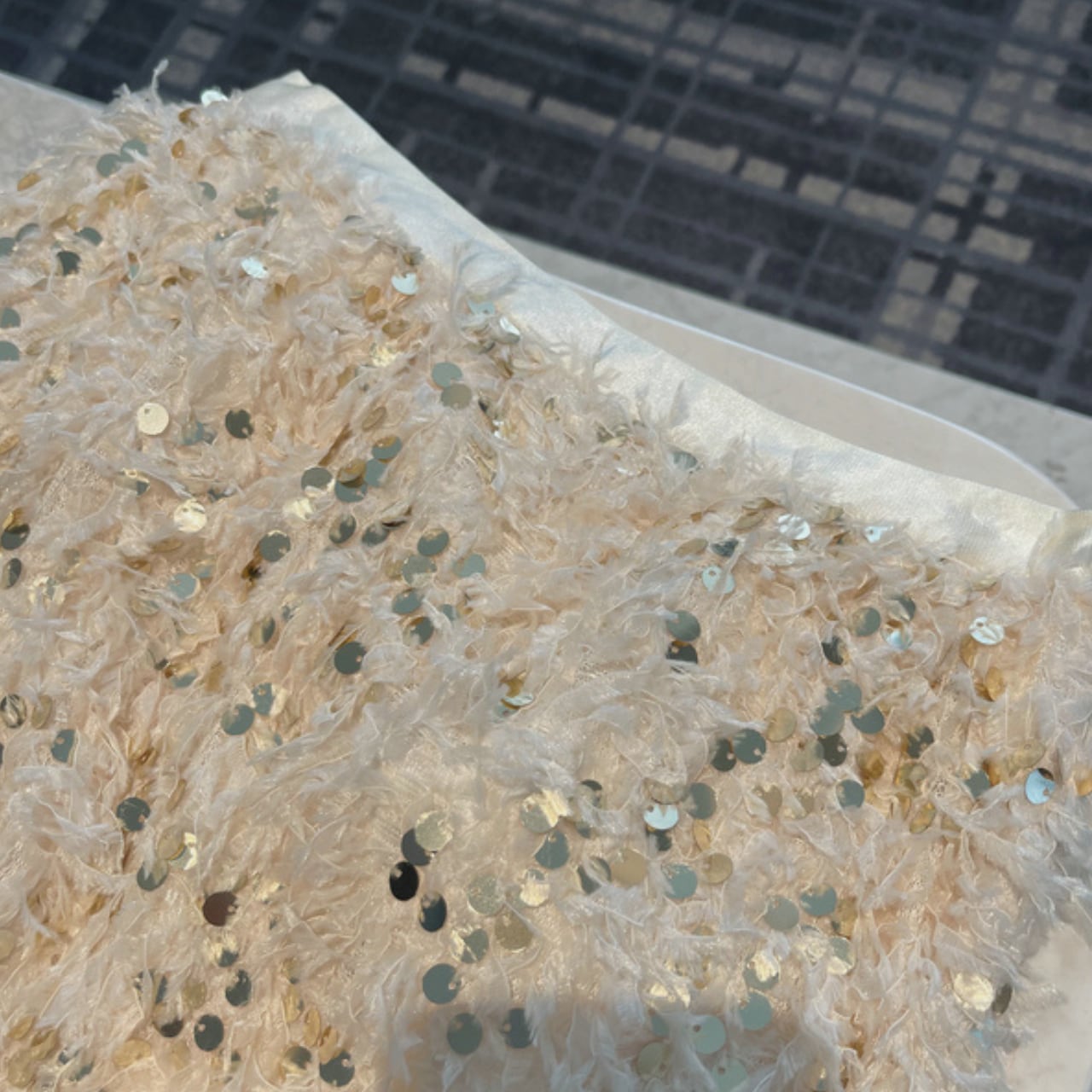 繊細なフリンジ素材に煌めくスパンコールを散りばめた、まさにアート作品のようなスカート。光の角度によってキラキラと表情を変える贅沢な仕上がりで、着る人を主役に押し上げます。