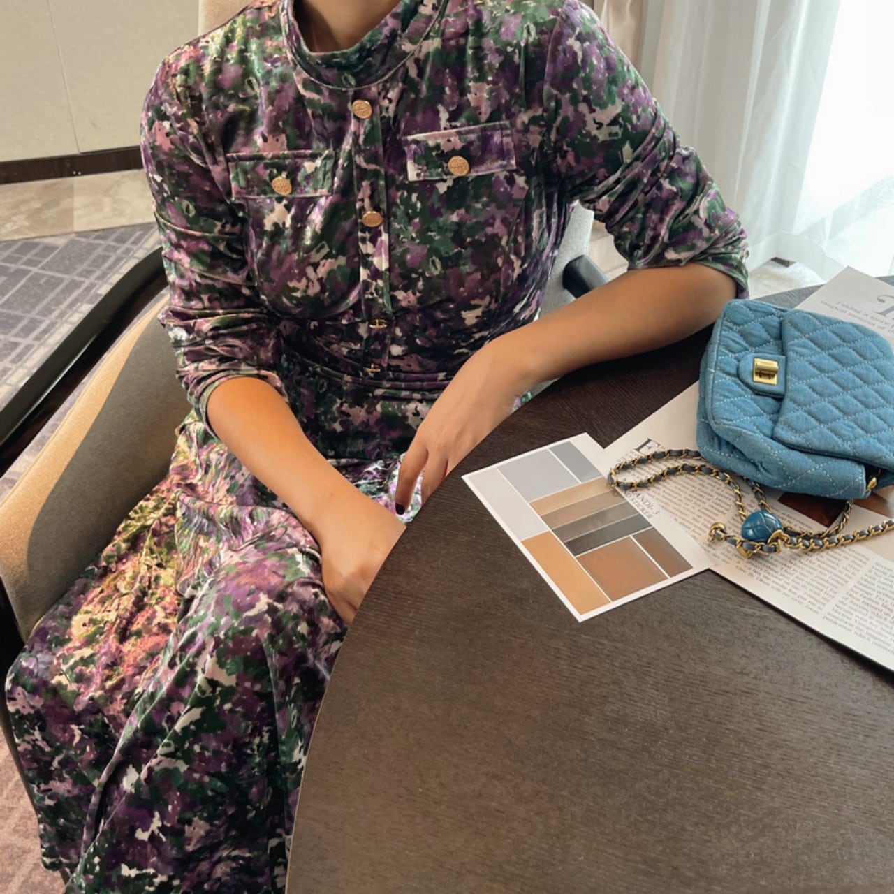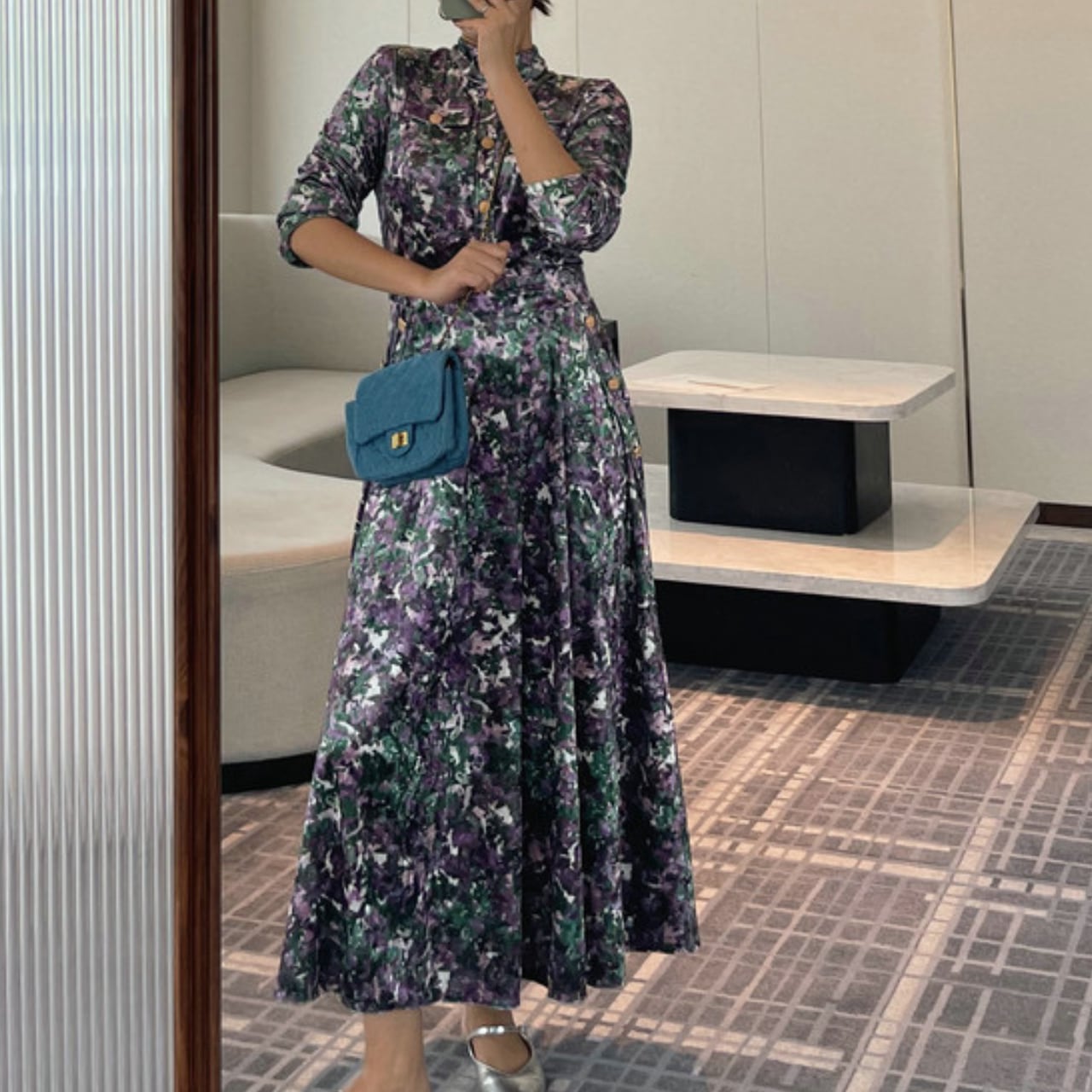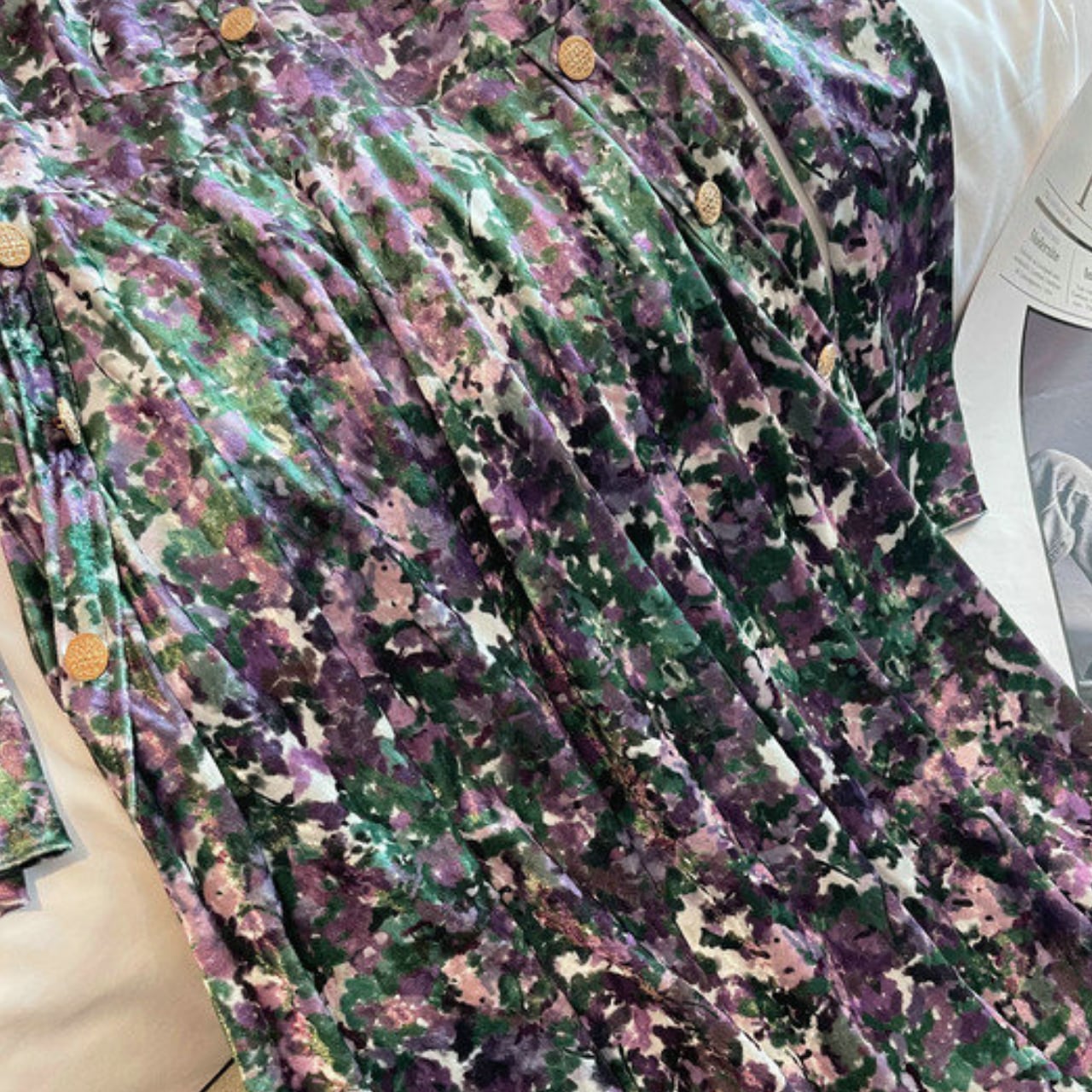 深みのあるパープル、グリーン、ピンクが織りなす繊細なフローラルプリント。まるで印象派の絵画のような色彩豊かなパターンが、着る人を上品で知的な印象に導きます。