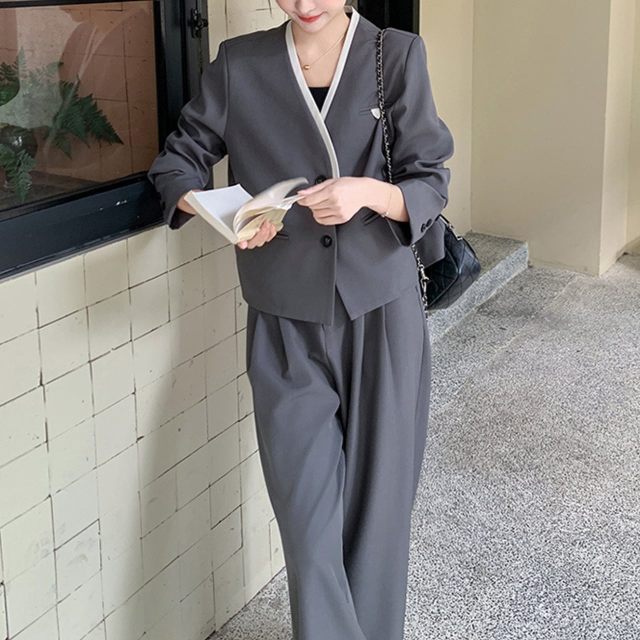 襟元やボタンラインにさりげないコントラストカラーをあしらった知的なデザインで、単調になりがちなセットアップに、計算されたアクセントが効いた大人のモダンスタイルです。