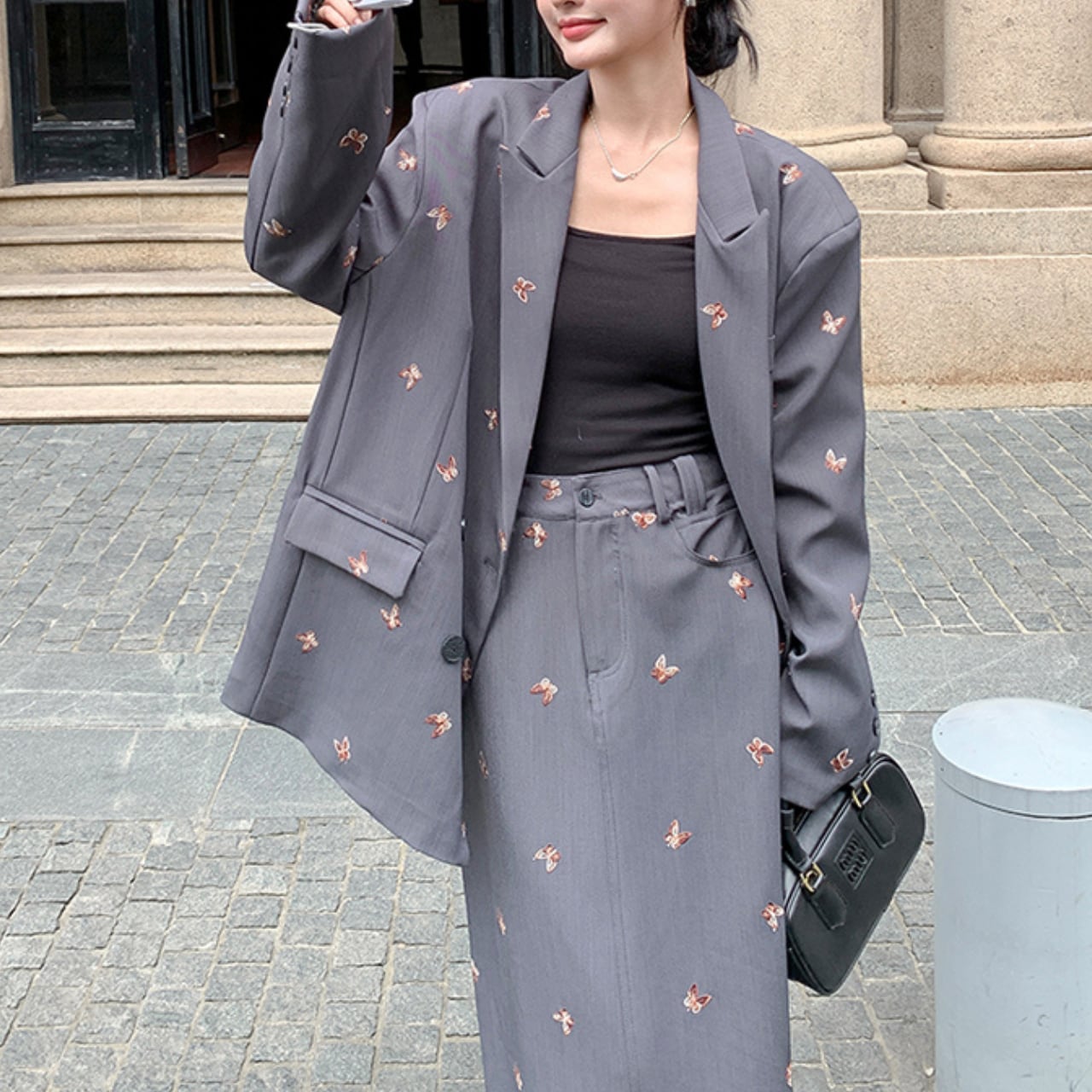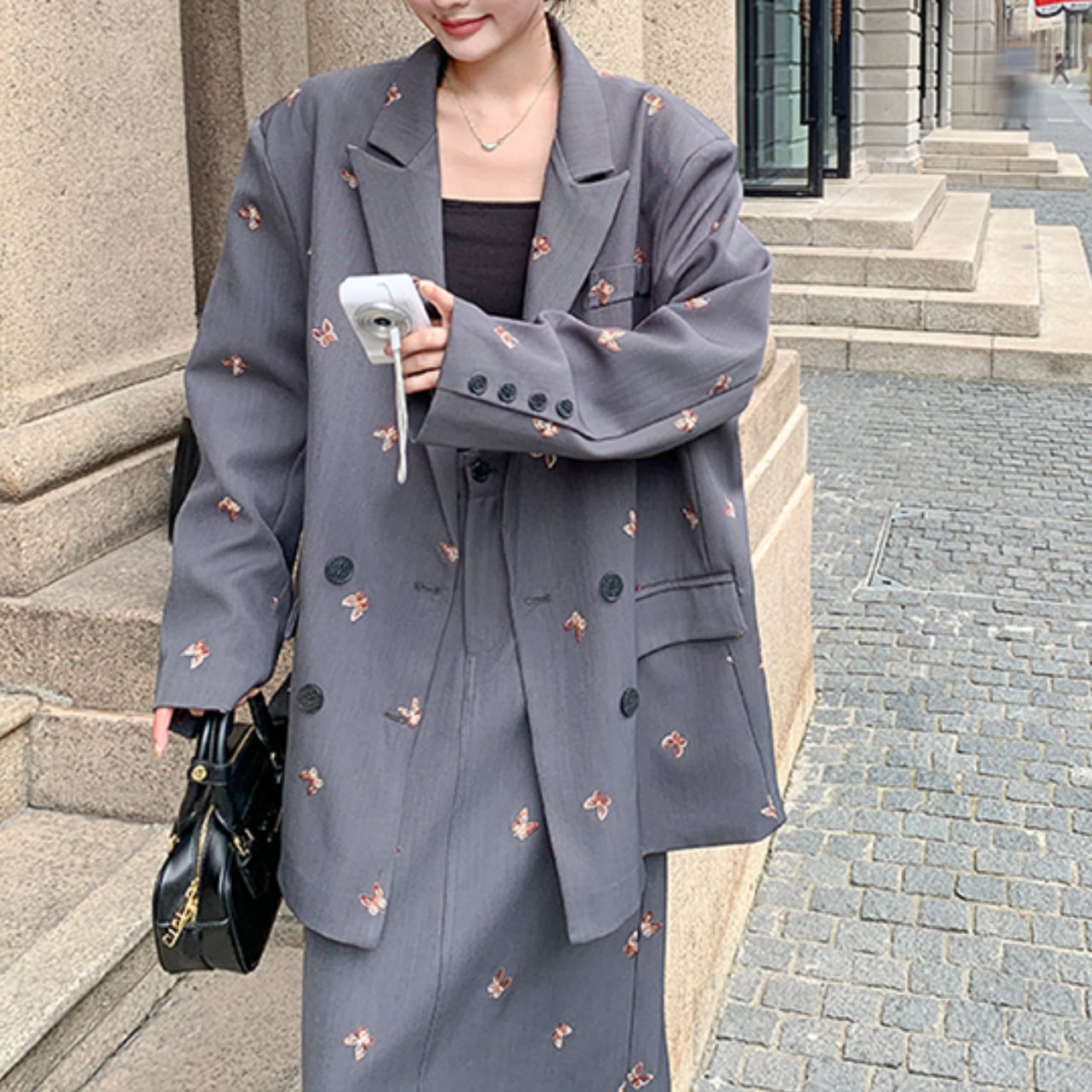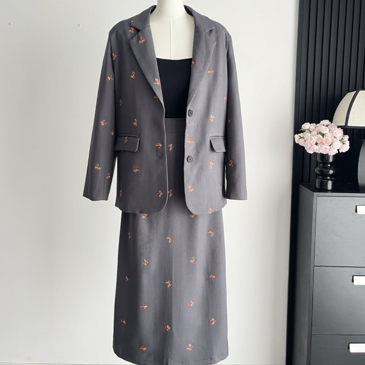 グレージュカラーの上質な生地に、蝶の刺繍が全体に散りばめられたジャケット&スカートのセットアイテム。