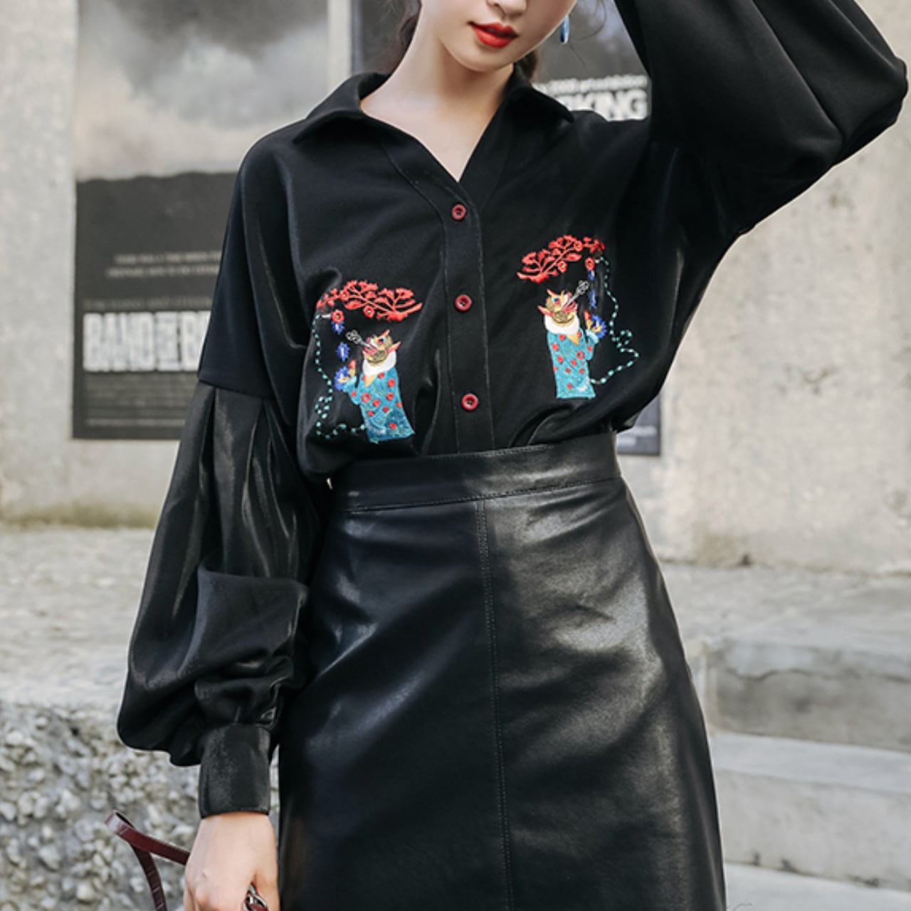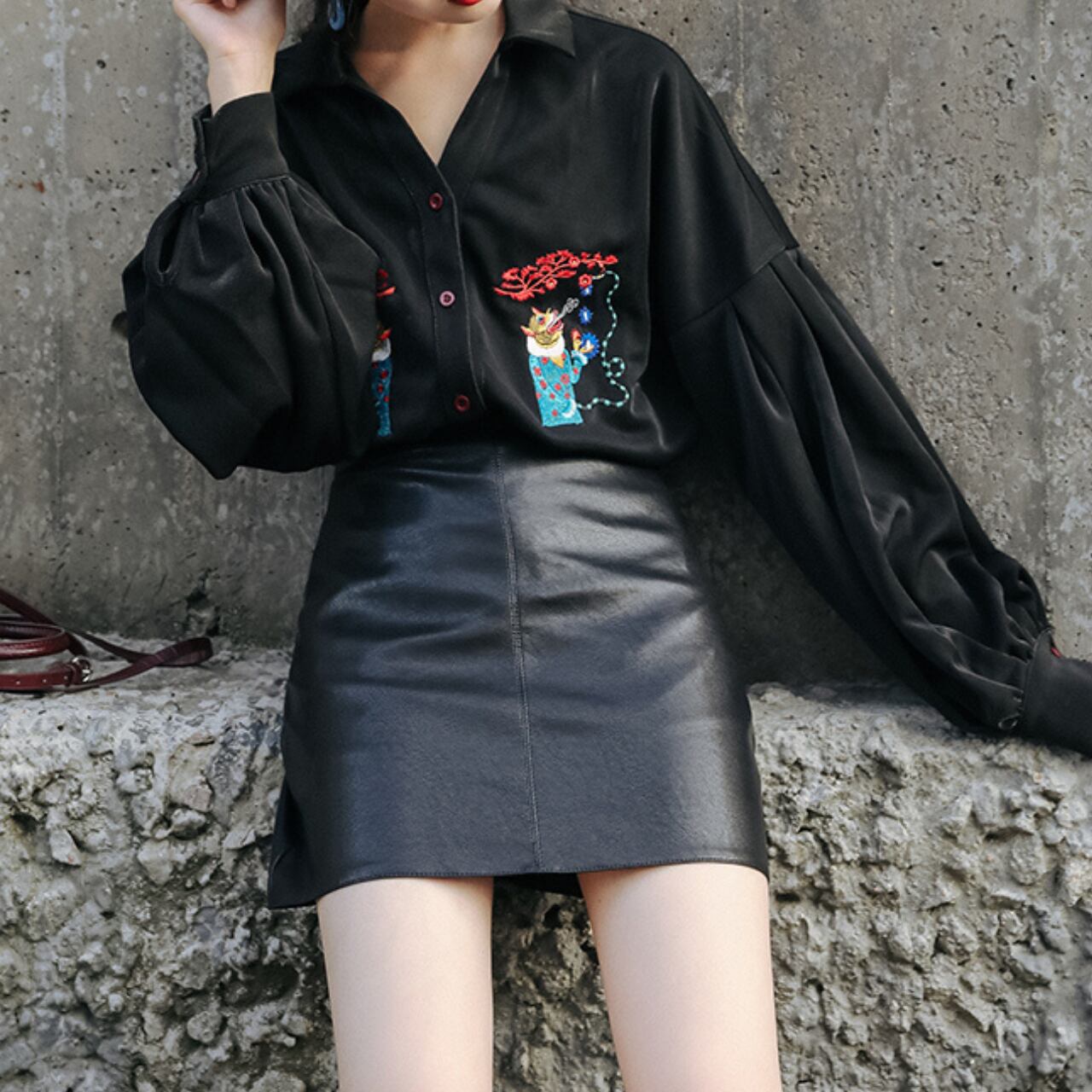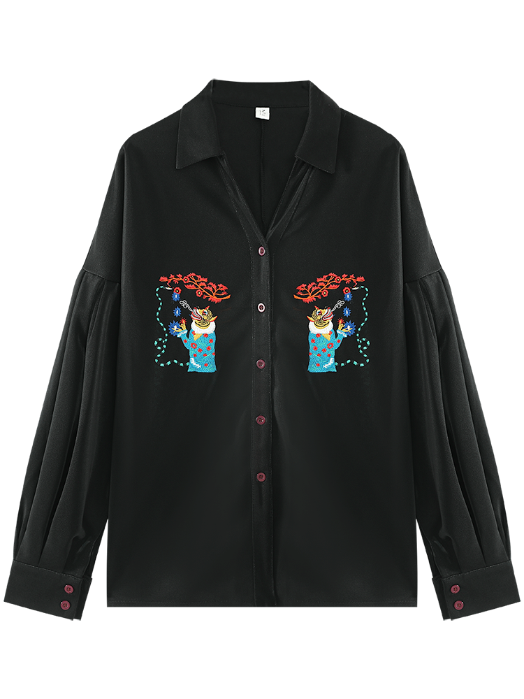 ブラックベースに胸元の繊細な刺繍がアクセントになったパフスリーブシャツ。