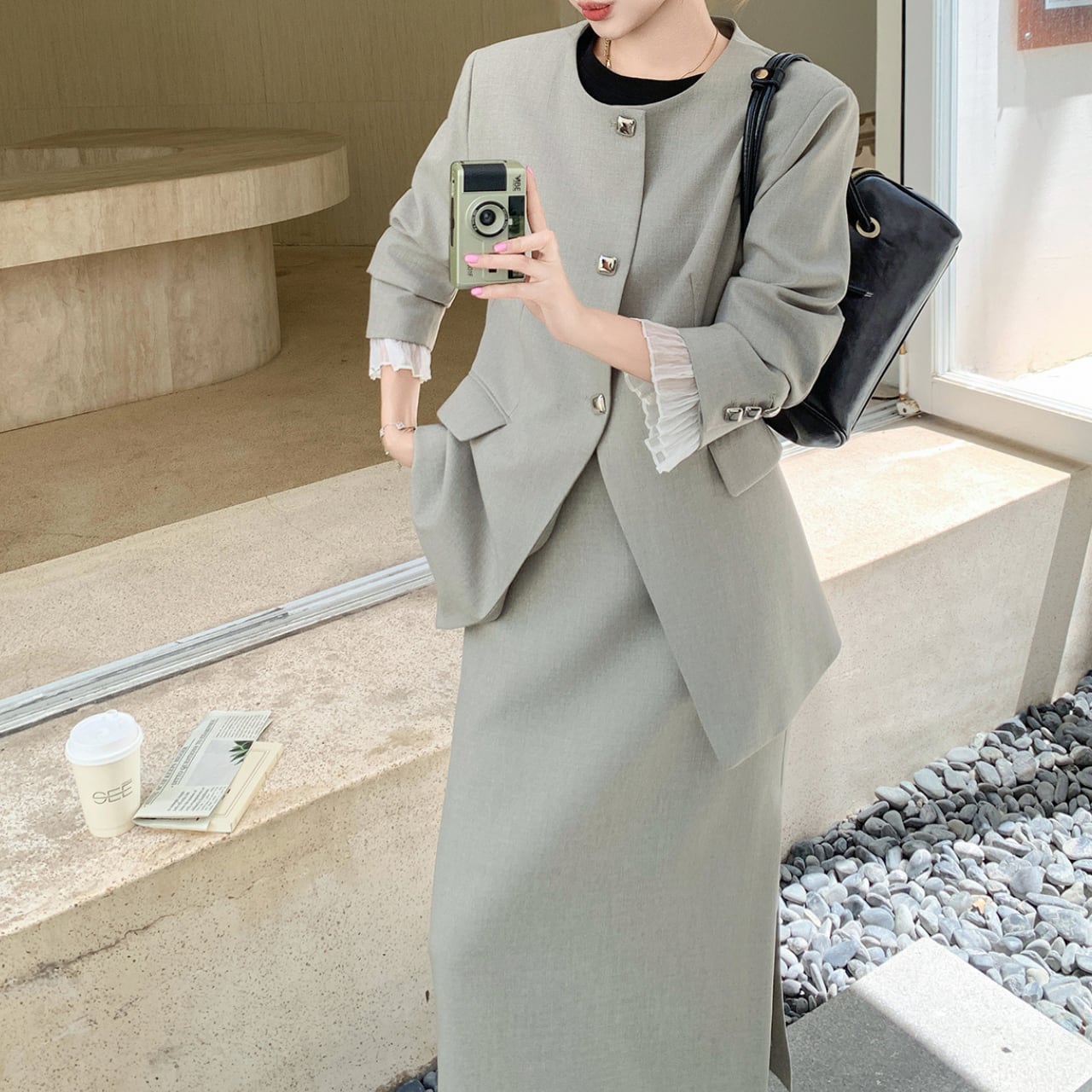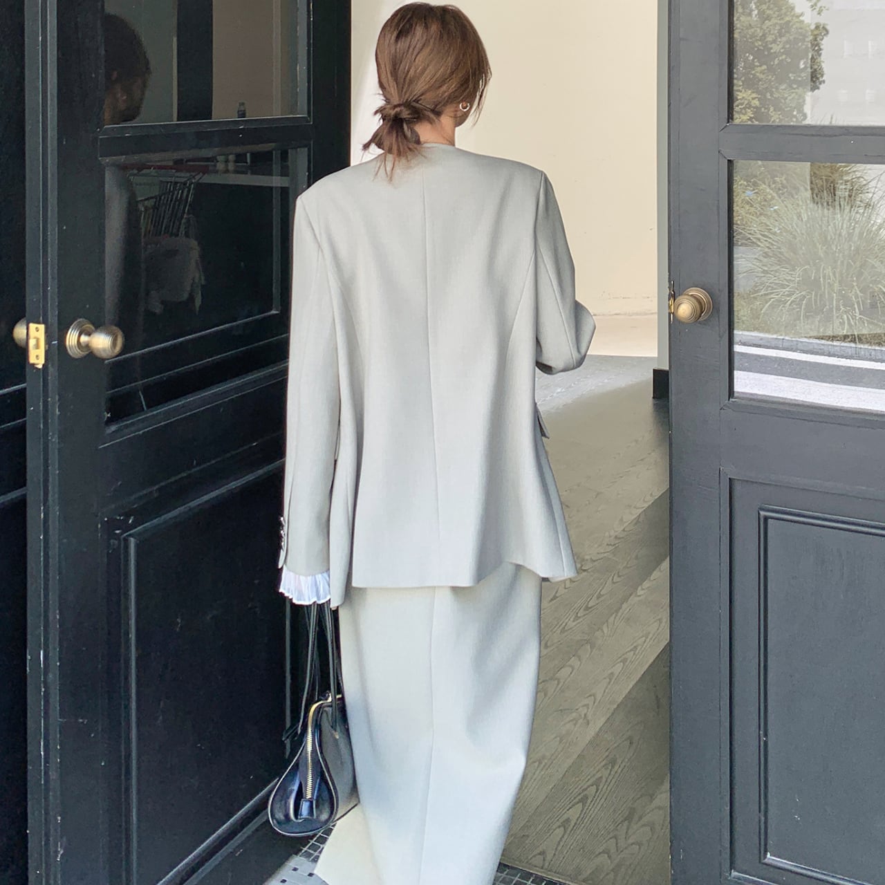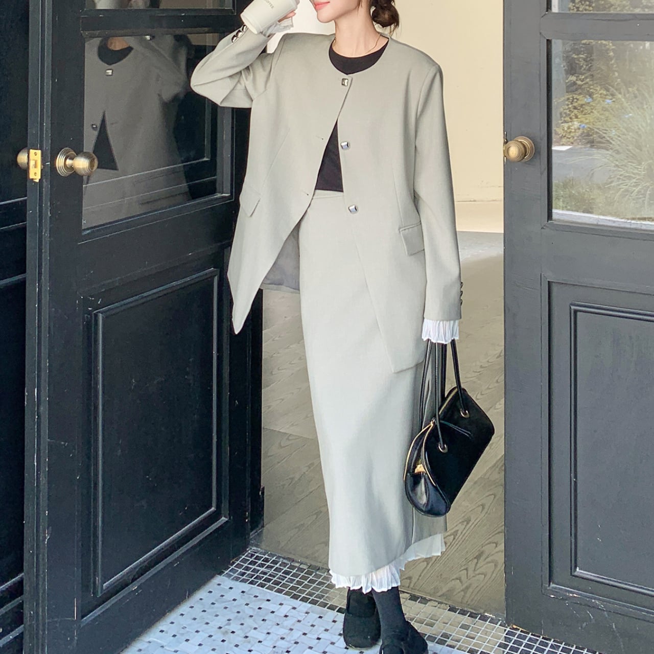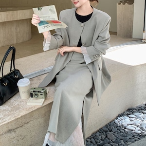 シンプルなグレーカラーをベースに、繊細なレースパッチワークが施されたジャケットとスカートのセットアップ。