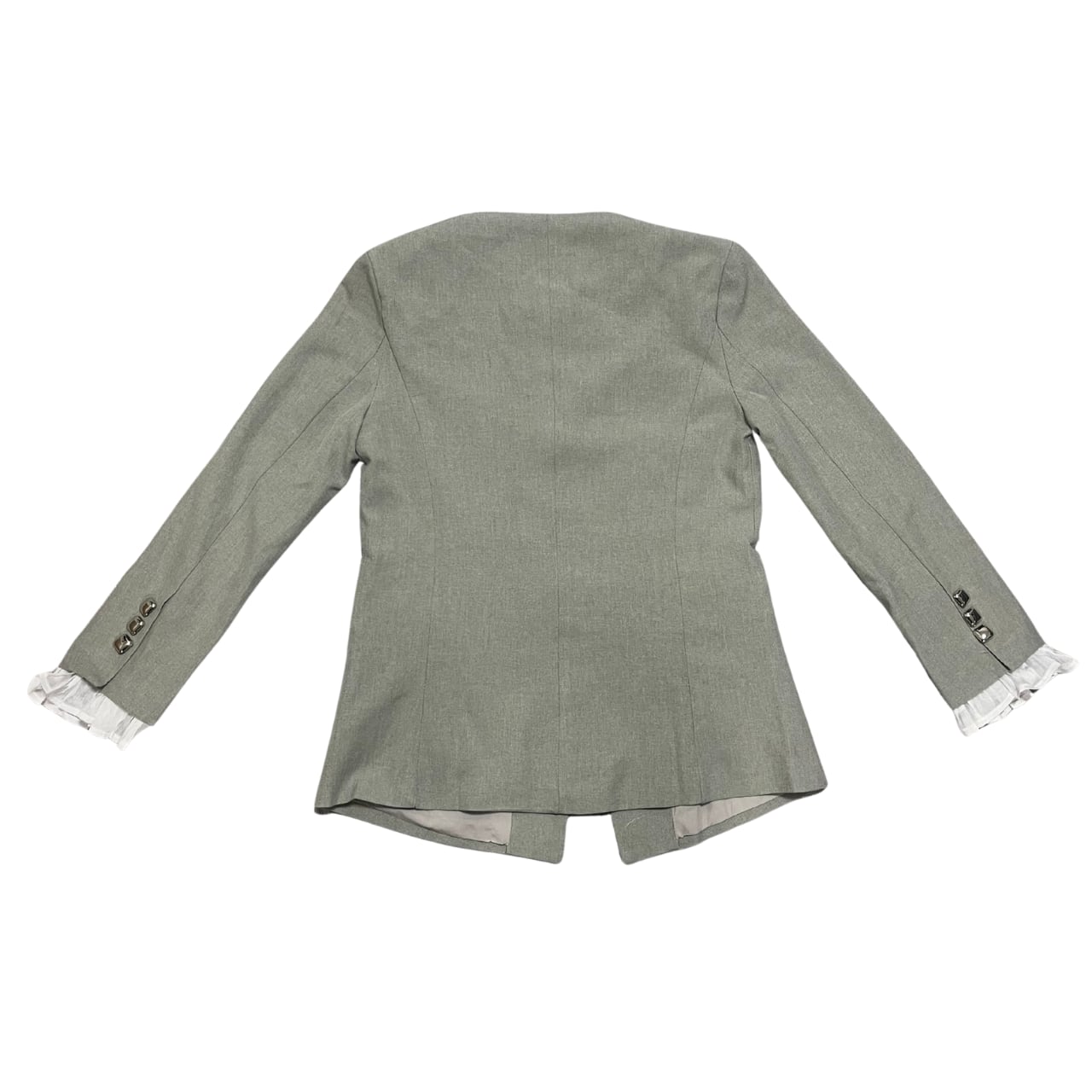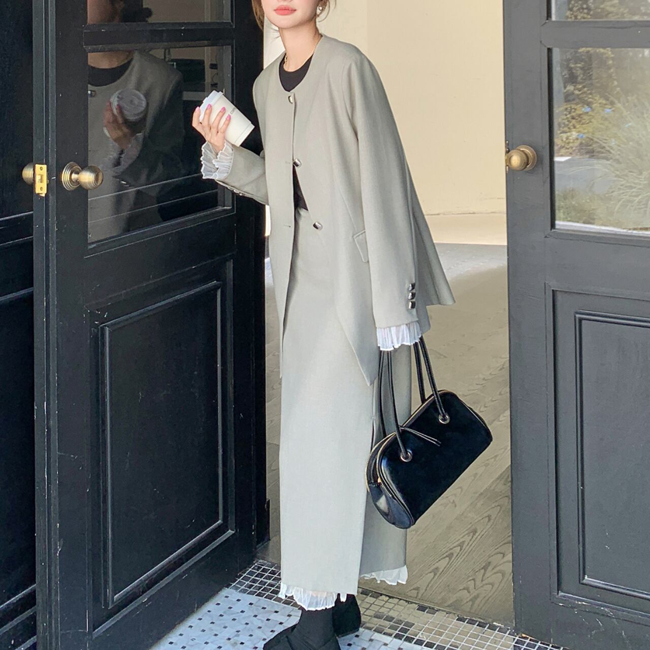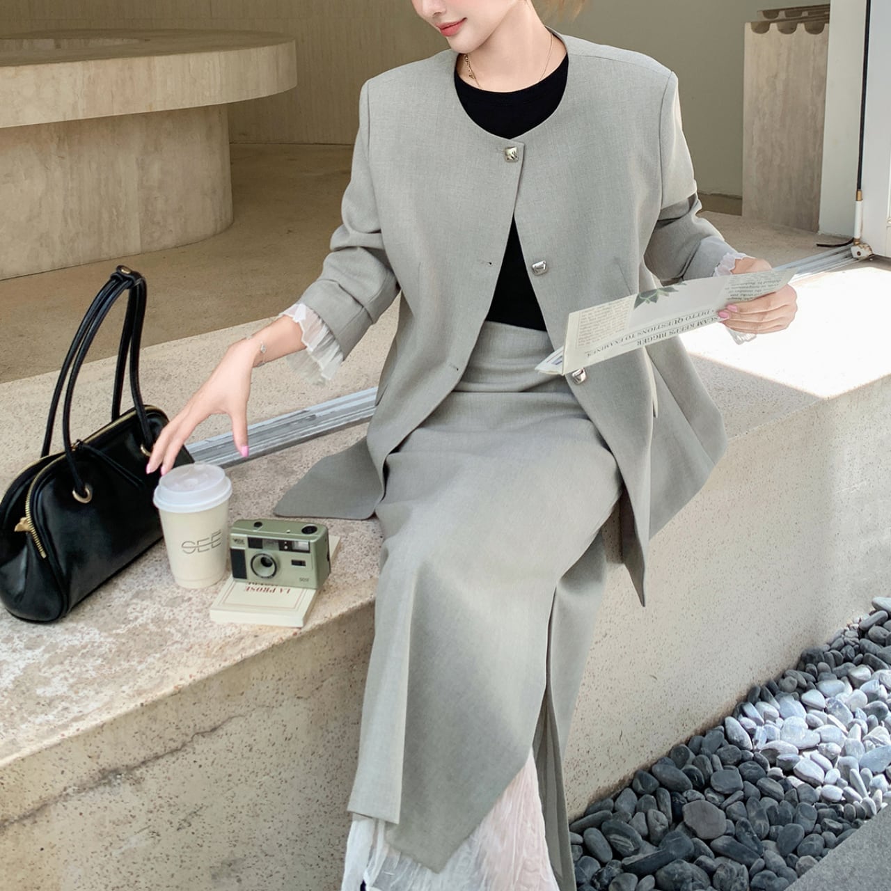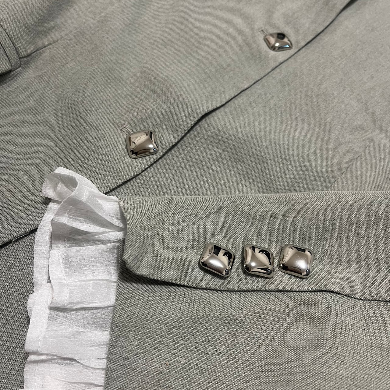 シンプルなグレーカラーをベースに、繊細なレースパッチワークが施されたジャケットとスカートのセットアップ。