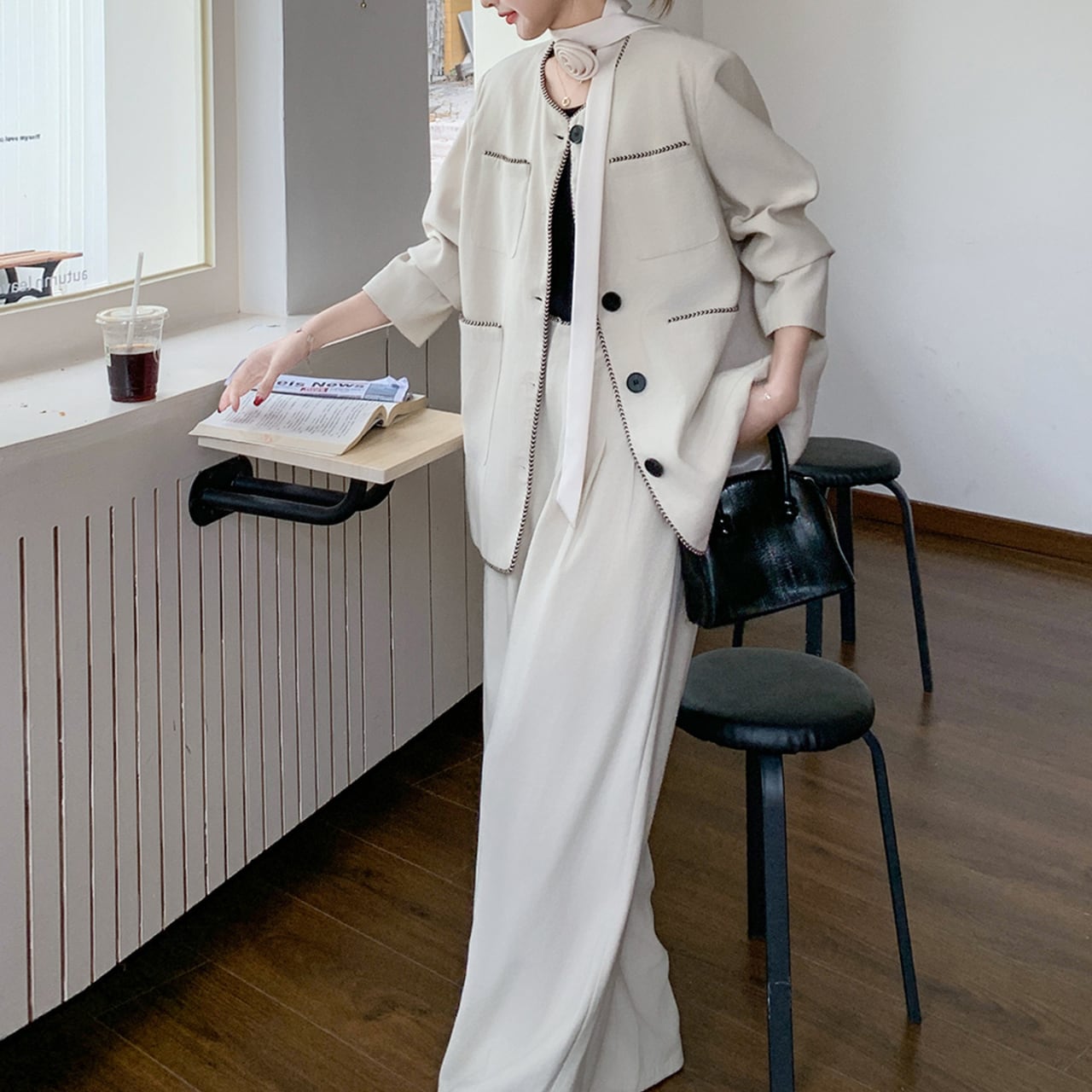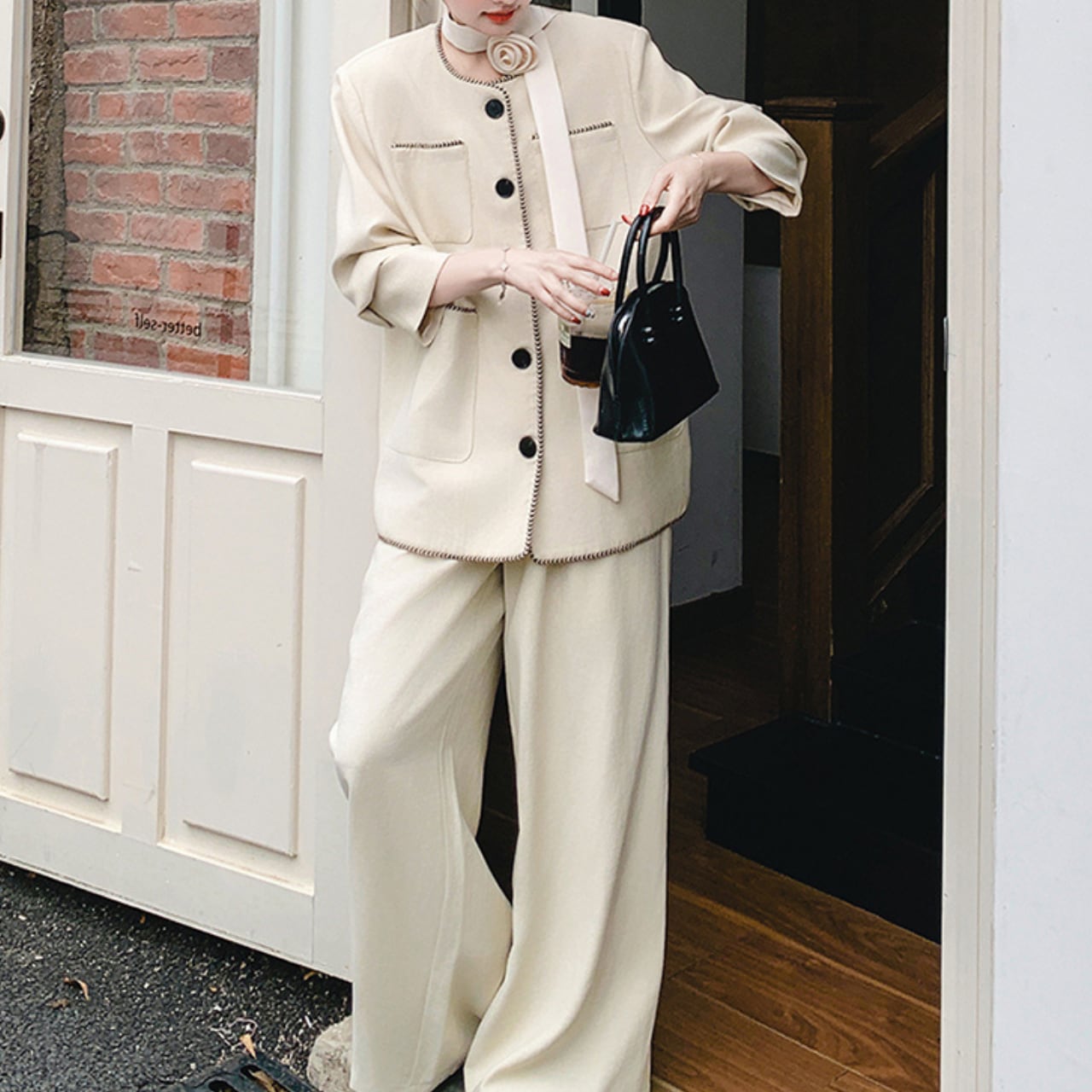 ノーカラージャケット&ワイドレッグパンツのセットアップ。