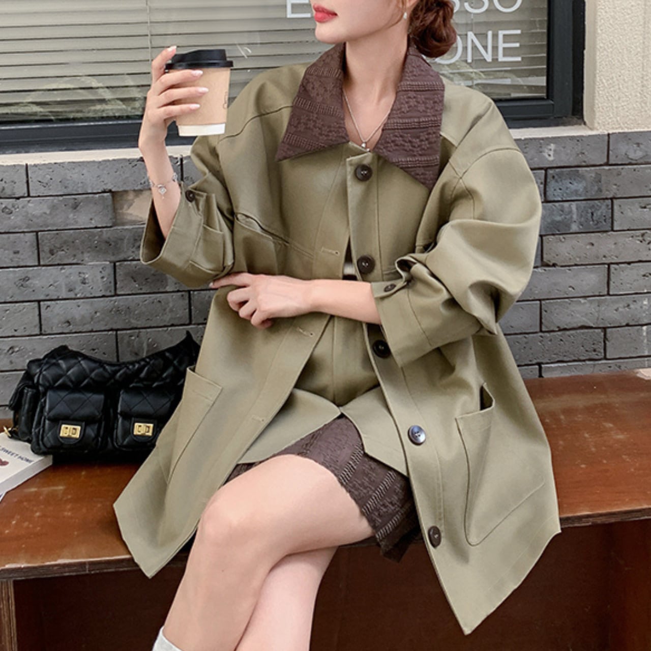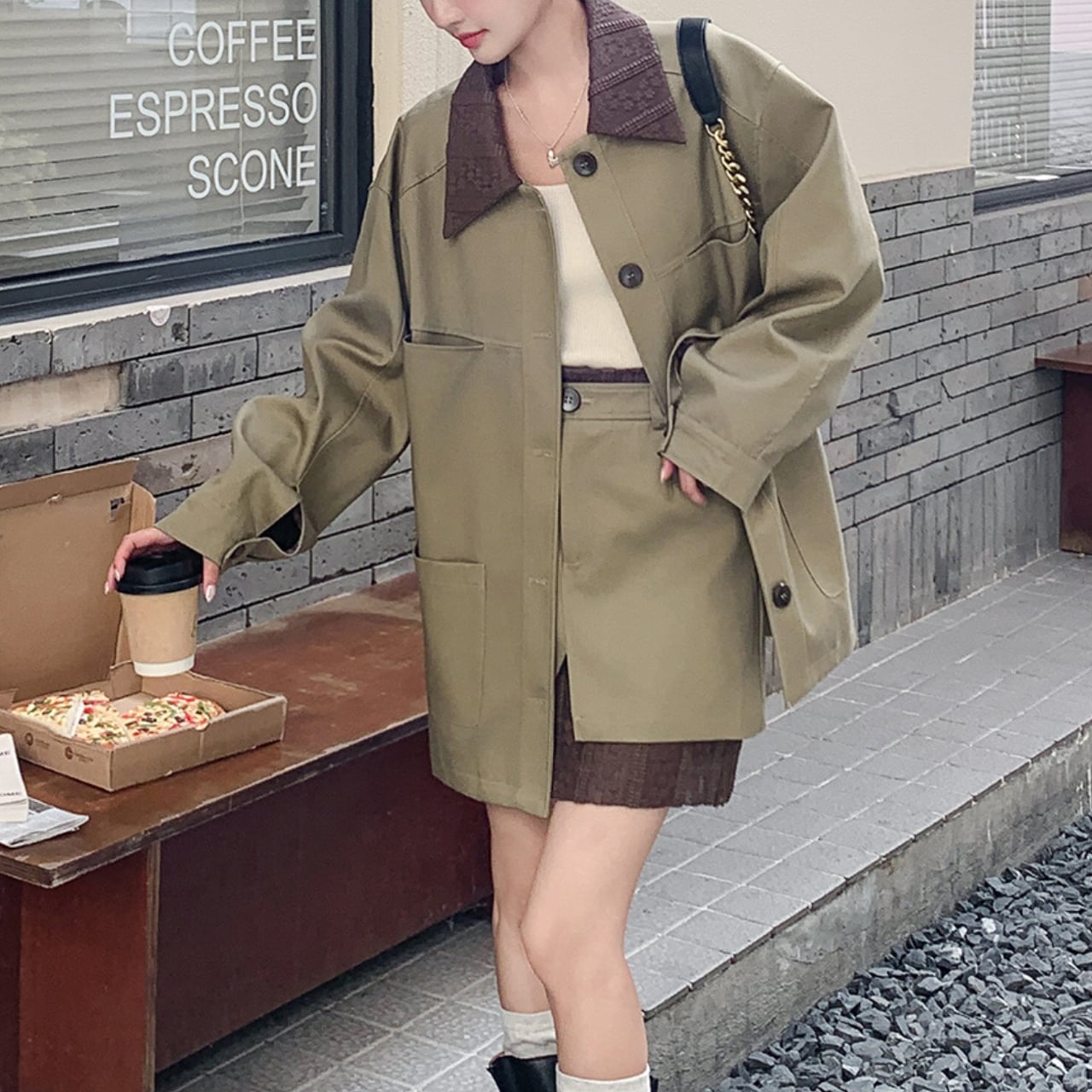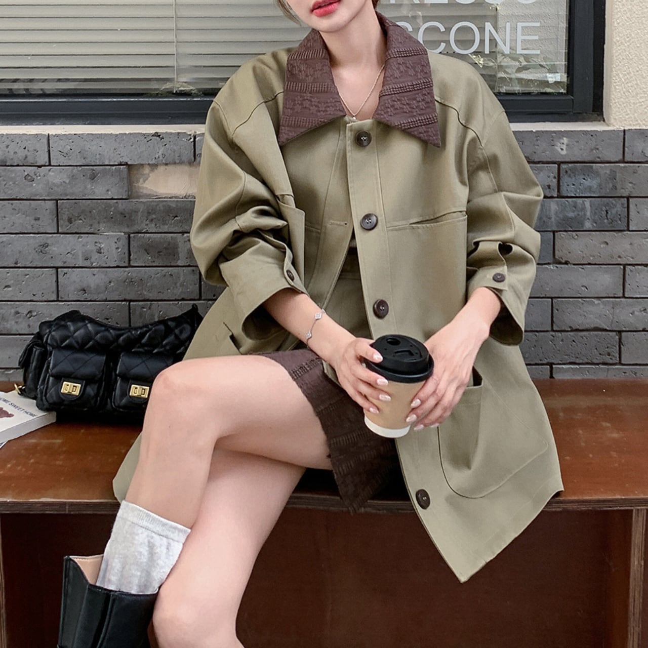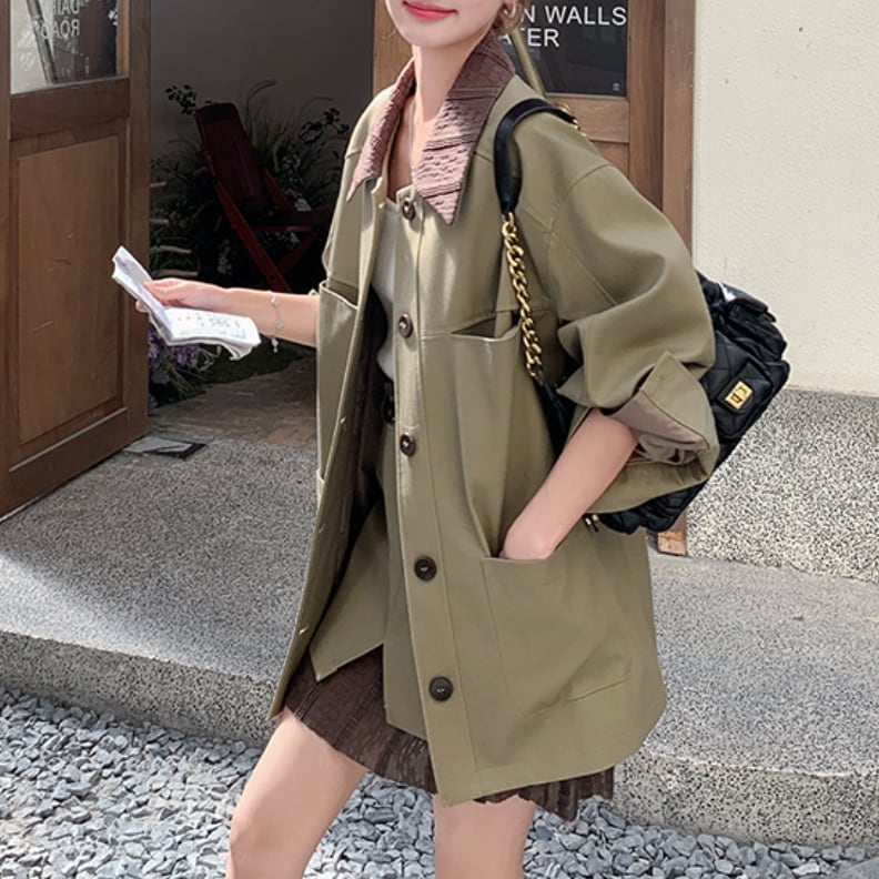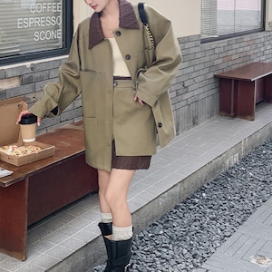 カーキ×ブラウンのコントラストが印象的な、ジャケット&ショートスカートのセットアップ。