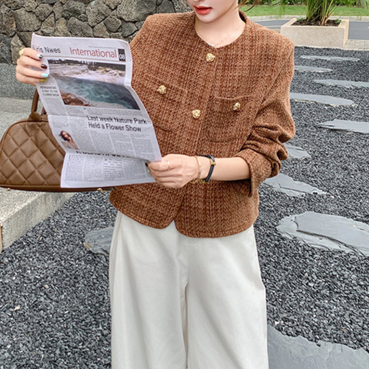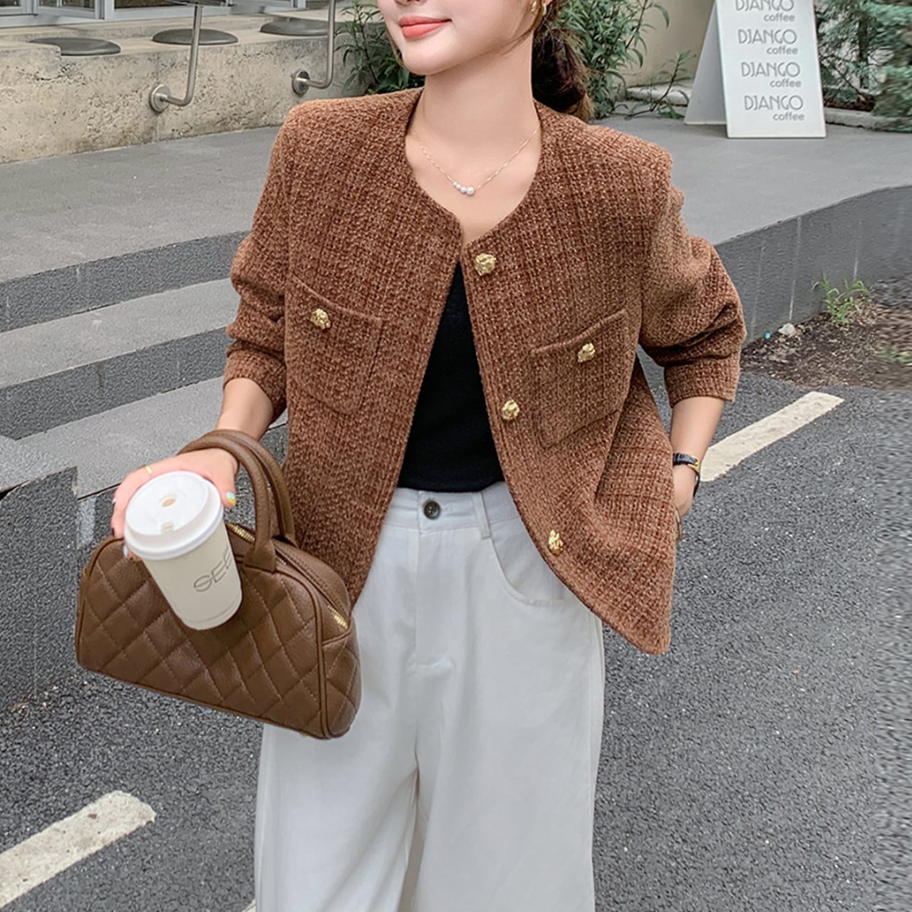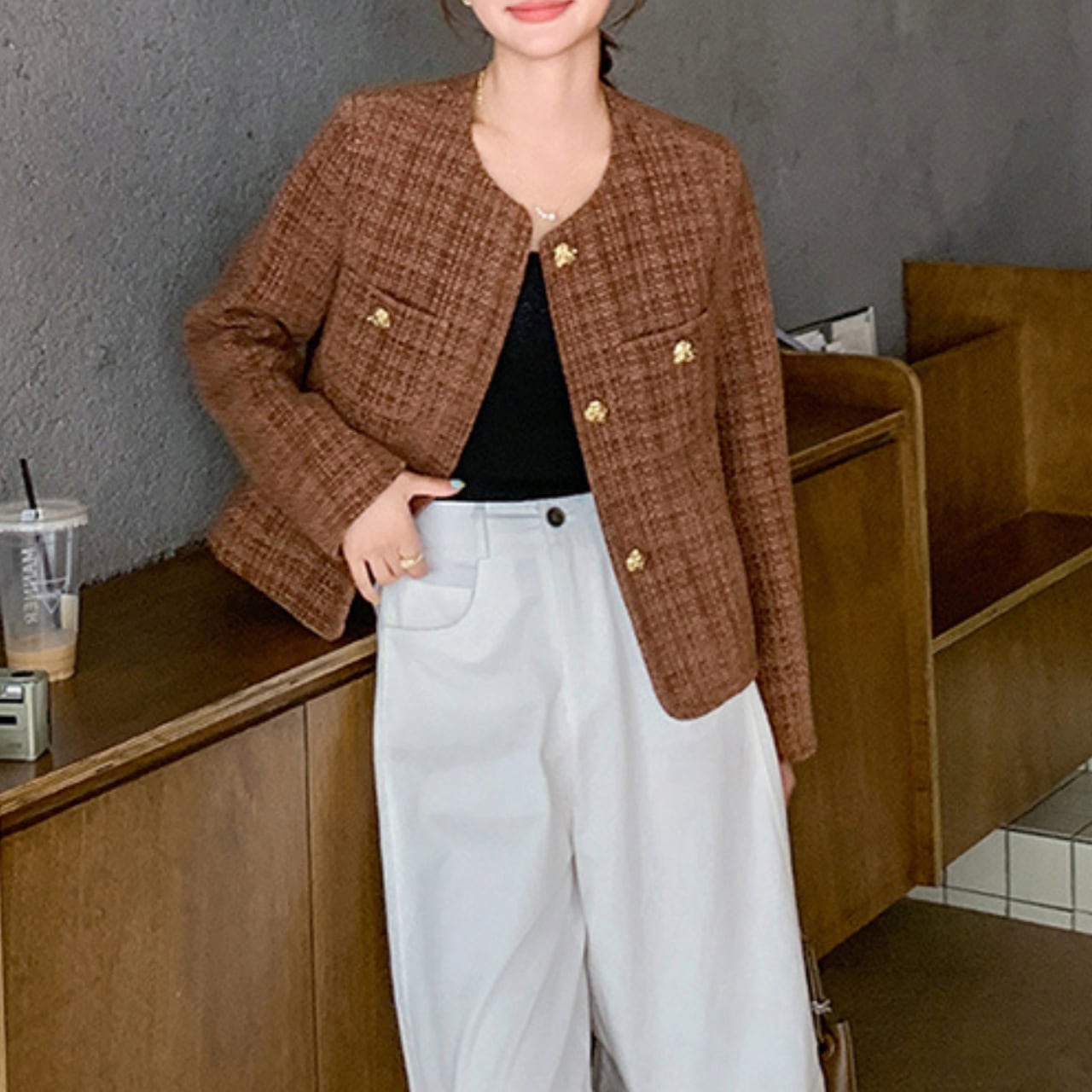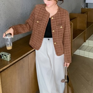 〜パリジェンヌ風エレガンス〜 格式あるチェック柄を現代的にアレンジした、洗練されたノーカラージャケット。 上品なブラウンベースの配色が、知的で落ち着いた印象を演出します。 ゴールドボタンが織りなすクラシカルな美しさと、ノーカラーデザインのモダンさが、大人の女性にふさわしい品格を演出します。 ✔️おすすめのスタイリング ・タートルネックを合わせて、レイヤードスタイルを楽しむ。 ・タイトスカートにヒールを合わせて夜のお出かけコーデ。 ・デニムにスニーカーでカジュアルダウンするのもオススメ! ■カラー ブラウン ■サイズ XS 着丈:50cm 肩幅:34cm 胸囲:96cm 袖丈:56cm S 着丈:51cm 肩幅:35cm 胸囲:100cm 袖丈:57cm M 着丈:52cm 肩幅:36cm 胸囲:104cm 袖丈:58cm L 着丈:53cm 肩幅:37cm 胸囲:108cm 袖丈:59cm XL 着丈:54cm 肩幅:38cm 胸囲:112cm 袖丈:60cm ※採寸方法により、1〜3cmの誤差がある場合がございます。 ■モデル 身長:165cm 体重:46kg Mサイズ着用 ■商品番号 S1663 ・・━━・・━━・・━━・・━━・・━━・・━━・・ 【お届けについて】 当ショップの商品は海外より取り寄せ・発送となりますので、ご入金から2〜3週間前後での発送を予定しております。 【お支払い方法について】 ・クレジットカード決済(VISA/Master/JCB/AMERICAN EXPRESS) ・キャリア決済(docomo/au/Softbank/Y!mobile) ・あと払い Pay ID決済 【注意事項】 ・商品の在庫切れや生産中止、生産遅延が発生する場合がありますので、ご了承ください。 ・こちらは輸入品であり、日本製品とは検品基準が異なることがあります。新品未使用品でも、わずかな汚れや傷が見受けられることがあります。 ・イメージ違いやサイズ・カラー相違による返品・交換はお断りさせていただきます。 ・お手持ちのスマートフォンやパソコンの環境によって、商品のお色味が異なる場合があります。 ・発送時期によってデザインや素材、細部が変更されることがございます。 ご購入前にこちらをお読みください →https://solemy.base.shop/about ・・━━・・━━・・━━・・━━・・━━・・━━・・