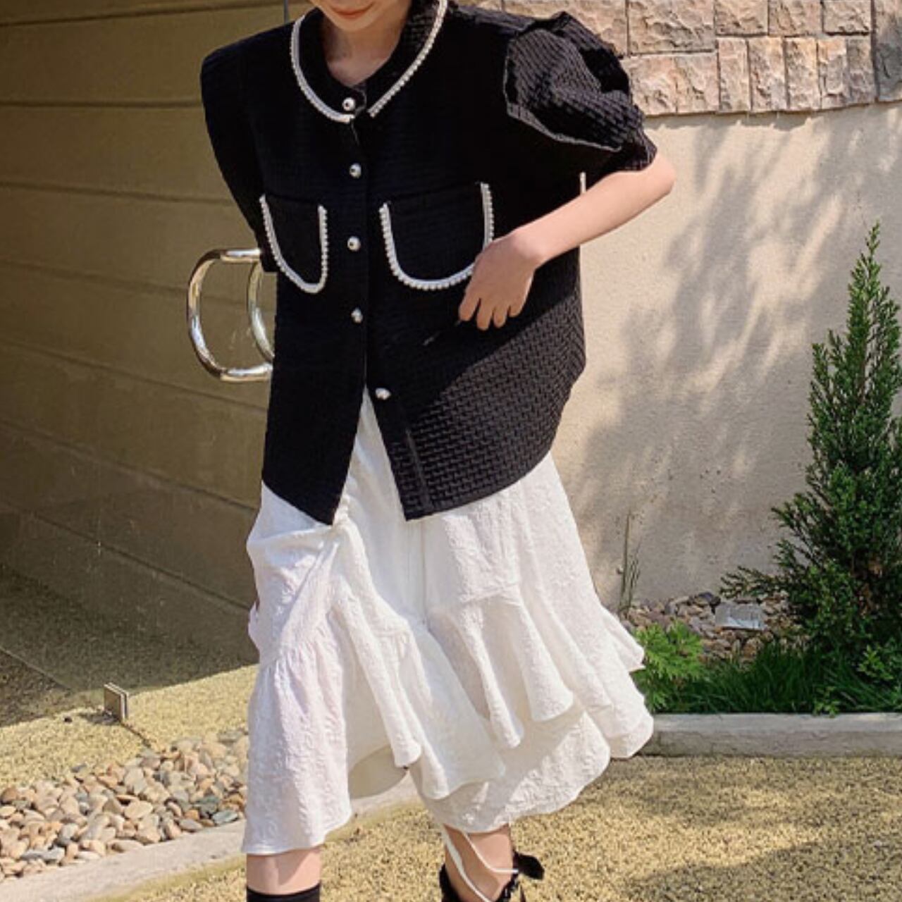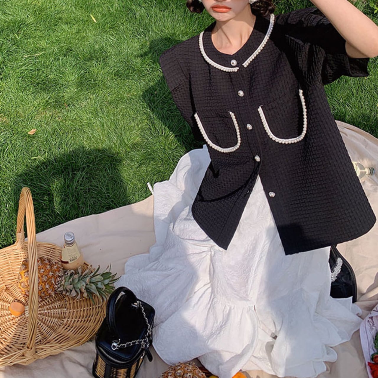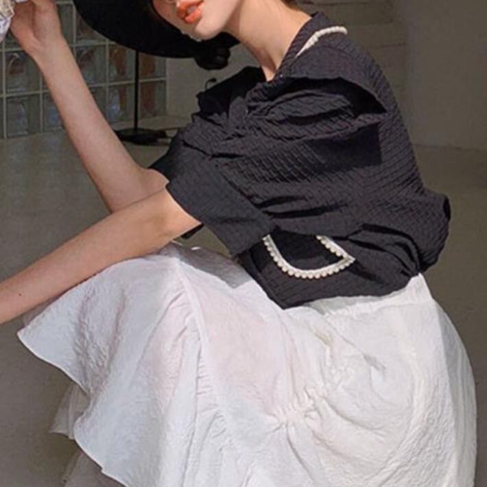 ブラックベースに映える白のパイピングが、モダンでエレガントな印象を演出します。
