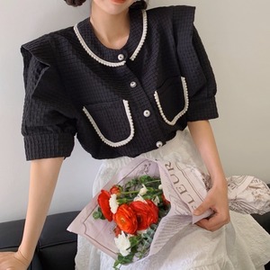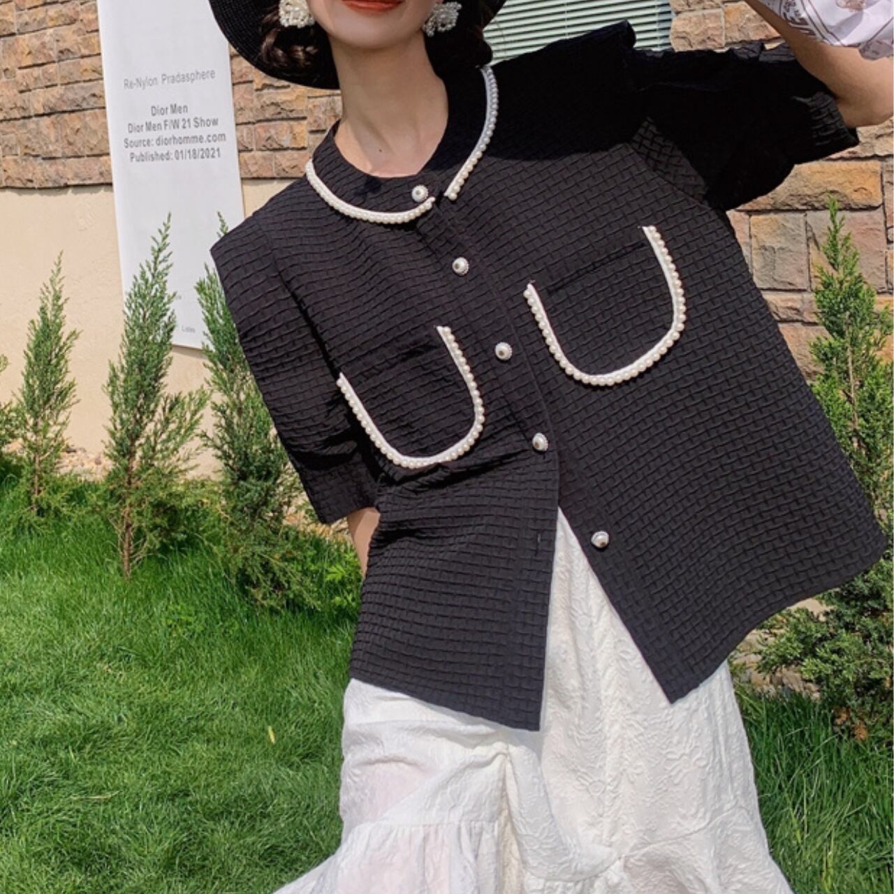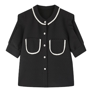 丸襟の上品なネックラインが顔周りをすっきりと見せながら、女性らしい優しさも表現。