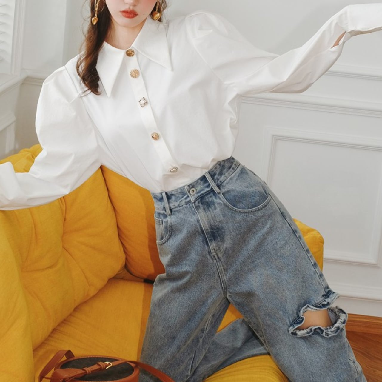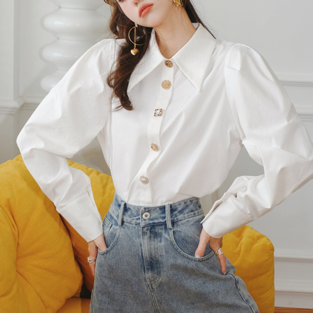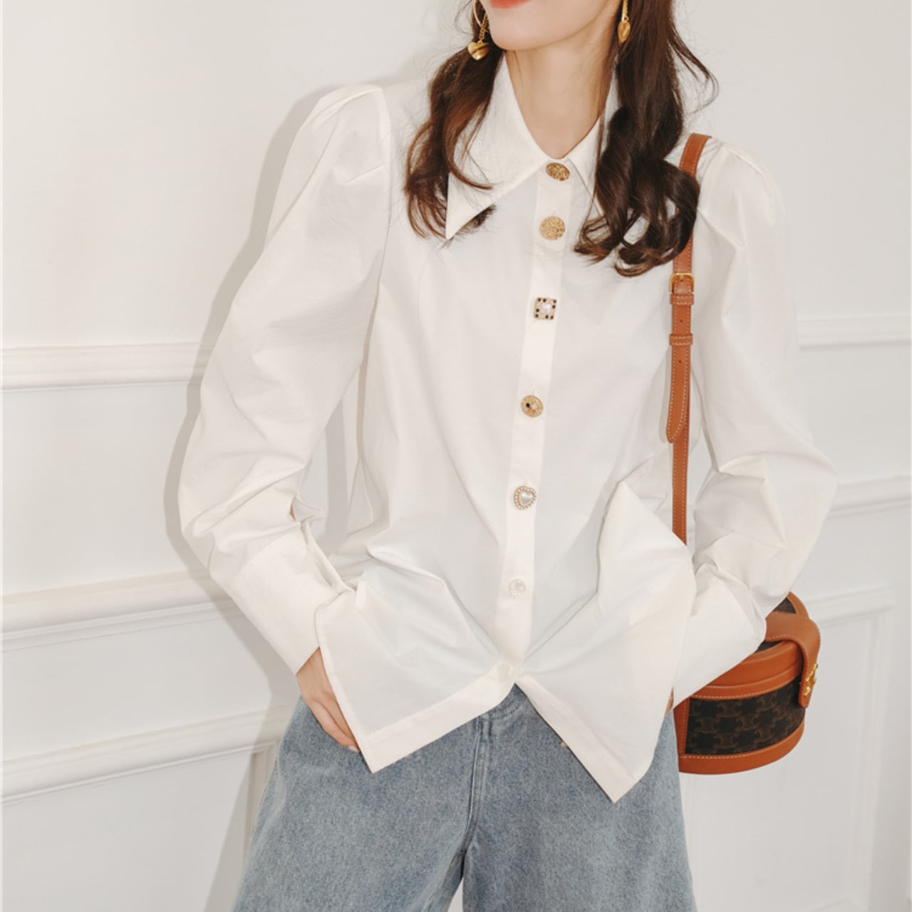フレンチパフスリーブデザインのホワイトシャツ。