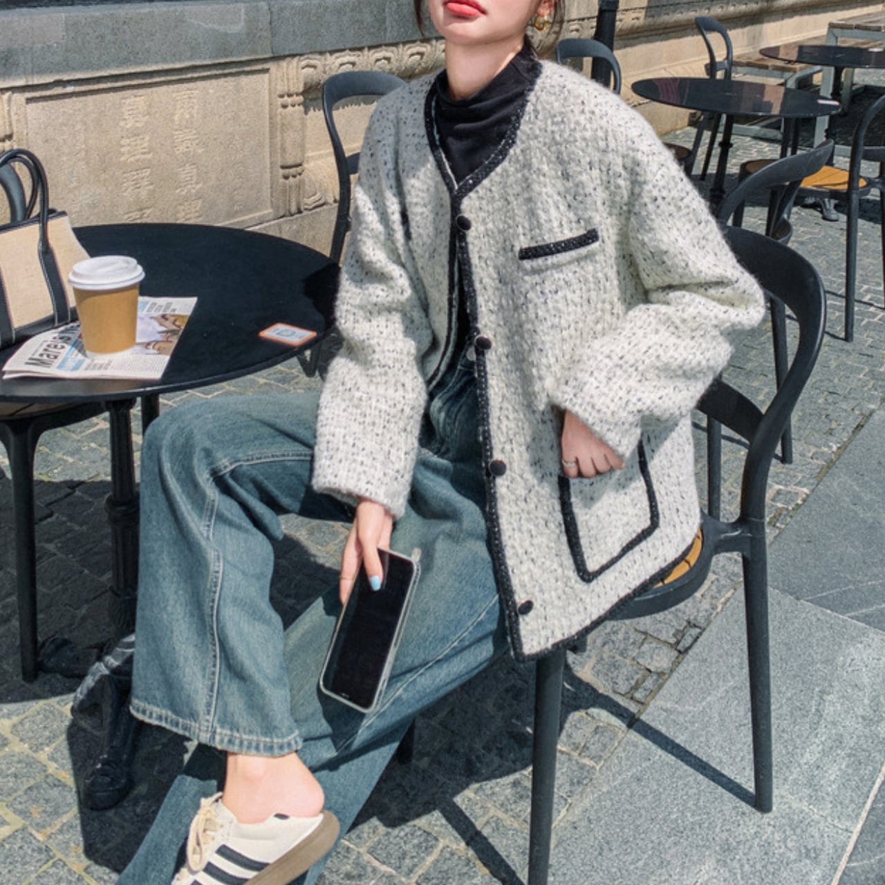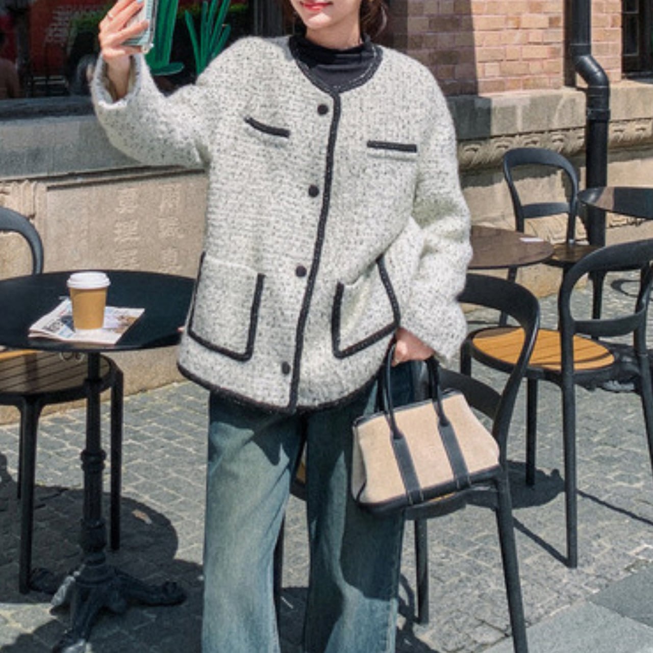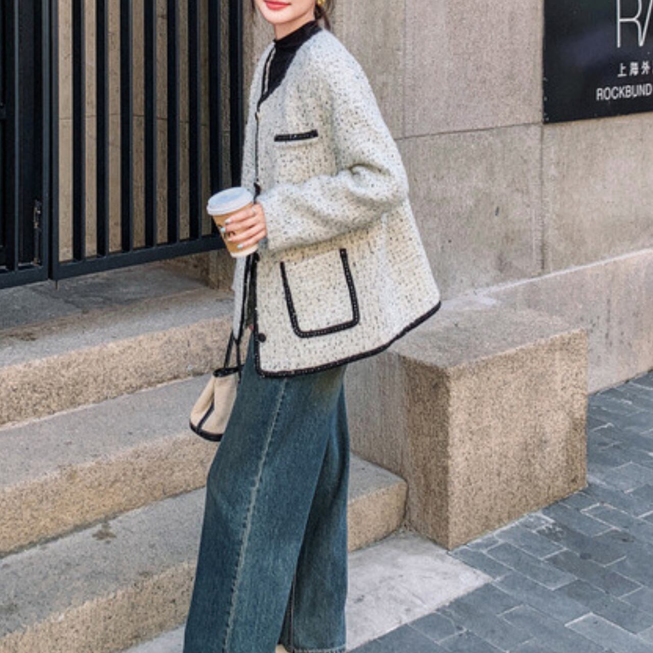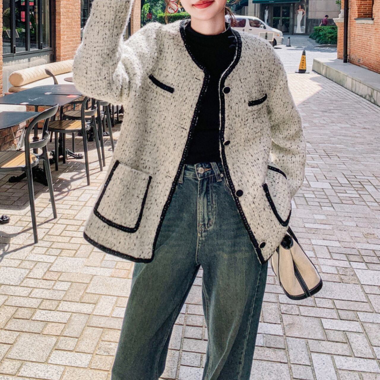 襟元、前立て、ポケット、袖口まで、計算し尽くされたブラックラインが、クラシカルなジャケットをモダンで洗練された印象へと昇華させます。