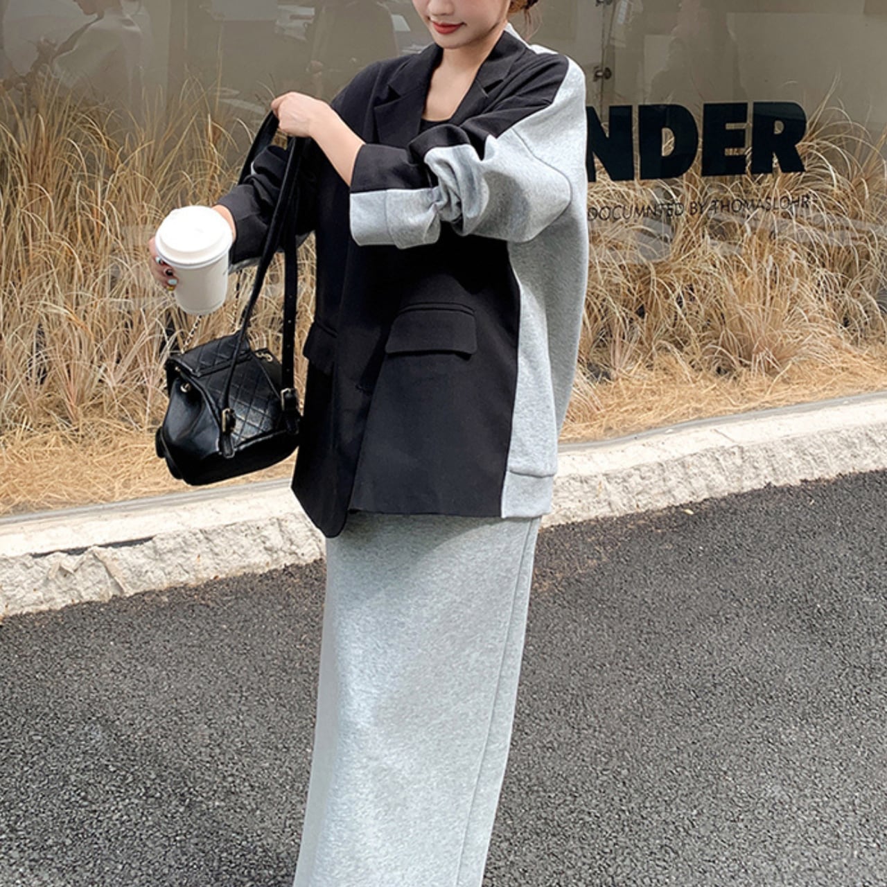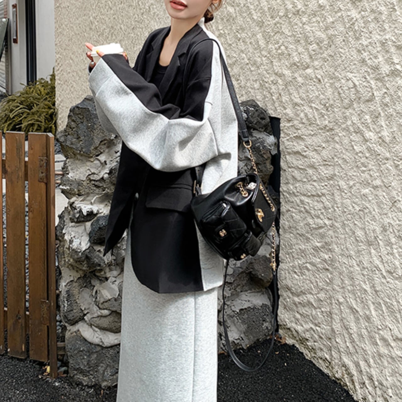 ブラックとグレーのバイカラーデザインが映えるジャケット&ロングスカートのセットアップ。