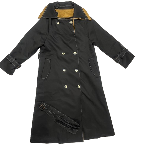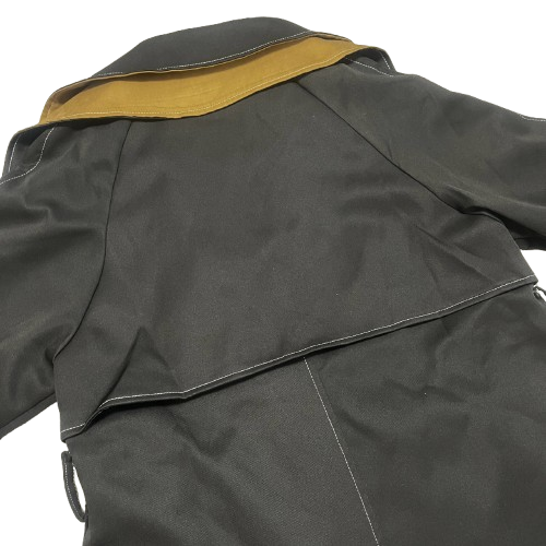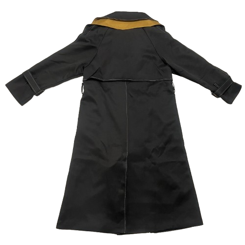 ブラック×マスタードイエローの大胆な配色が目を引く、モードな存在感のバイカラートレンチコート。