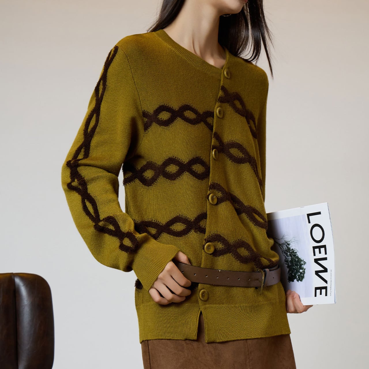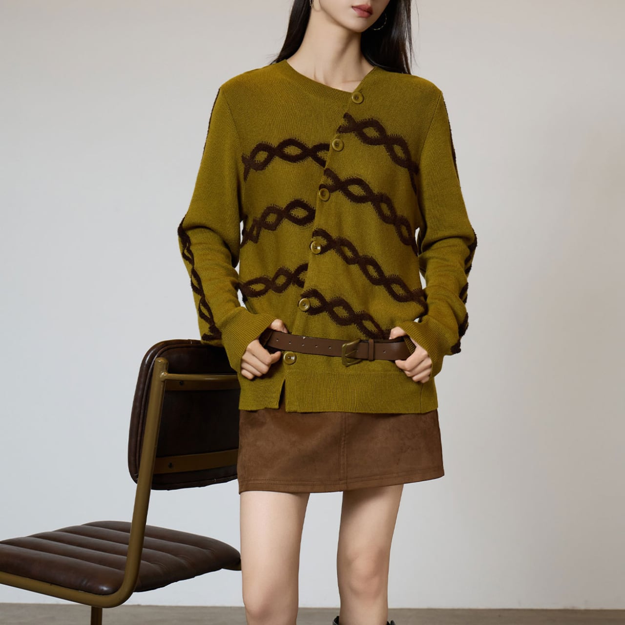 クラシカルな要素と前衛的なデザインが見事に調和した、大人の女性のための特別なカーディガンです。