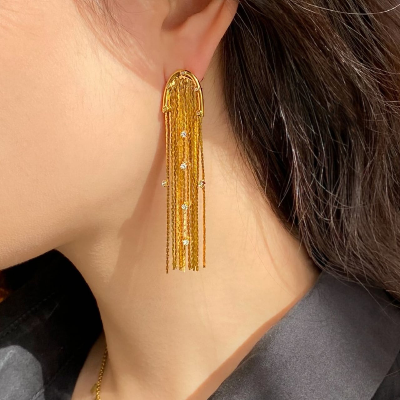 繊細に揺れるチェーンの一本一本に煌めくストーンをあしらい、動くたびに光を纏うような上品さを演出します。