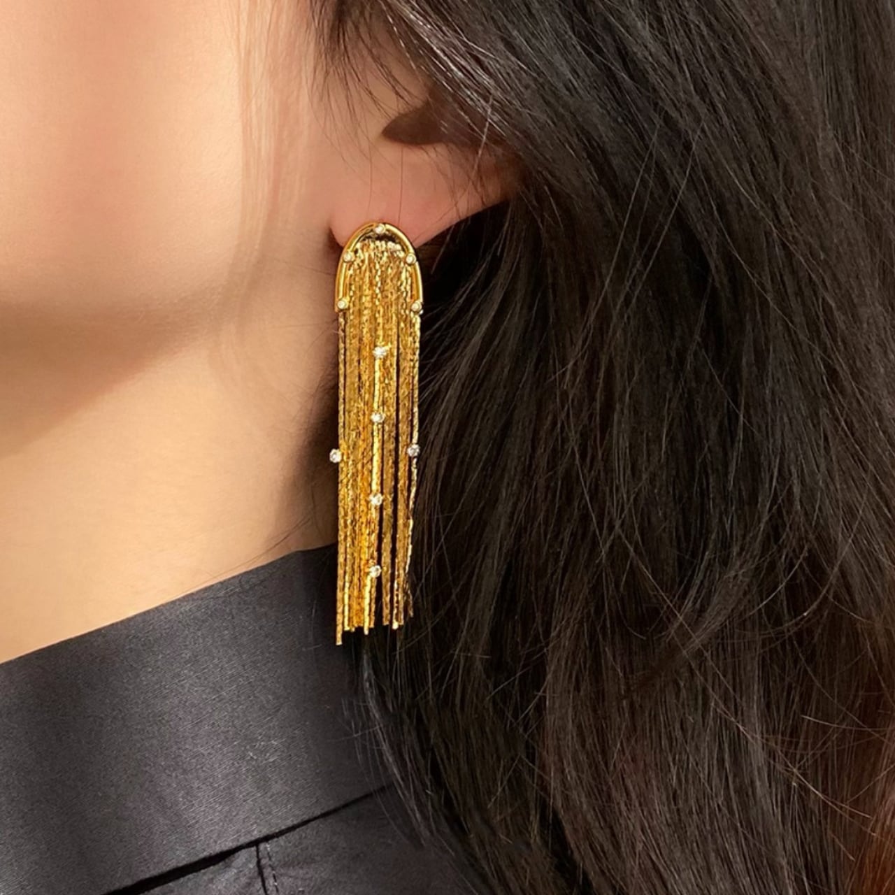 ラグジュアリーな輝きを放つ、ゴールドタッセルピアス。