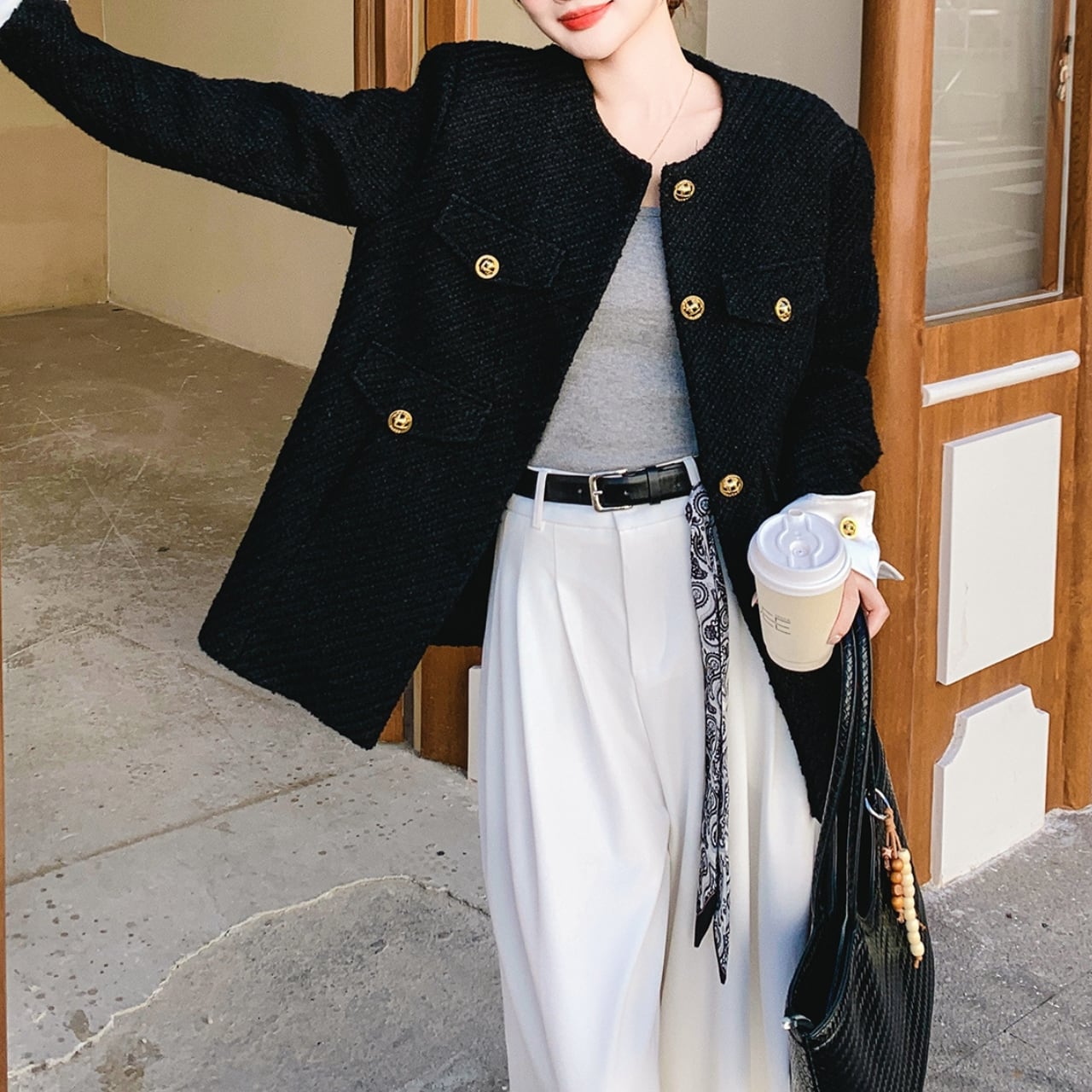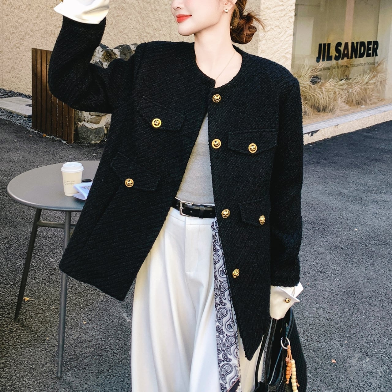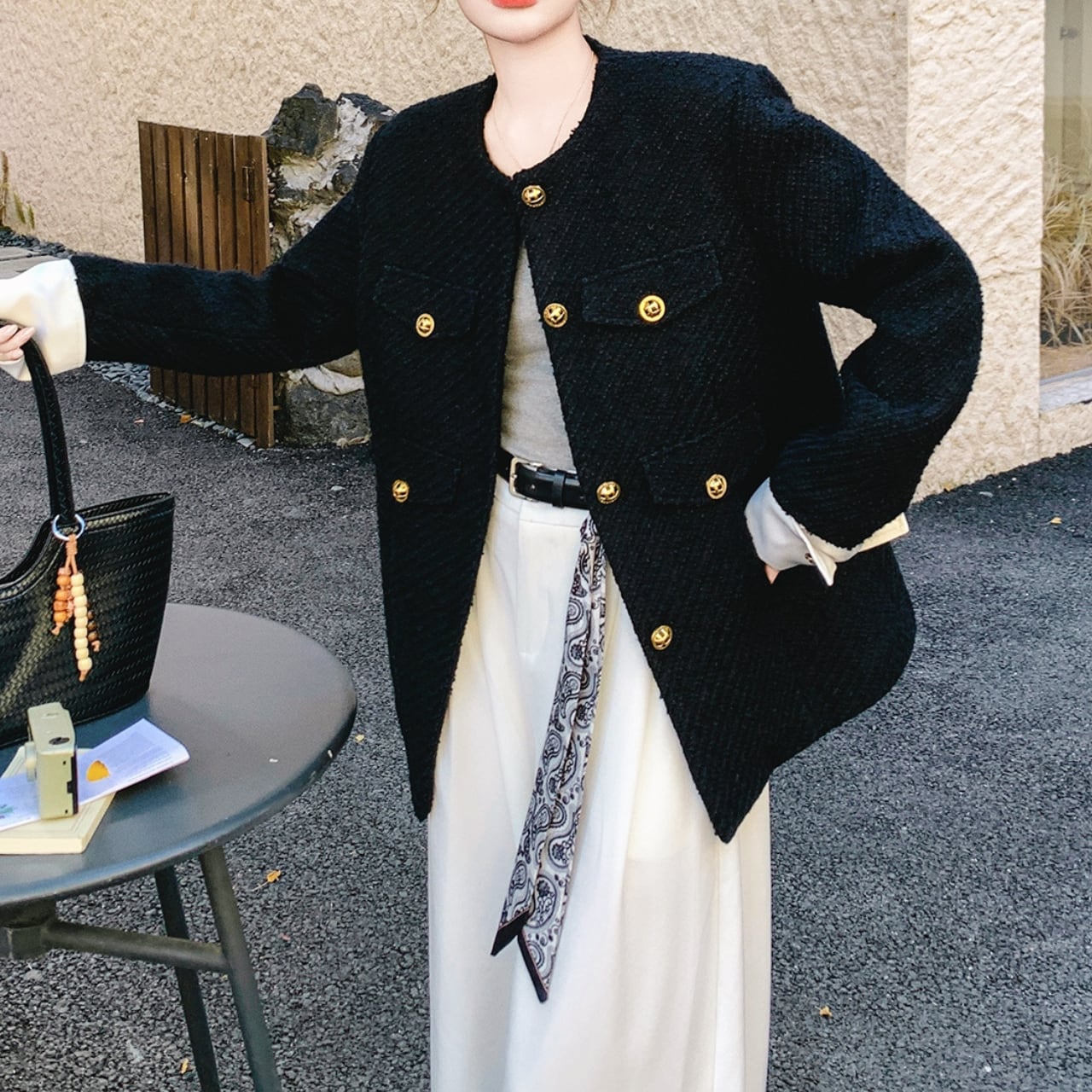 〜クラシックとモダンの、絶妙なバランス〜 ブラックベースに、ホワイトの折り返し袖がアクセントになったノーカラージャケット。 煌めくゴールドボタンが上品な印象に。 すっきりとしたノーカラーデザインで、首元を美しく見せながら、どんなインナーとも相性抜群。 程よい厚みで、肌寒い季節にも快適に過ごせます。 ✔️おすすめのスタイリング ・ホワイトパンツに合わせて、シックカジュアルに。 ・タイトスカート×パンプスで、オフィススタイル。 ・デニム×スニーカーで、週末のリラックスコーデ。 ■カラー ブラック ■サイズ XS 着丈:66cm 肩幅:42cm 胸囲:94cm 袖口:25cm S 着丈:68cm 肩幅:43cm 胸囲:98cm 袖口:26cm M 着丈:70cm 肩幅:44cm 胸囲:102cm 袖口:27cm L 着丈:72cm 肩幅:45cm 胸囲:106cm 袖口:28cm XL 着丈:73cm 肩幅:46cm 胸囲:110cm 袖口:29cm ■モデル 身長:165cm 体重:46kg Mサイズ着用 ■商品番号 S1714 ・・━━・・━━・・━━・・━━・・━━・・━━・・ 【お届けについて】 当ショップの商品は海外より取り寄せ・発送となりますので、ご入金から2〜3週間前後での発送を予定しております。 【お支払い方法について】 ・クレジットカード決済(VISA/Master/JCB/AMERICAN EXPRESS) ・キャリア決済(docomo/au/Softbank/Y!mobile) ・あと払い Pay ID決済 【注意事項】 ・商品の在庫切れや生産中止、生産遅延が発生する場合がありますので、ご了承ください。 ・こちらは輸入品であり、日本製品とは検品基準が異なることがあります。新品未使用品でも、わずかな汚れや傷が見受けられることがあります。 ・イメージ違いやサイズ・カラー相違による返品・交換はお断りさせていただきます。 ・お手持ちのスマートフォンやパソコンの環境によって、商品のお色味が異なる場合があります。 ・発送時期によってデザインや素材、細部が変更されることがございます。 ご購入前にこちらをお読みください →https://solemy.base.shop/about ・・━━・・━━・・━━・・━━・・━━・・━━・・