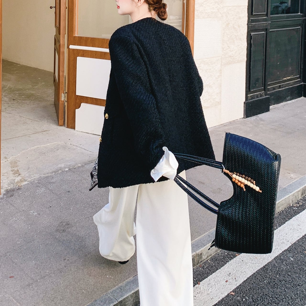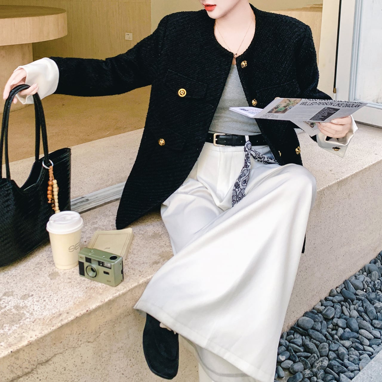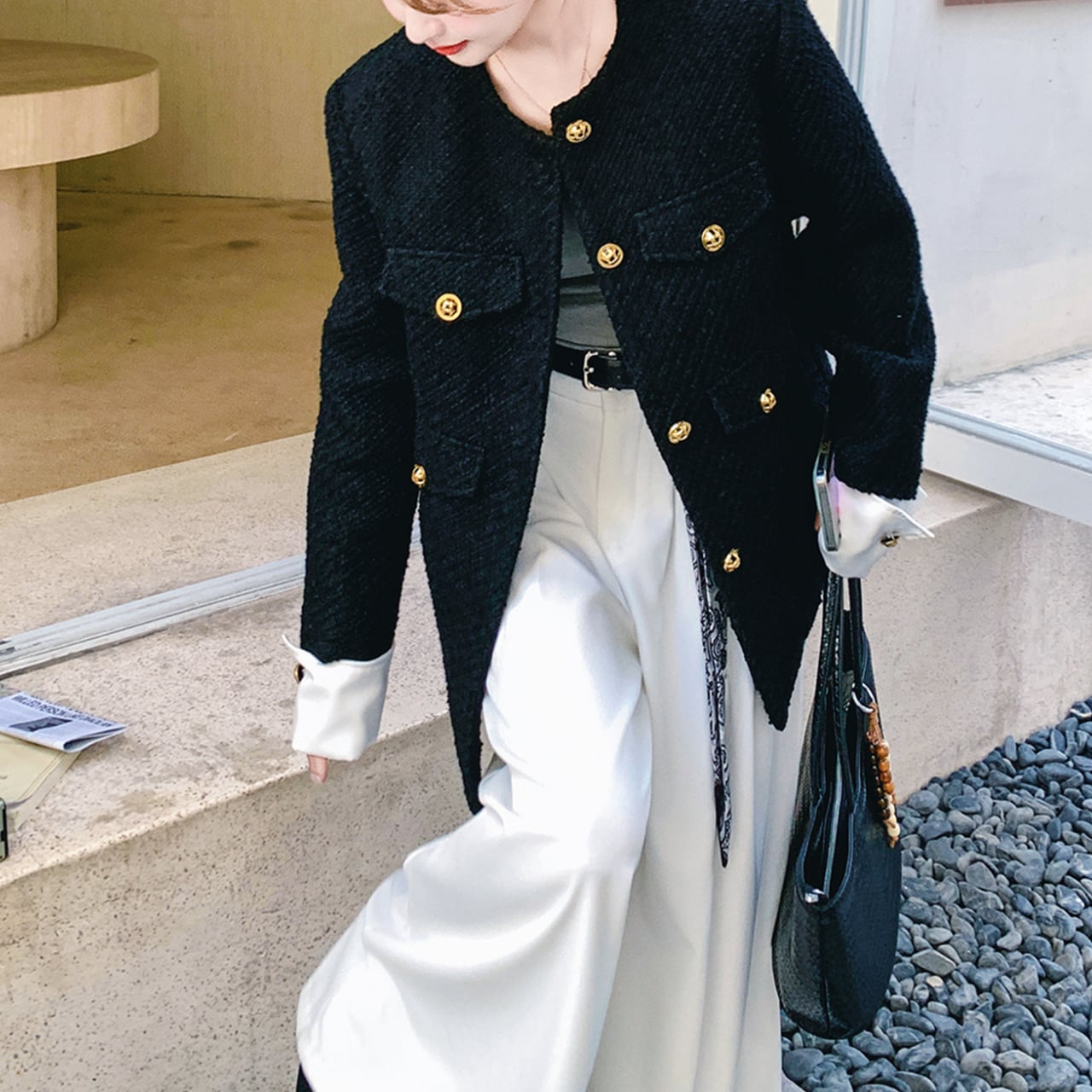 〜クラシックとモダンの、絶妙なバランス〜 ブラックベースに、ホワイトの折り返し袖がアクセントになったノーカラージャケット。 煌めくゴールドボタンが上品な印象に。 すっきりとしたノーカラーデザインで、首元を美しく見せながら、どんなインナーとも相性抜群。 程よい厚みで、肌寒い季節にも快適に過ごせます。 ✔️おすすめのスタイリング ・ホワイトパンツに合わせて、シックカジュアルに。 ・タイトスカート×パンプスで、オフィススタイル。 ・デニム×スニーカーで、週末のリラックスコーデ。 ■カラー ブラック ■サイズ XS 着丈:66cm 肩幅:42cm 胸囲:94cm 袖口:25cm S 着丈:68cm 肩幅:43cm 胸囲:98cm 袖口:26cm M 着丈:70cm 肩幅:44cm 胸囲:102cm 袖口:27cm L 着丈:72cm 肩幅:45cm 胸囲:106cm 袖口:28cm XL 着丈:73cm 肩幅:46cm 胸囲:110cm 袖口:29cm ■モデル 身長:165cm 体重:46kg Mサイズ着用 ■商品番号 S1714 ・・━━・・━━・・━━・・━━・・━━・・━━・・ 【お届けについて】 当ショップの商品は海外より取り寄せ・発送となりますので、ご入金から2〜3週間前後での発送を予定しております。 【お支払い方法について】 ・クレジットカード決済(VISA/Master/JCB/AMERICAN EXPRESS) ・キャリア決済(docomo/au/Softbank/Y!mobile) ・あと払い Pay ID決済 【注意事項】 ・商品の在庫切れや生産中止、生産遅延が発生する場合がありますので、ご了承ください。 ・こちらは輸入品であり、日本製品とは検品基準が異なることがあります。新品未使用品でも、わずかな汚れや傷が見受けられることがあります。 ・イメージ違いやサイズ・カラー相違による返品・交換はお断りさせていただきます。 ・お手持ちのスマートフォンやパソコンの環境によって、商品のお色味が異なる場合があります。 ・発送時期によってデザインや素材、細部が変更されることがございます。 ご購入前にこちらをお読みください →https://solemy.base.shop/about ・・━━・・━━・・━━・・━━・・━━・・━━・・