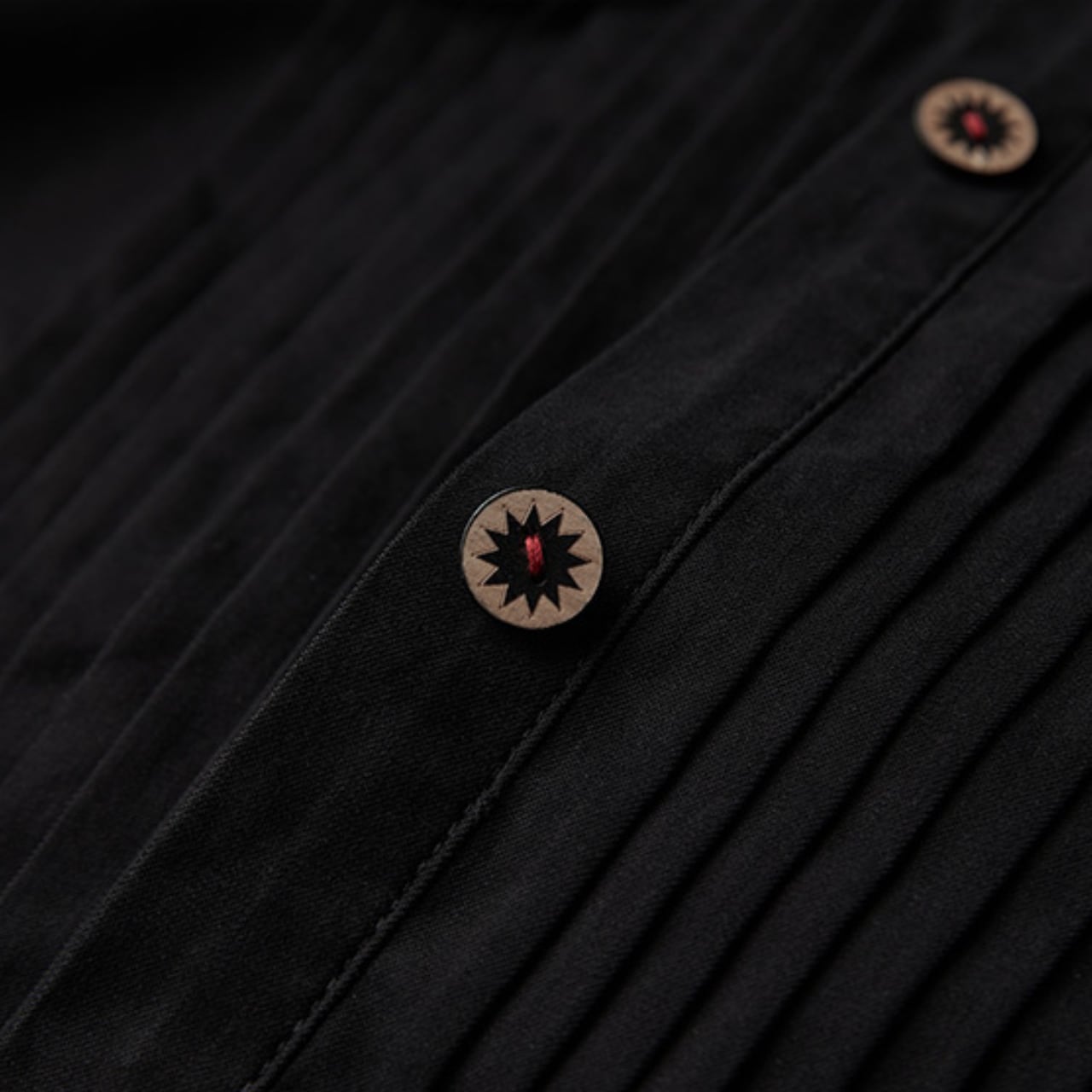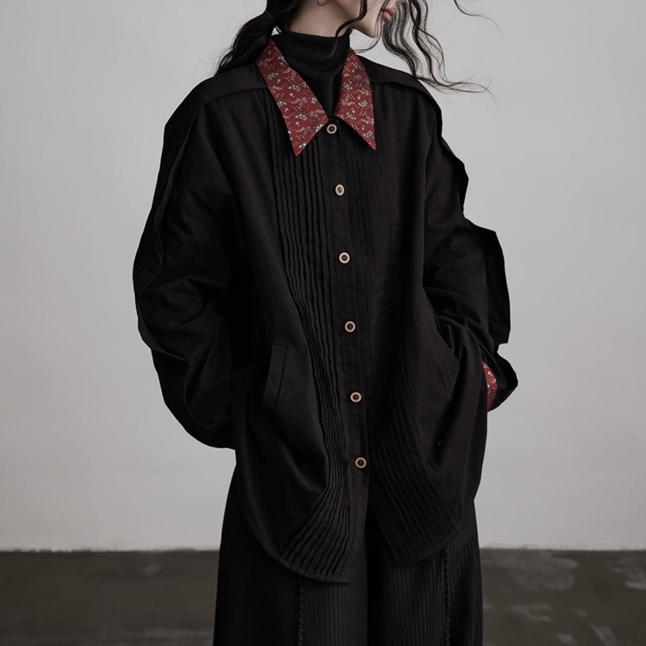 前立て部分には細やかなタックを施し。モードな立体感をプラス。