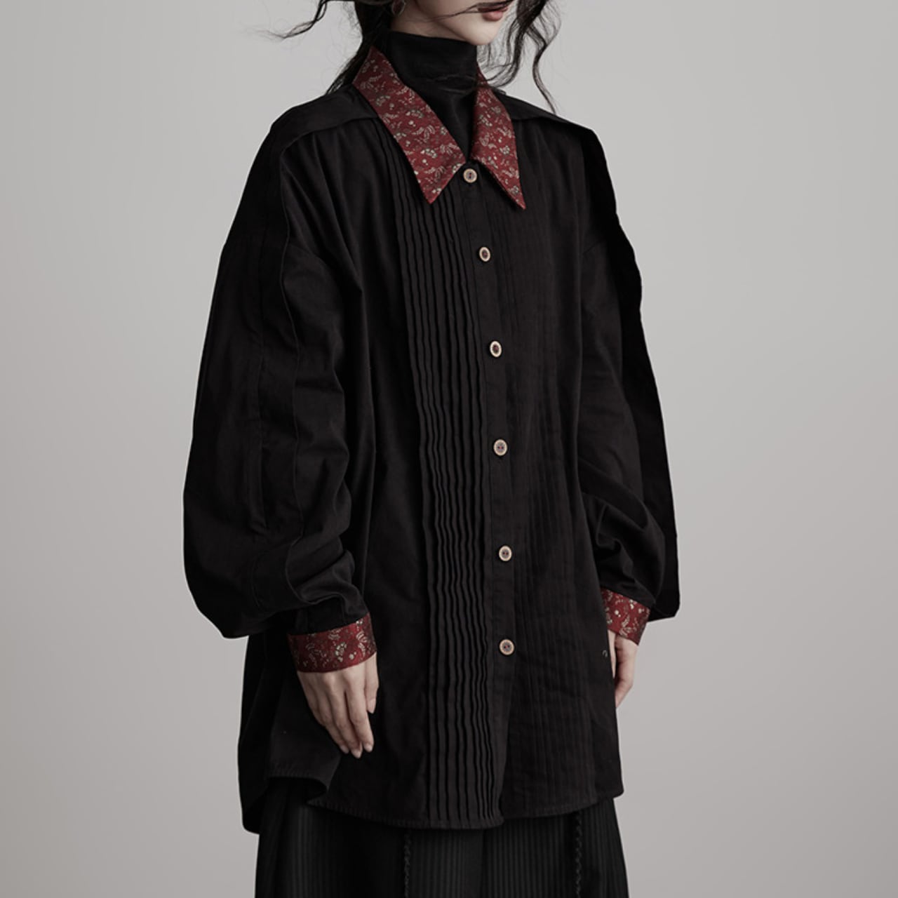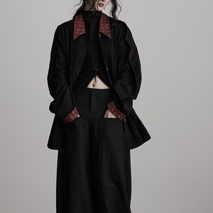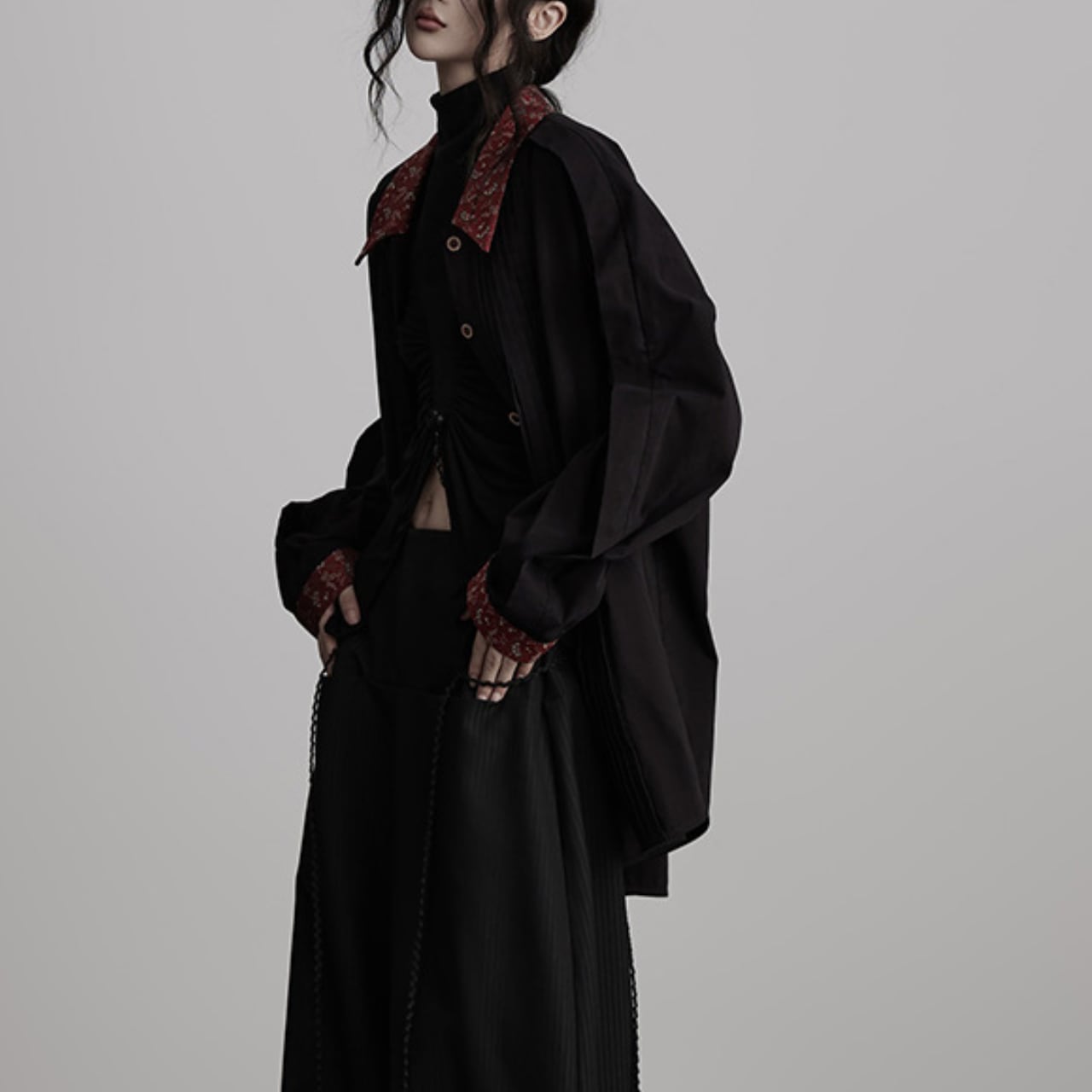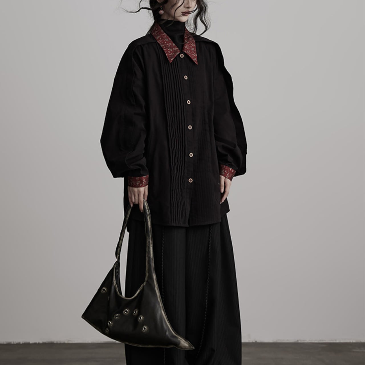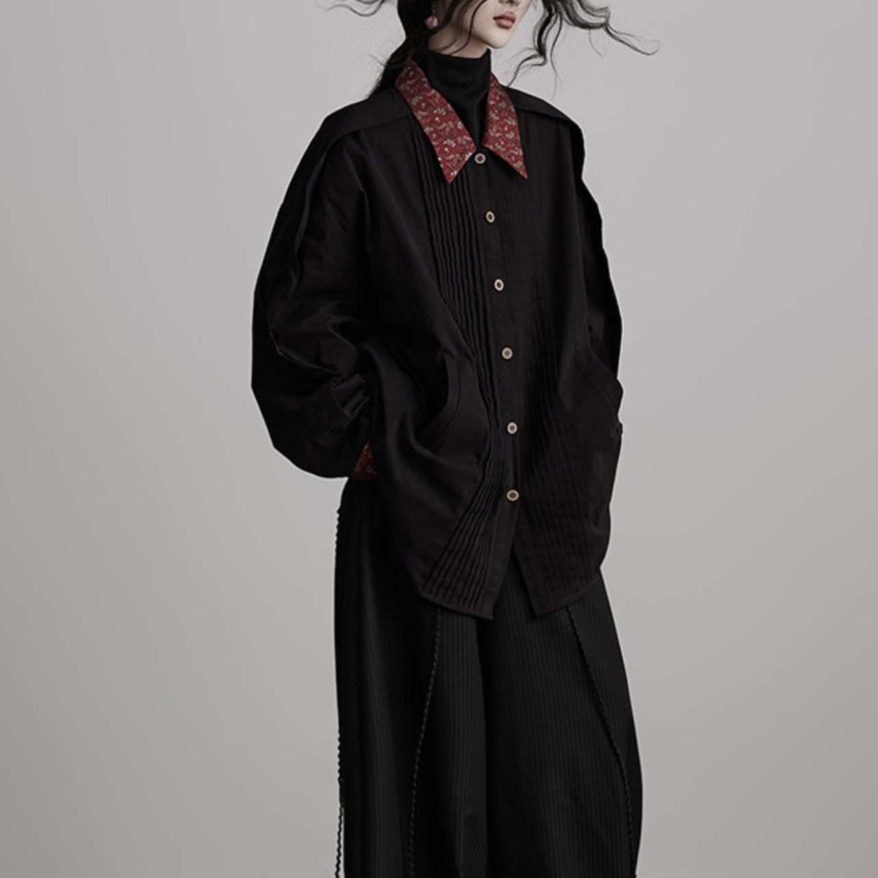 深みのあるブラックボディに、襟と袖のレッドカラーが静かに映える一枚。