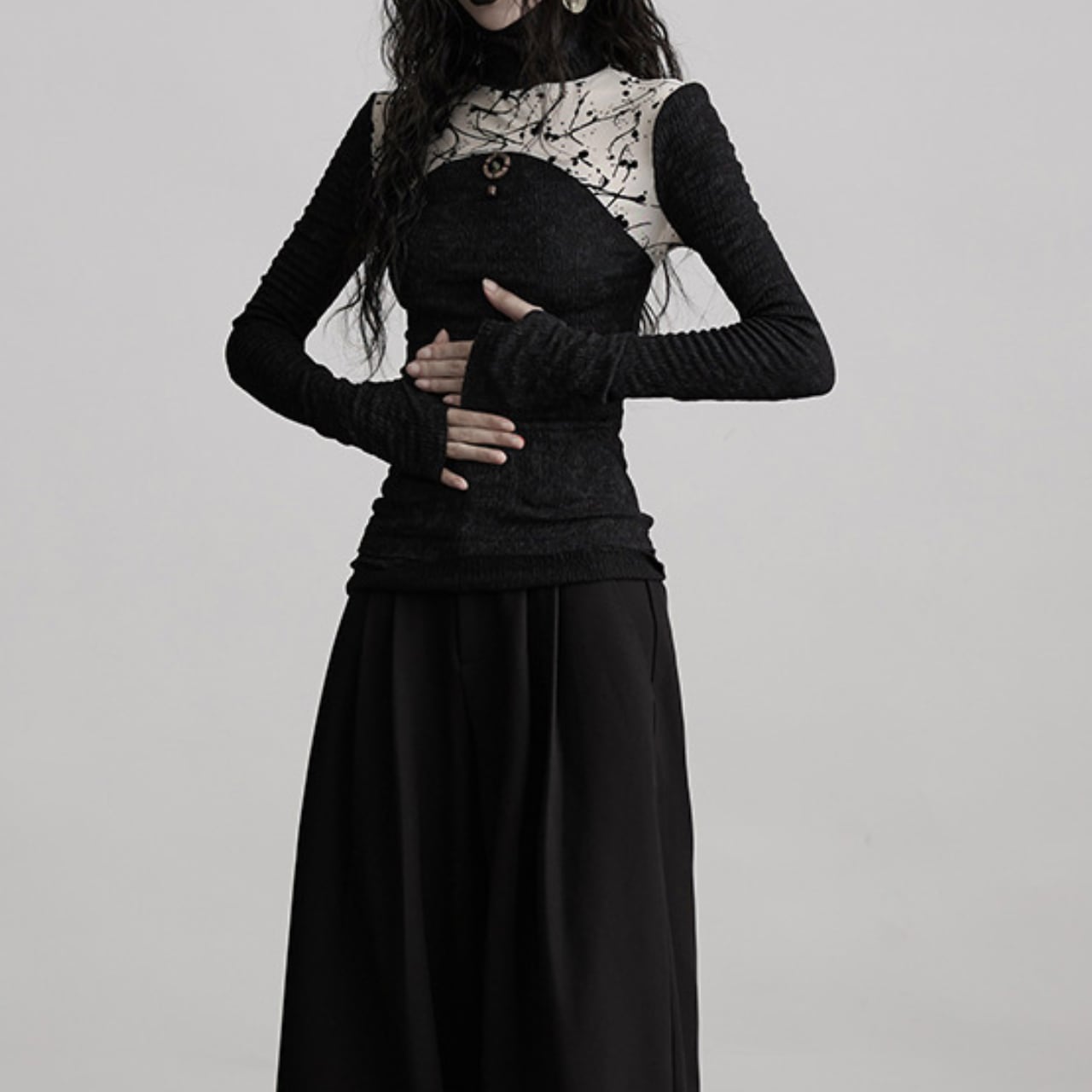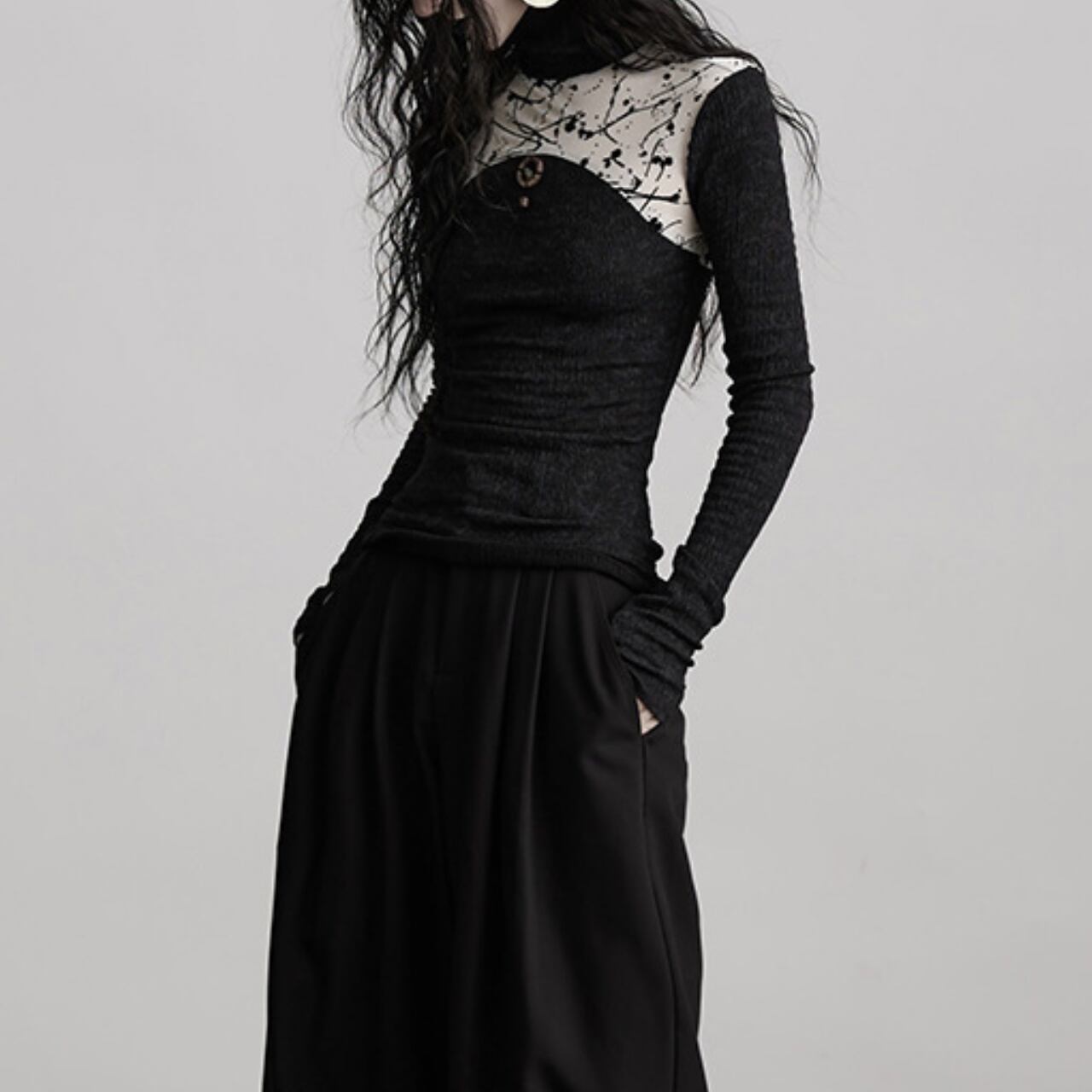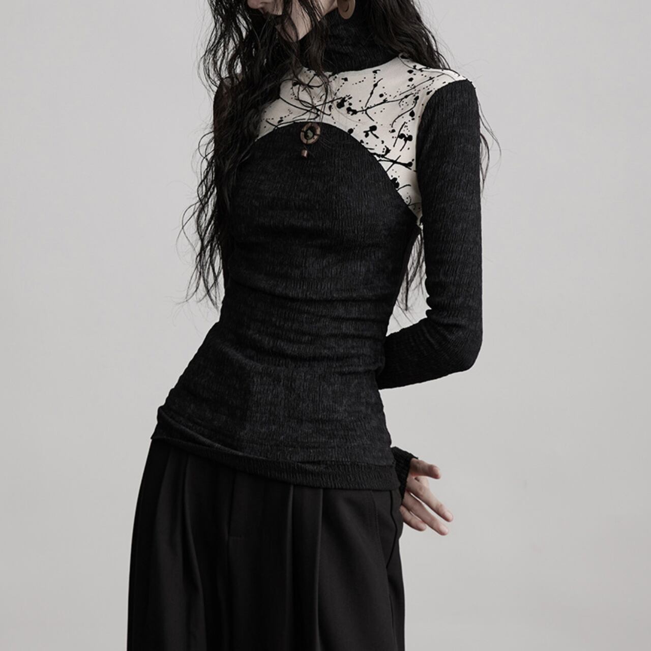 黒のベースに、まるでペイントアートのようなパッチワークデザインが映える、ハイネックトップス。