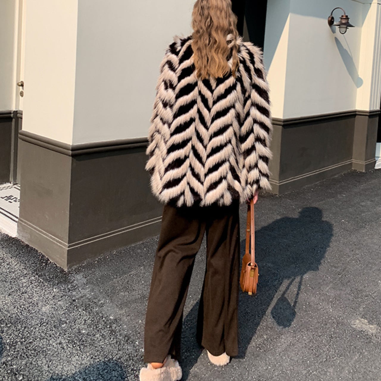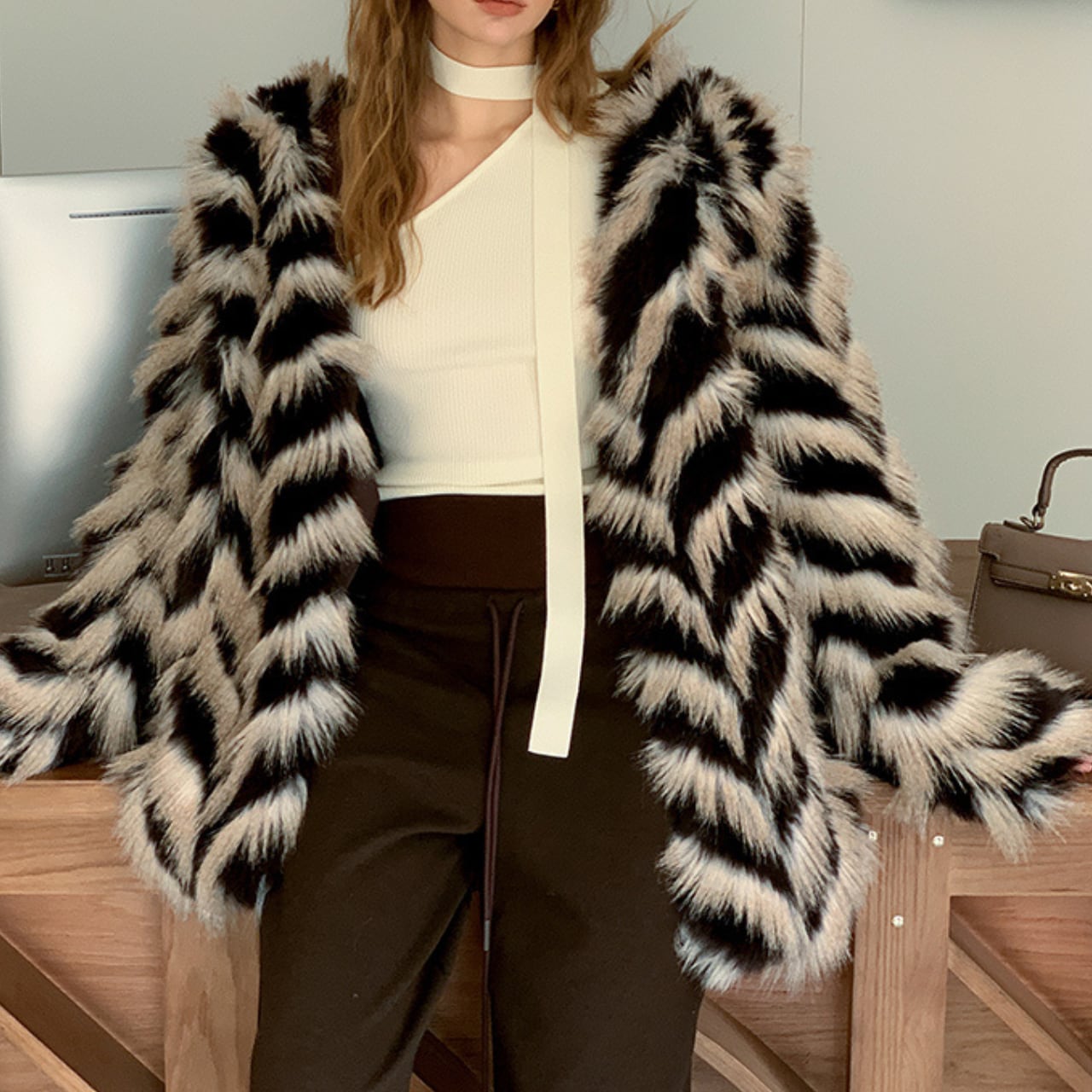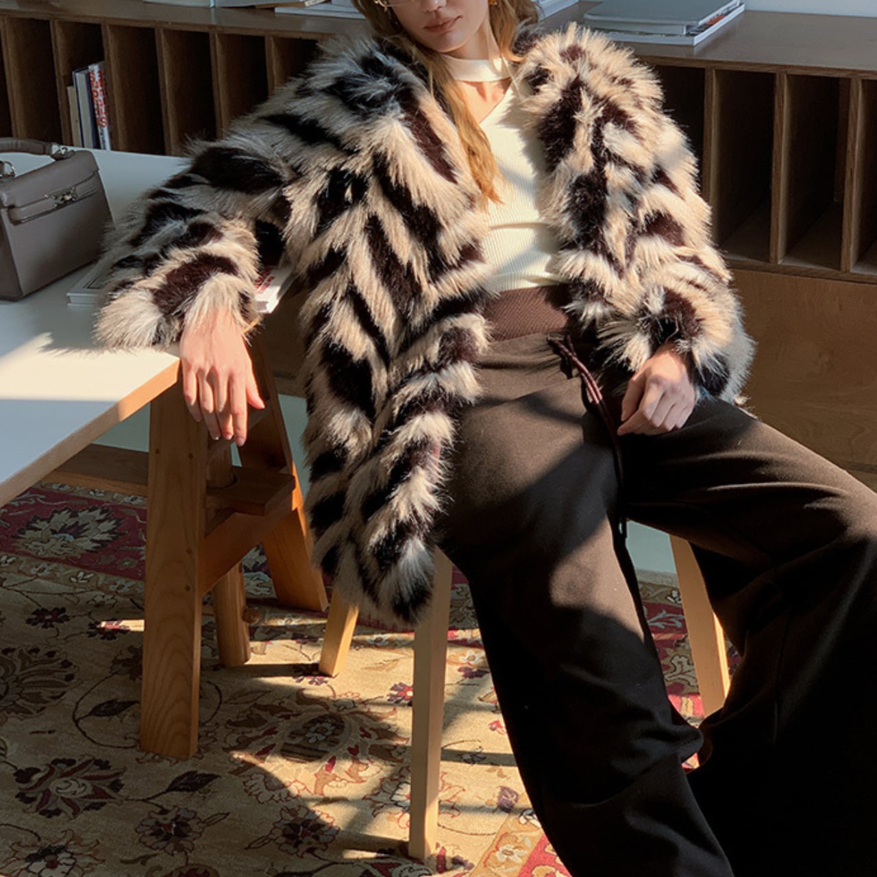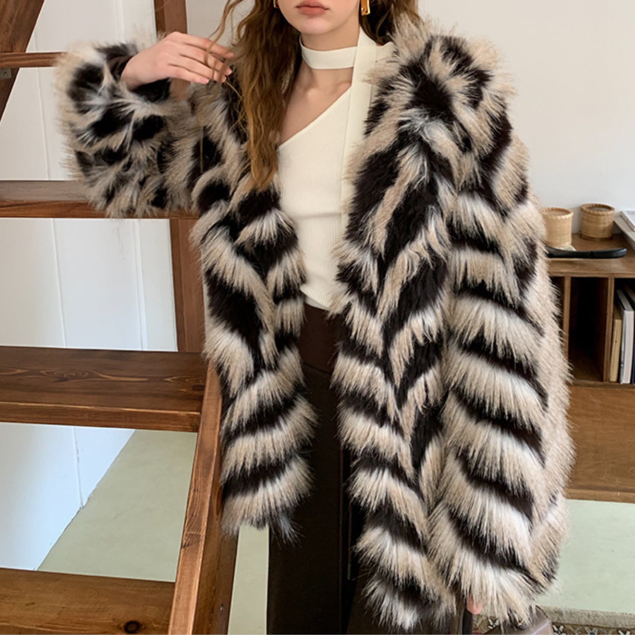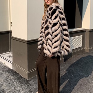 2色のコントラストが印象的な、ジグザグパターンのフェイクファーコート。
