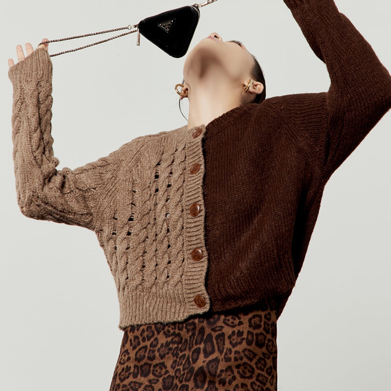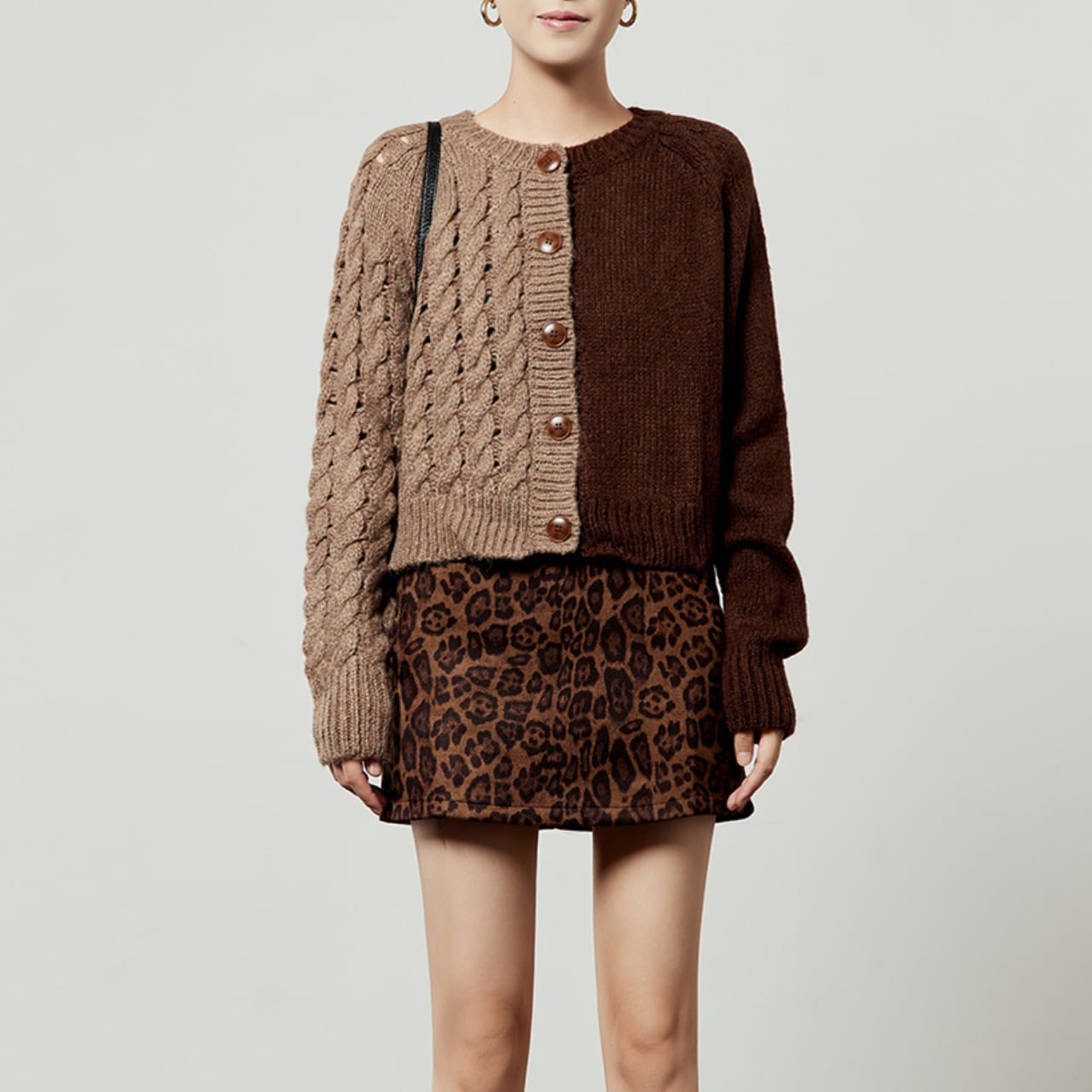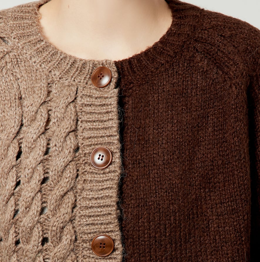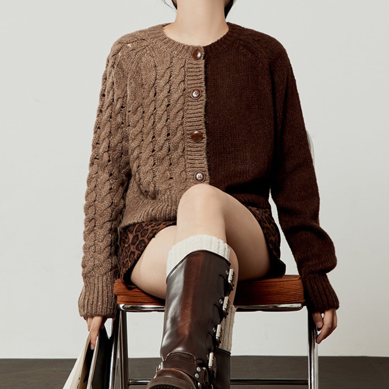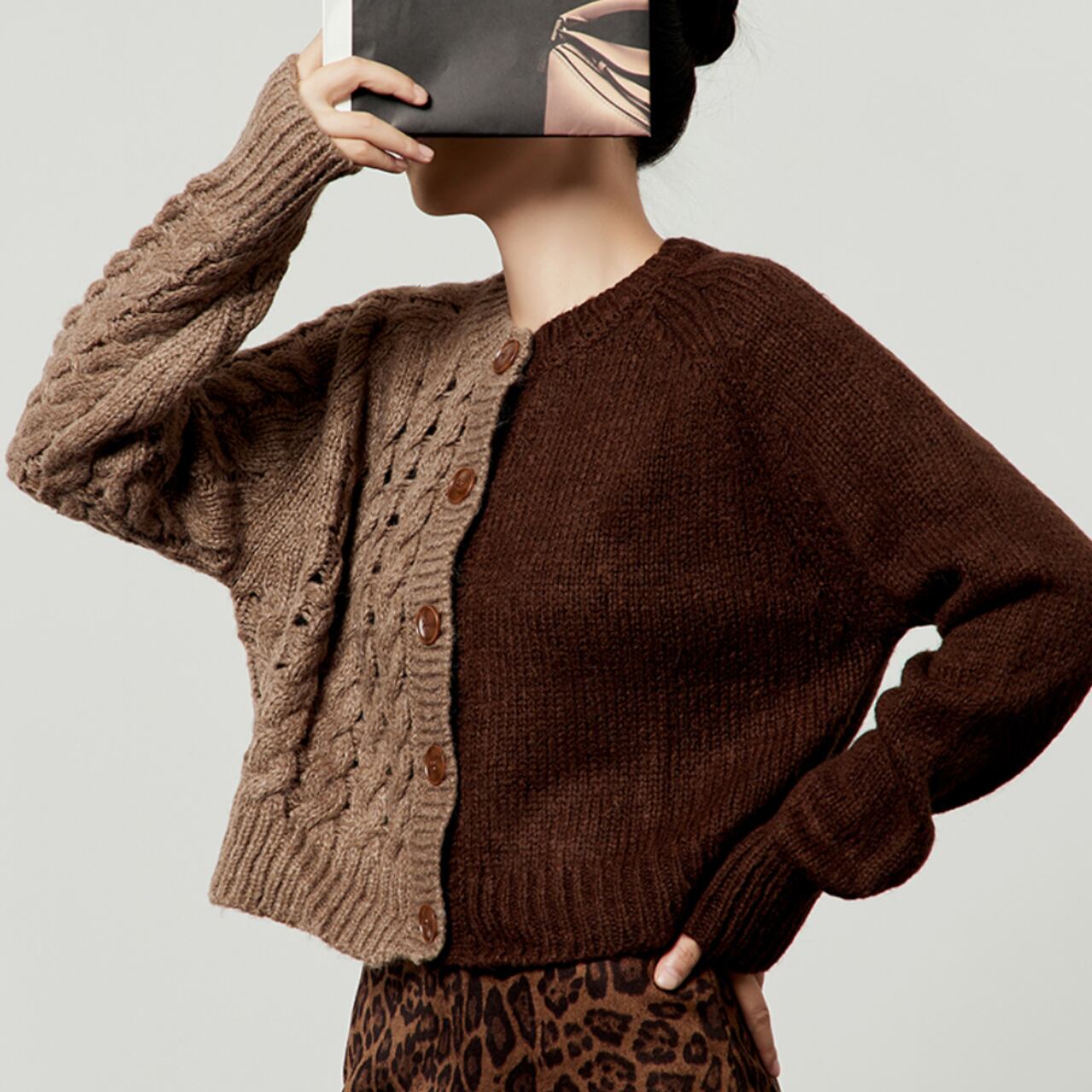 左右で異なる編み柄とカラーが織りなす、アート感覚のパッチワークカーディガン。