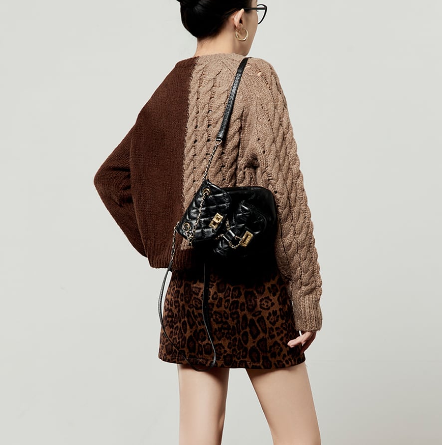 ベージュブラウンとダークブラウンのバイカラーデザインが、着る人を選ばない洗練された雰囲気を演出します。