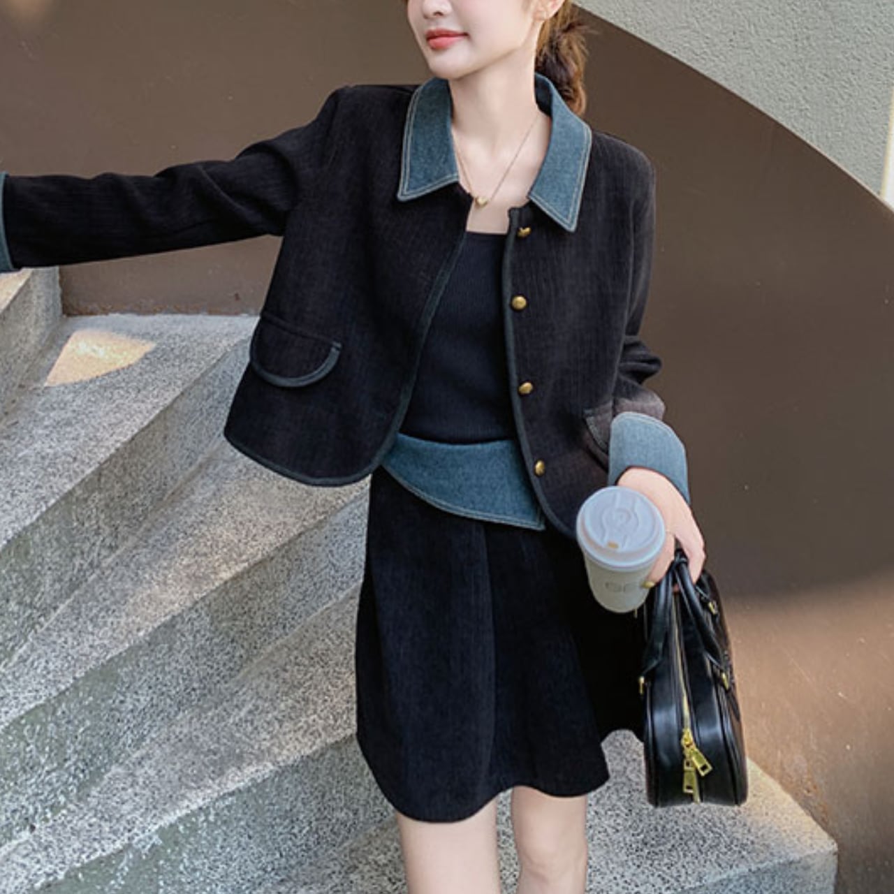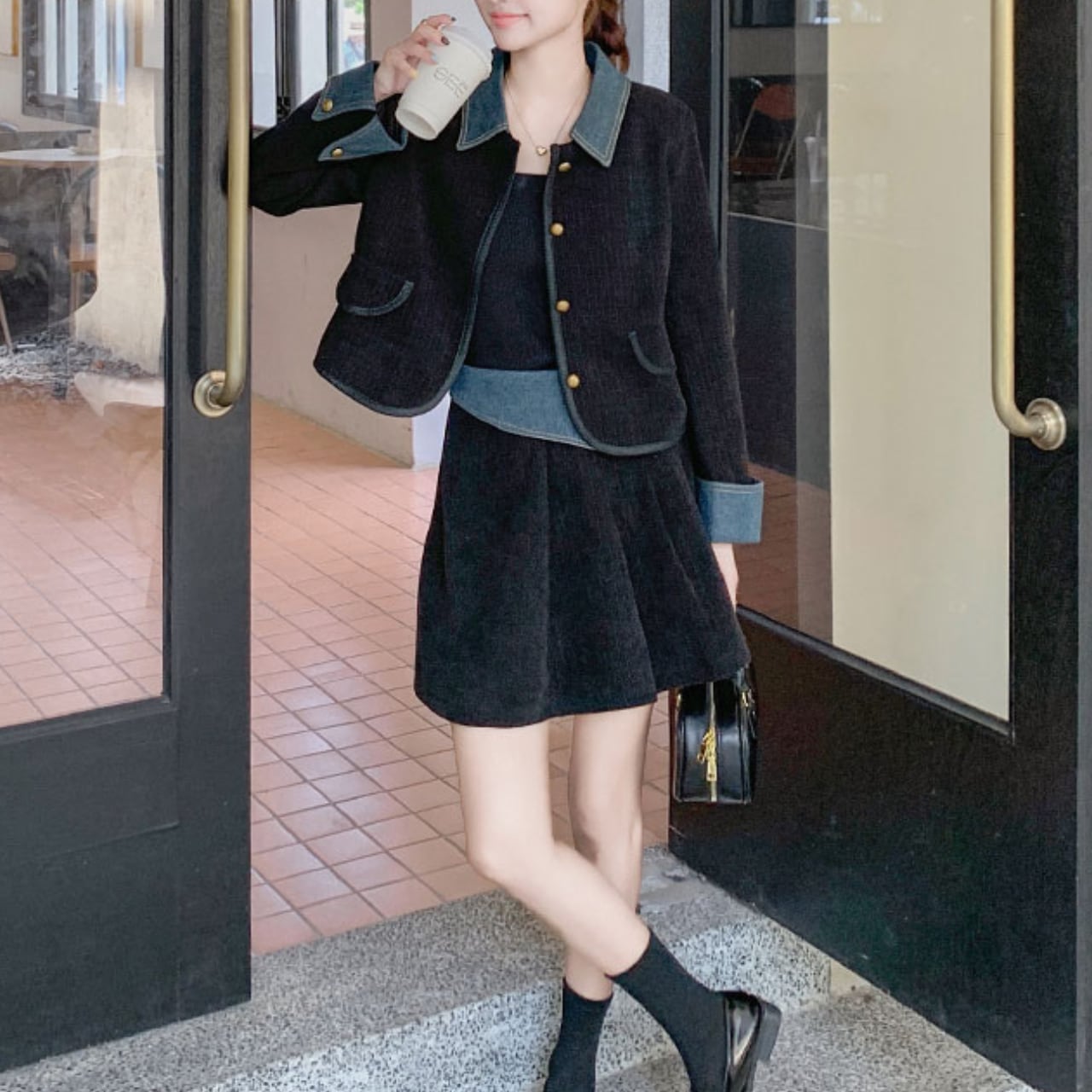 「今日は何を合わせよう…」という朝の悩みから解放される、コーディネート完結型のセット。デニムの程よいカジュアル感と、ブラックのシックな雰囲気が融合し、甘すぎず辛すぎない、大人が着やすい絶妙なバランスを実現しています。