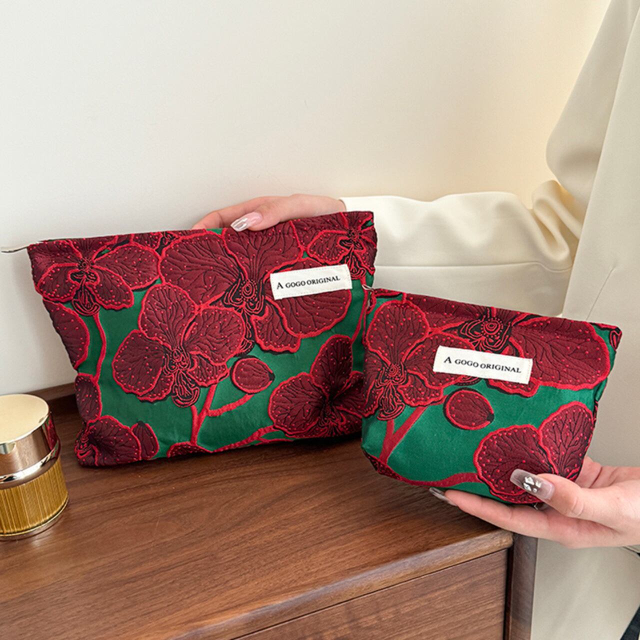 実用性とデザイン性を兼ね備えたこのポーチは、化粧品の収納はもちろん、バッグインバッグとして、旅行の小物入れとして、様々なシーンで活躍。