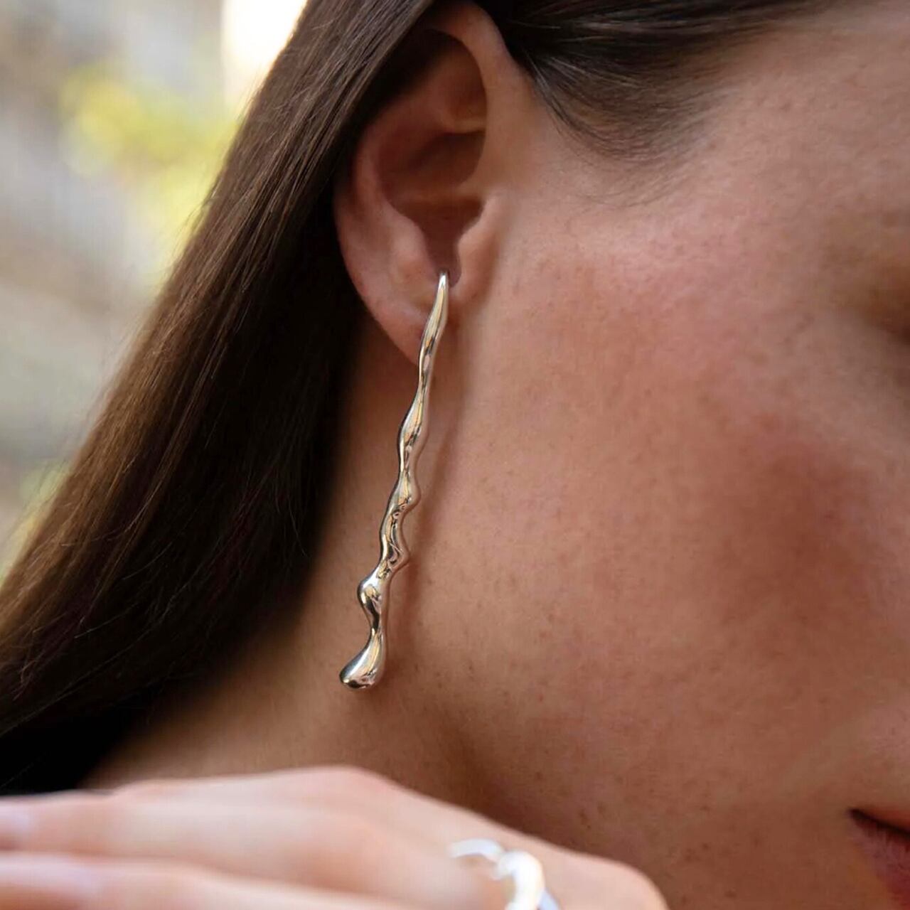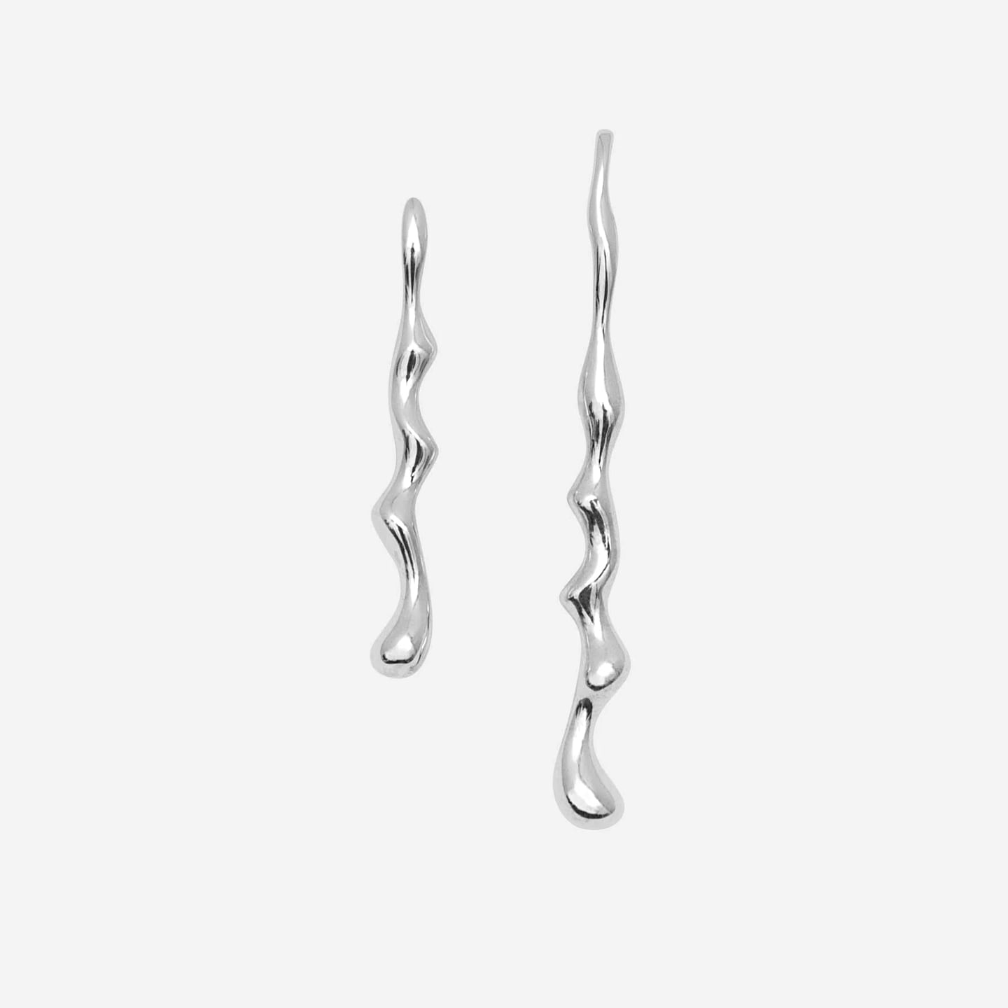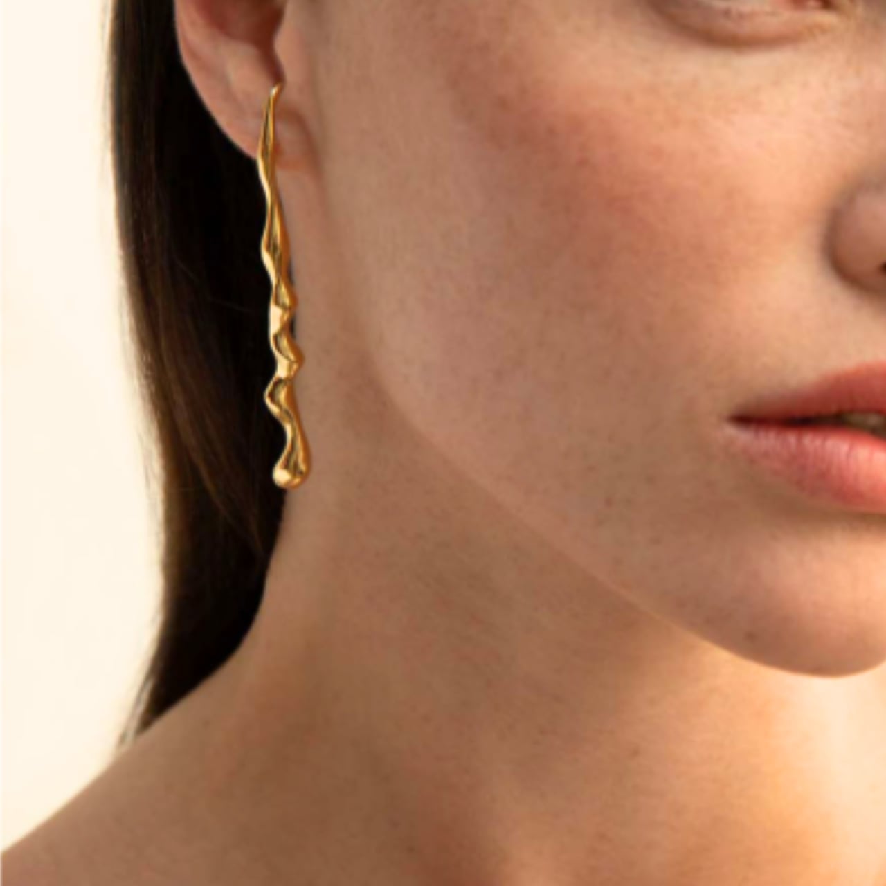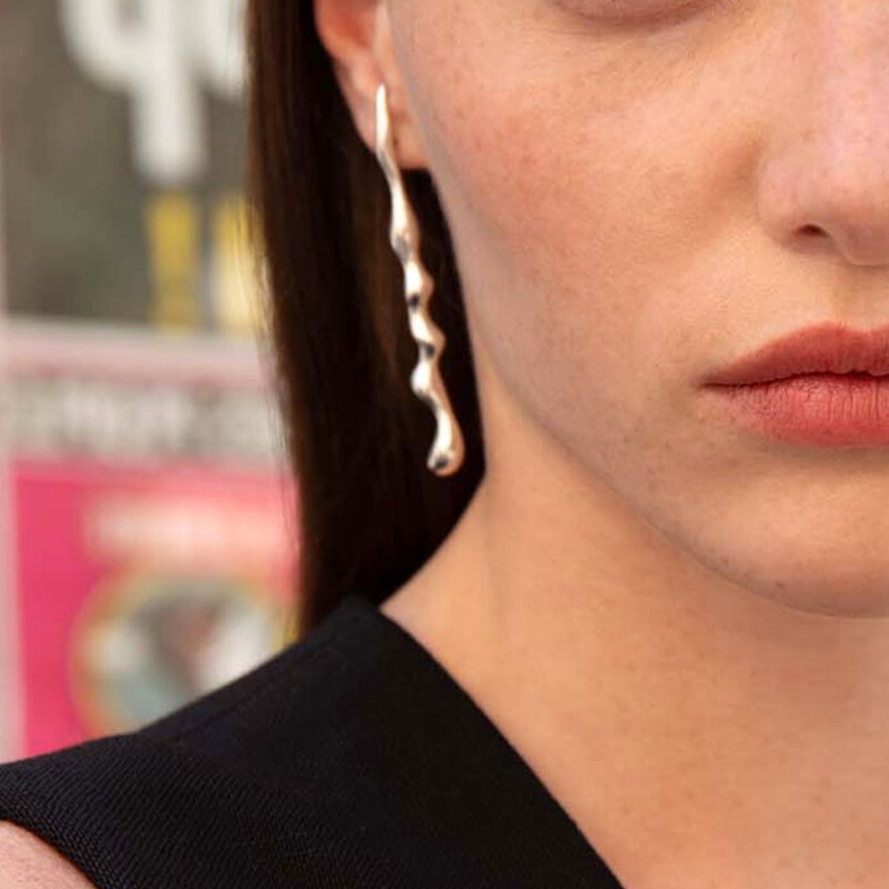 まるで水が流れ落ちる瞬間を切り取ったような、有機的でアーティスティックなフォルムのピアス。