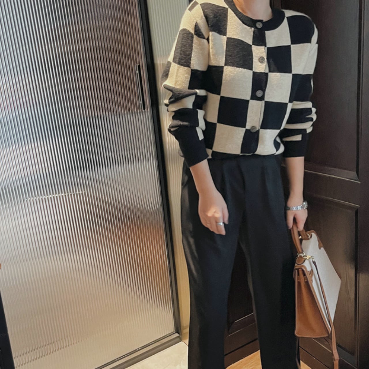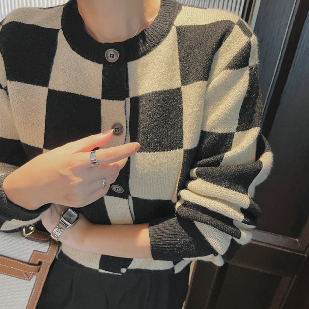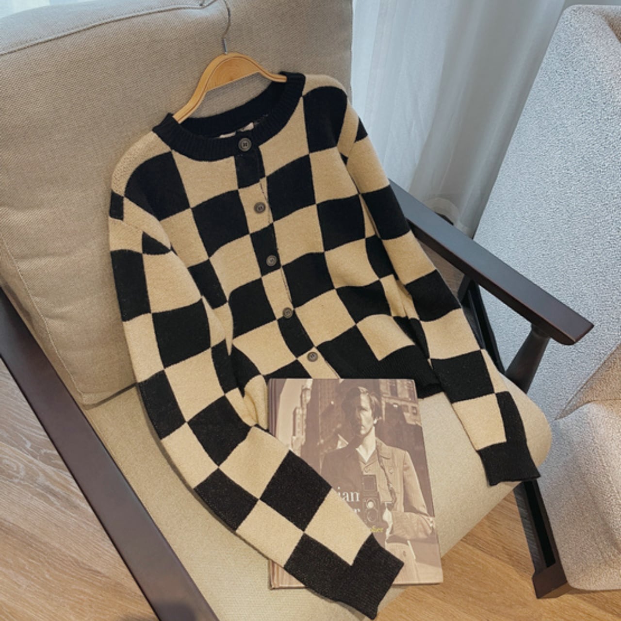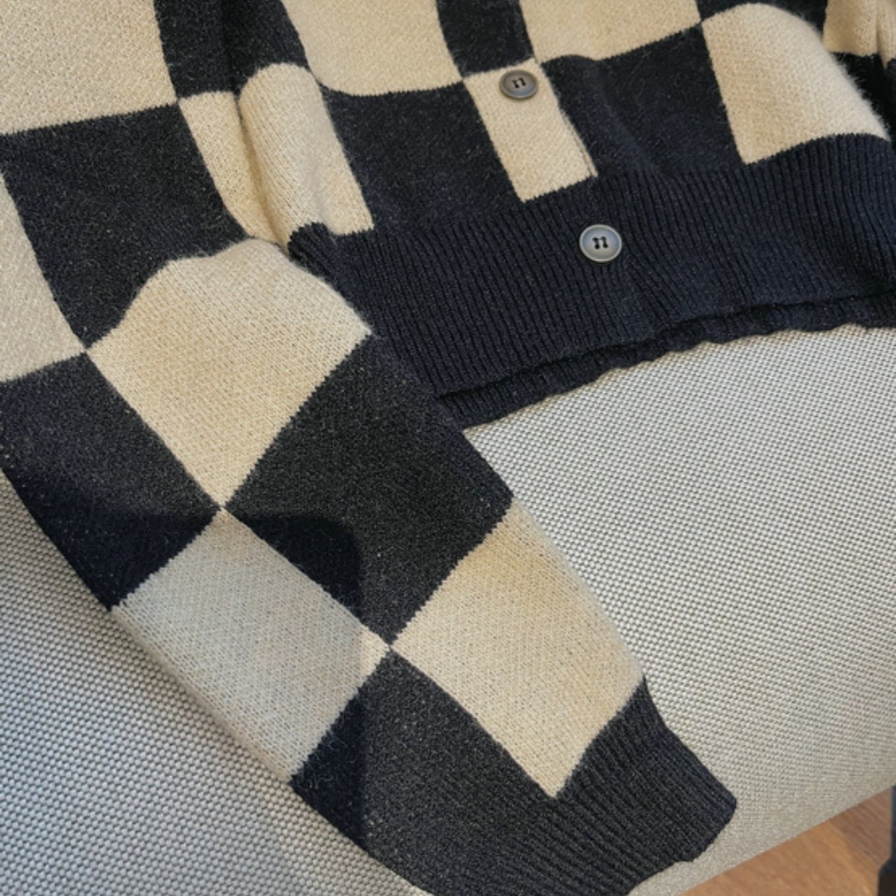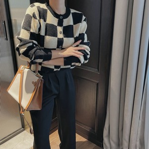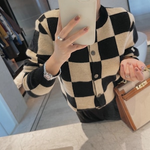 クラシカルなチェッカーボードを大胆に配した、インパクト抜群のニットカーディガン。