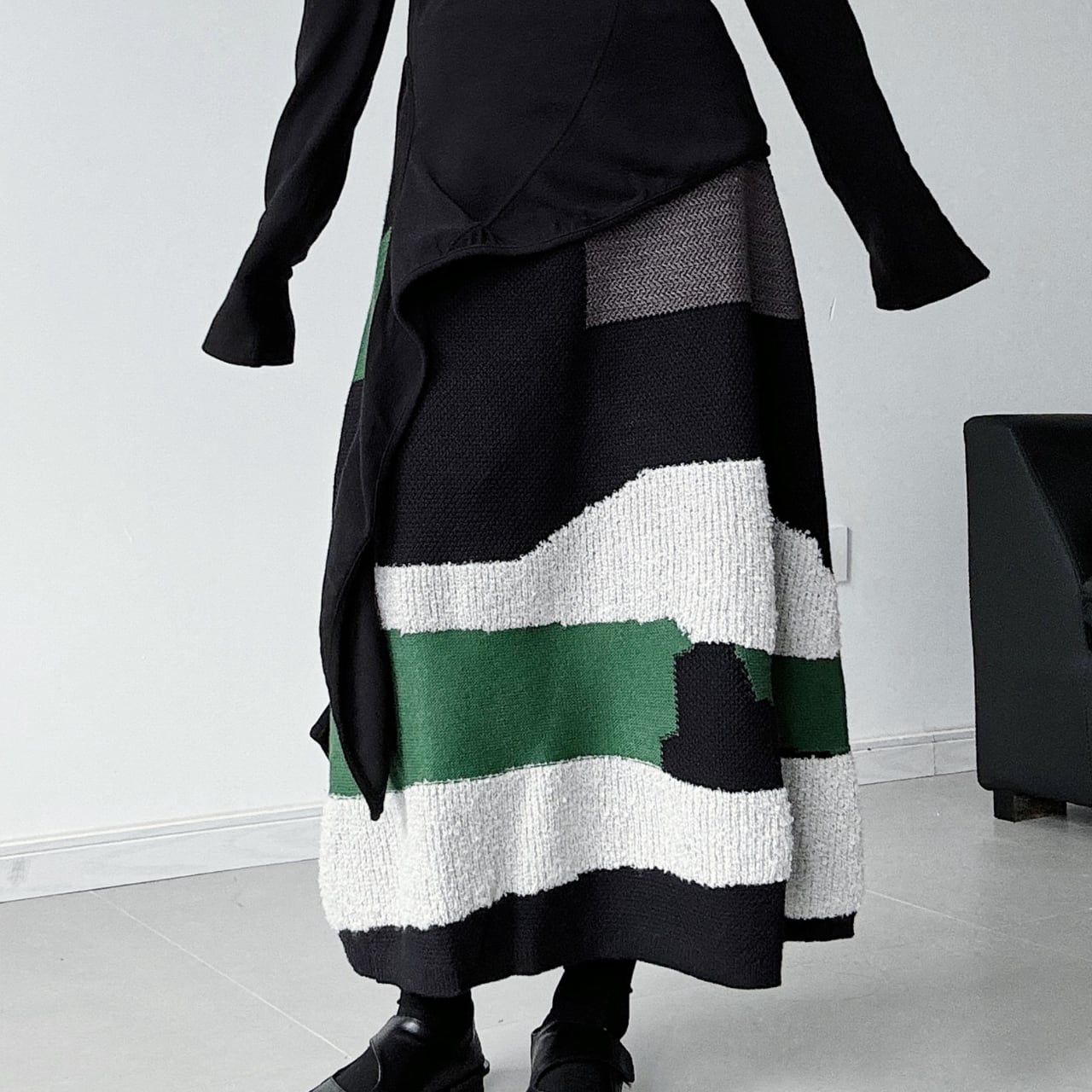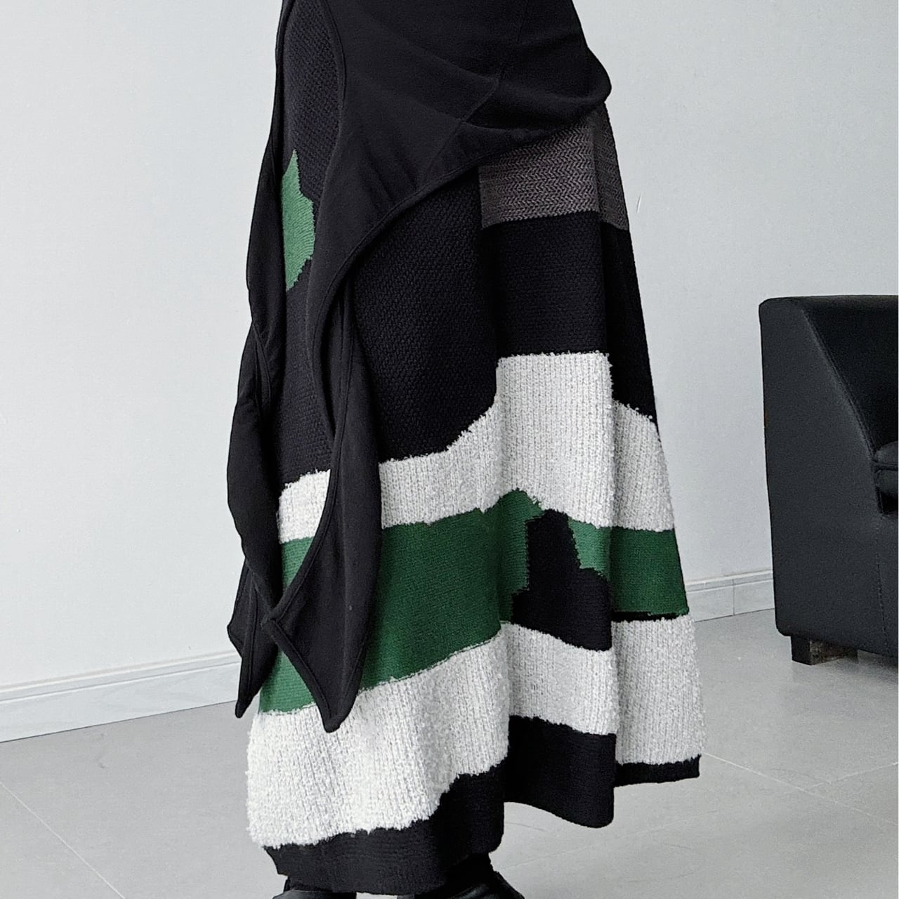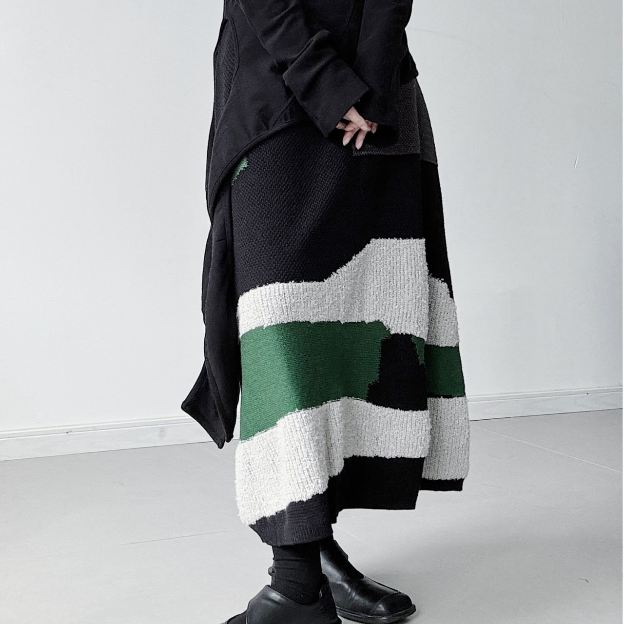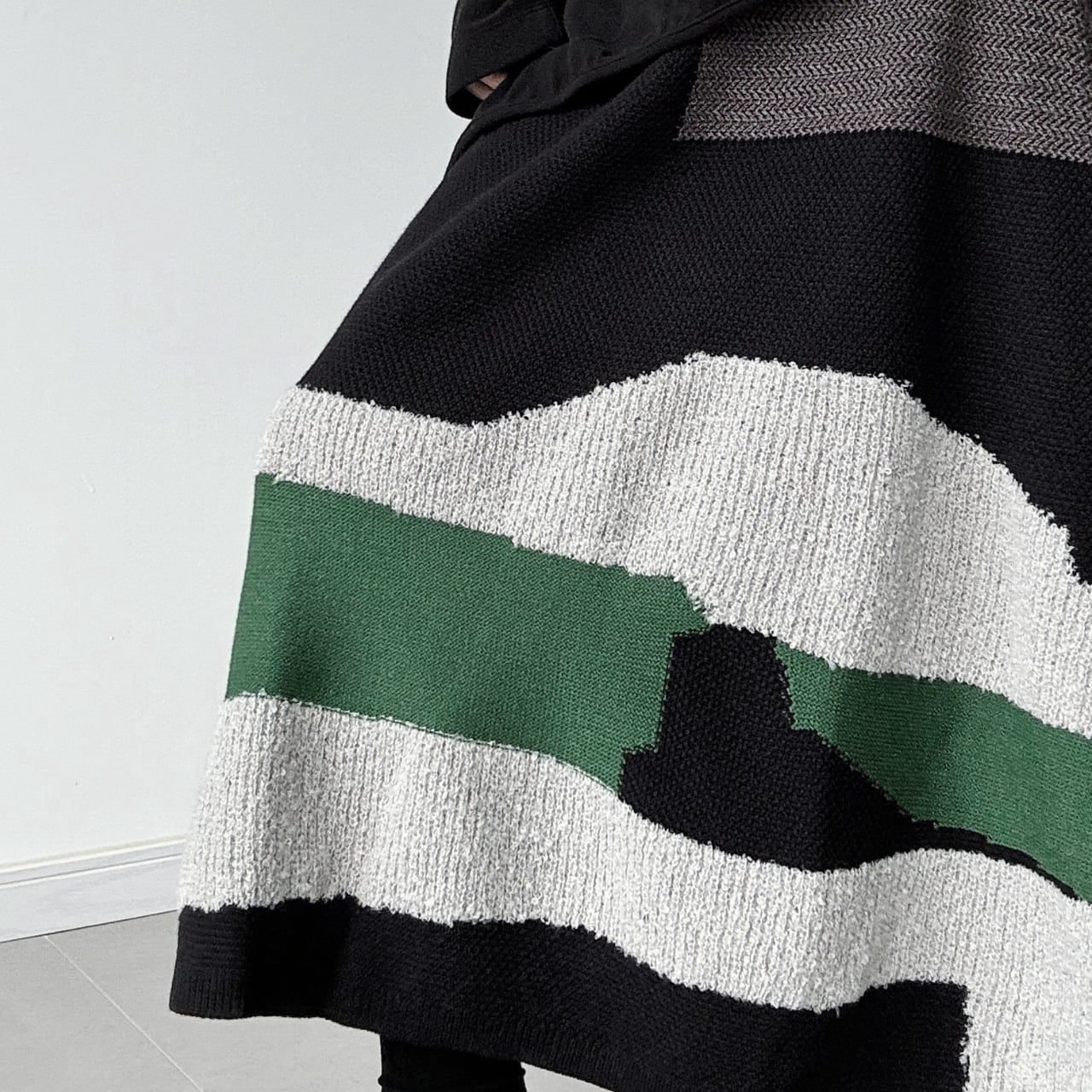 ブラック、アイボリー、深みのあるグリーンが織りなすカラーブロックは、見る角度によって表情を変え、着る人を唯一無二の存在へと昇華。
