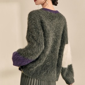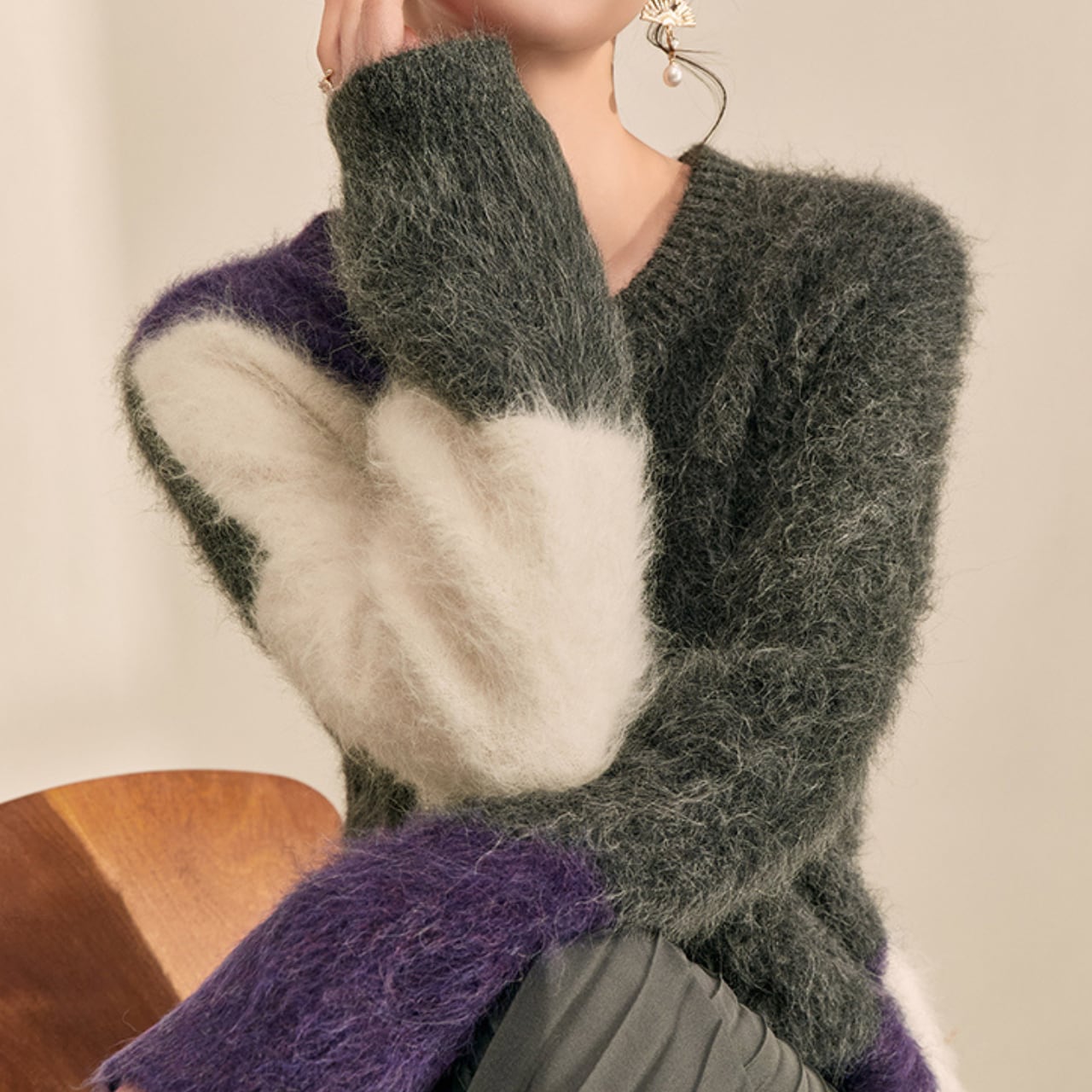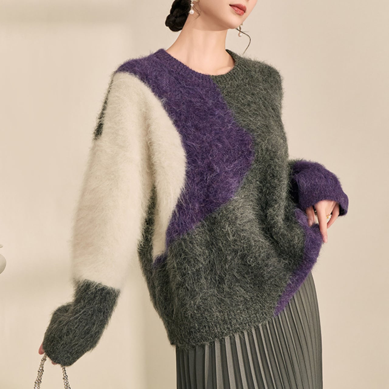 まるでパレットの上で絵の具が混ざり合うような3カラー。アシンメトリーな配色が大胆に切り替わる、アーティスティックなモヘアニット。