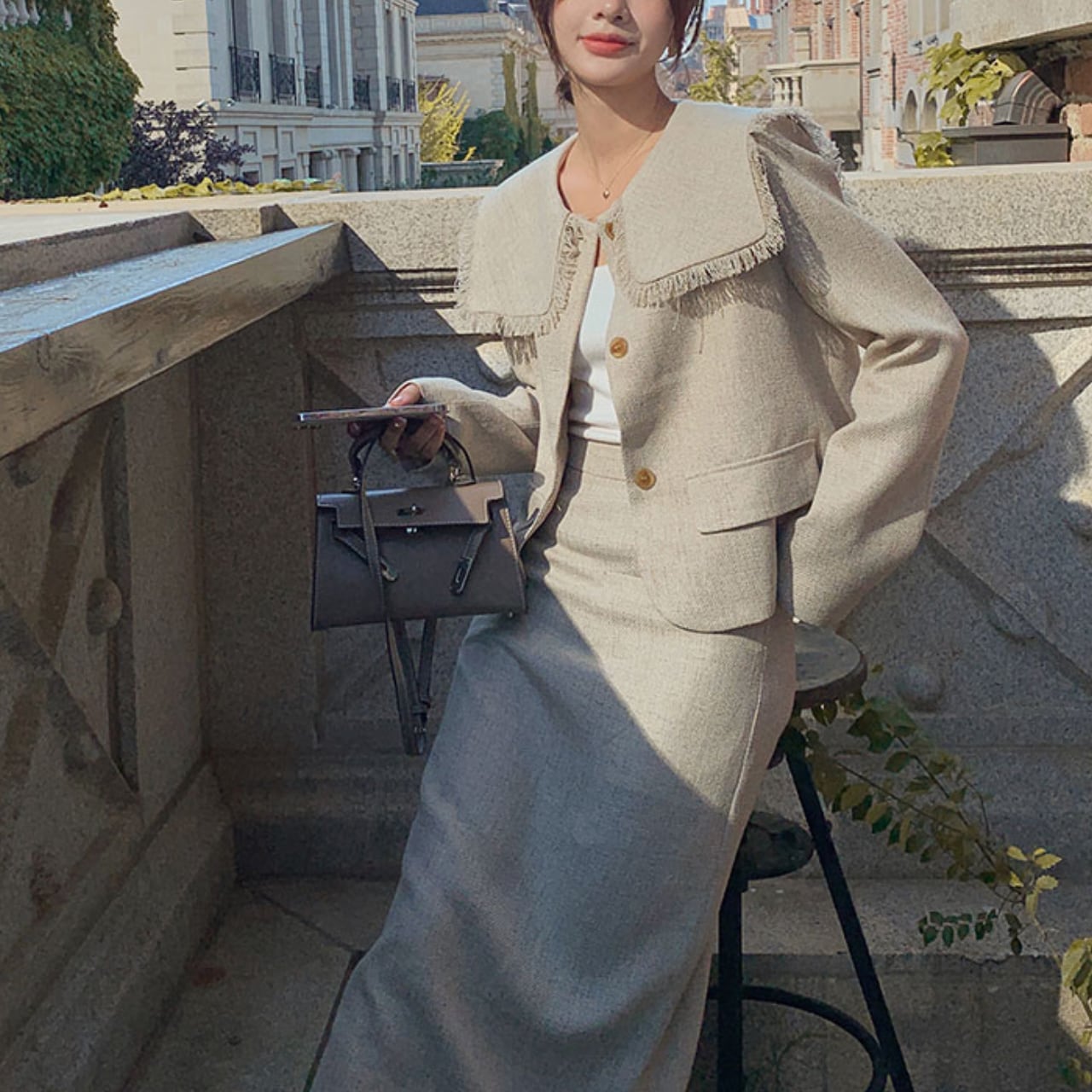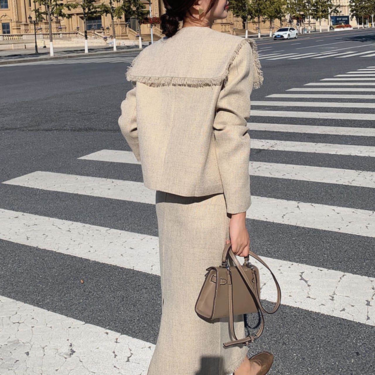 〜フリンジが描く、クラシカルモダン〜 上品なフリンジカラーのジャケット&スカートセットアップ。 胸元を華やかに彩るフリンジ襟のディテールが、クラシカルでありながら新鮮な印象を与えます。 顔周りを明るく見せる効果もあり、表情まで優しく映します。 スカートは歩きやすいスリット入りで、窮屈感なく美しく歩けます。 ウエストのすっきりとしたデザインが、スタイルアップ効果を発揮。 ジャケットとスカートを別々に着回すこともでき、コーディネートの幅が広がる優秀アイテムです。 ✔️おすすめのスタイリング ・シンプルなトップスと合わせて、ジャケットを主役にしたスタイルも◎ ・スニーカーやブーツを合わせて、カジュアルダウンしたおしゃれなコーディネートを楽しんで。 ・アクセサリーをプラスして、特別な日のオケージョンスタイルにアレンジ。 ■カラー ベージュ ◼️サイズ トップス XS 着丈:50cm 胸囲:90cm 肩幅:38cm 袖丈:57cm S 着丈:51cm 胸囲:94cm 肩幅:39cm 袖丈:58cm M 着丈:52cm 胸囲:98cm 肩幅:40cm 袖丈:59cm L 着丈:53cm 胸囲:102cm 肩幅:41cm 袖丈:60cm XL 着丈:54cm 胸囲:106cm 肩幅:42cm 袖丈:61cm 2XL 着丈:55cm 胸囲:110cm 肩幅:43cm 袖丈:62cm スカート XS 着丈:92cm ヒップ:96cm ウエスト:60cm S 着丈:93cm ヒップ:100cm ウエスト:64cm M 着丈:94cm ヒップ:104cm ウエスト:68cm L 着丈:95cm ヒップ:108cm ウエスト:72cm XL 着丈:96cm ヒップ:112cm ウエスト:76cm 2XL 着丈:97cm ヒップ:116cm ウエスト:80cm ※採寸方法により1〜3cmの誤差がある場合がございます。 ■モデル 身長:165cm 体重:46kg Mサイズ着用 ■商品番号 S1764 ・・━━・・━━・・━━・・━━・・━━・・━━・・ 【お届けについて】 当ショップの商品は海外より取り寄せ・発送となりますので、ご入金から2〜3週間前後での発送を予定しております。 【お支払い方法について】 ・クレジットカード決済(VISA/Master/JCB/AMERICAN EXPRESS) ・キャリア決済(docomo/au/Softbank/Y!mobile) ・あと払い Pay ID決済 【注意事項】 ・商品の在庫切れや生産中止、生産遅延が発生する場合がありますので、ご了承ください。 ・こちらは輸入品であり、日本製品とは検品基準が異なることがあります。新品未使用品でも、わずかな汚れや傷が見受けられることがあります。 ・イメージ違いやサイズ・カラー相違による返品・交換はお断りさせていただきます。 ・お手持ちのスマートフォンやパソコンの環境によって、商品のお色味が異なる場合があります。 ・発送時期によってデザインや素材、細部が変更されることがございます。 ご購入前にこちらをお読みください →https://solemy.base.shop/about ・・━━・・━━・・━━・・━━・・━━・・━━・・