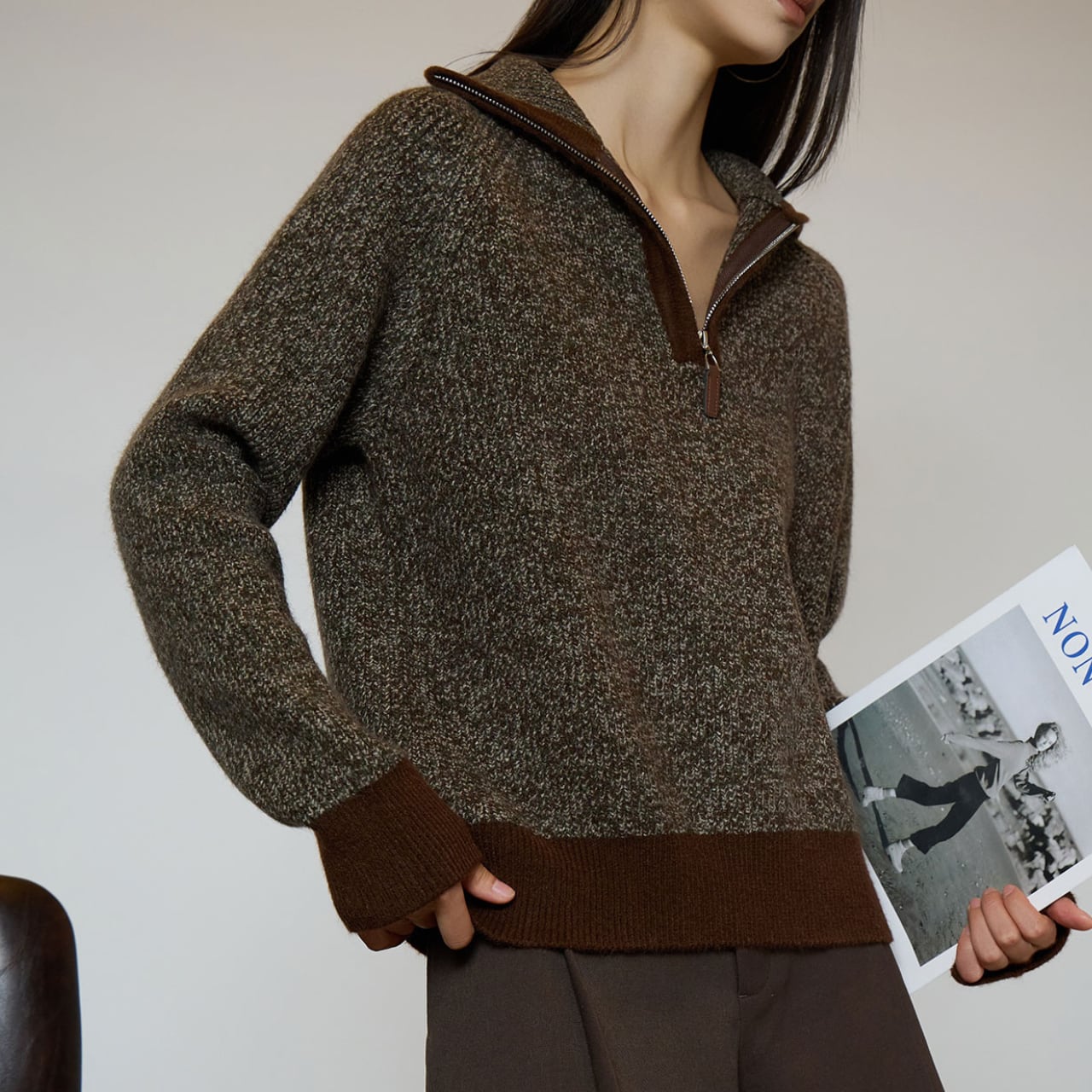 首元、裾、袖口にダークブラウンを配し、ベースカラーとの絶妙なコントラストが洗練された印象を演出します。