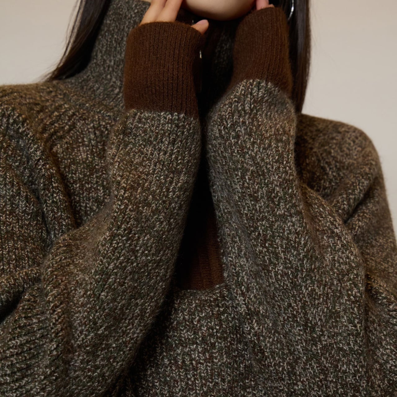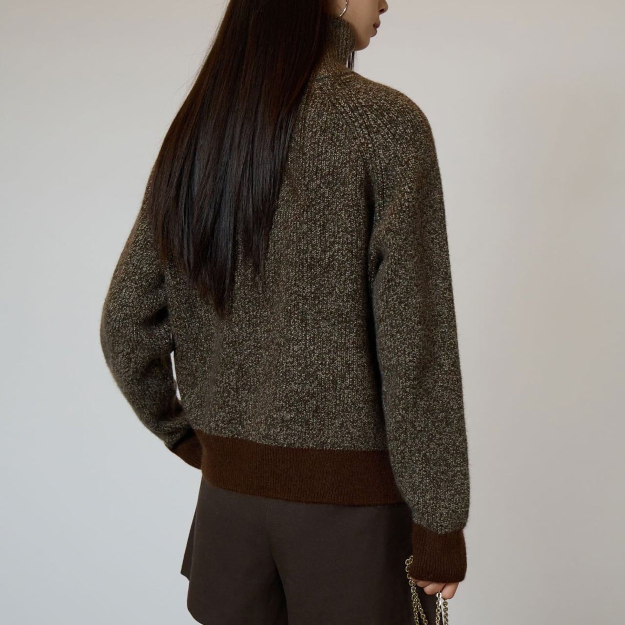 アースカラーの配色が目を惹く、バイカラータートルネックニット。