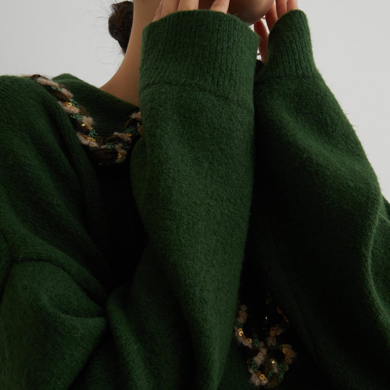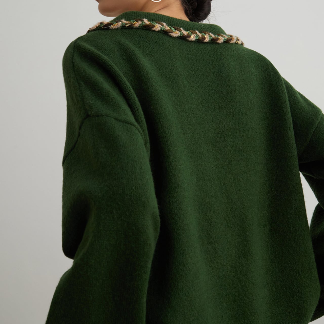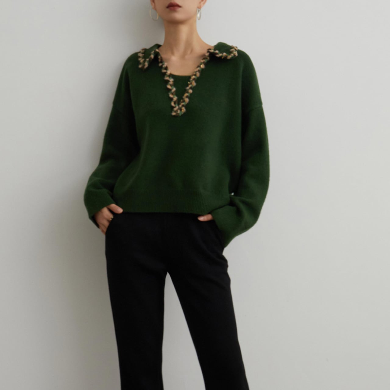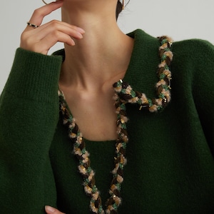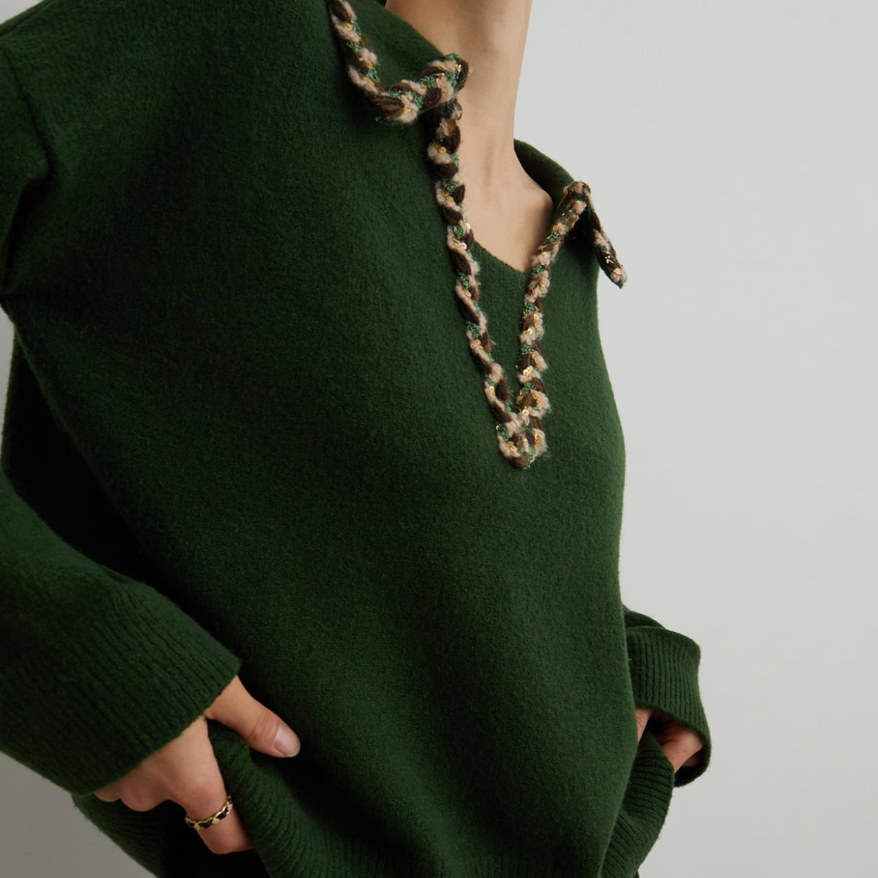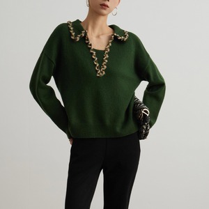 襟元を華やかに彩るトリムが特徴的な、Vネックニット。