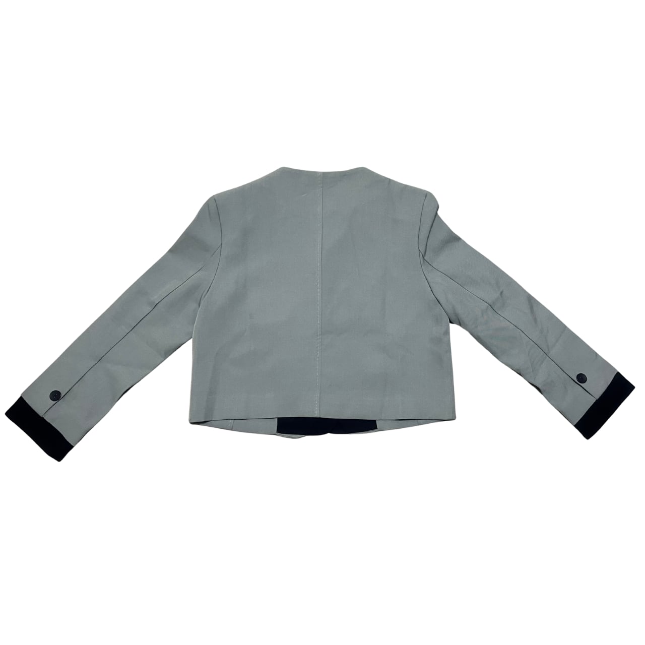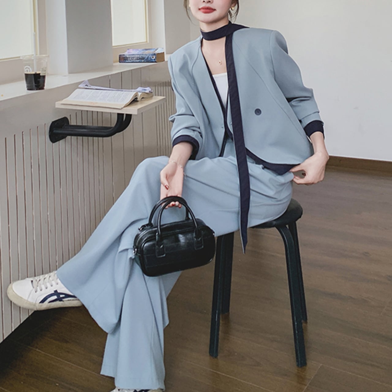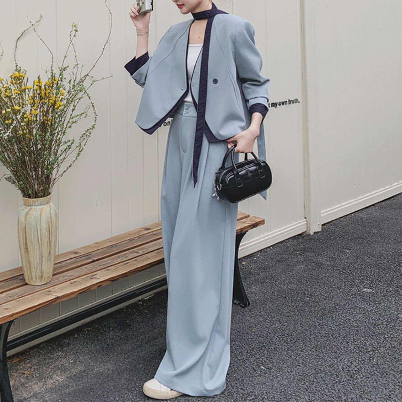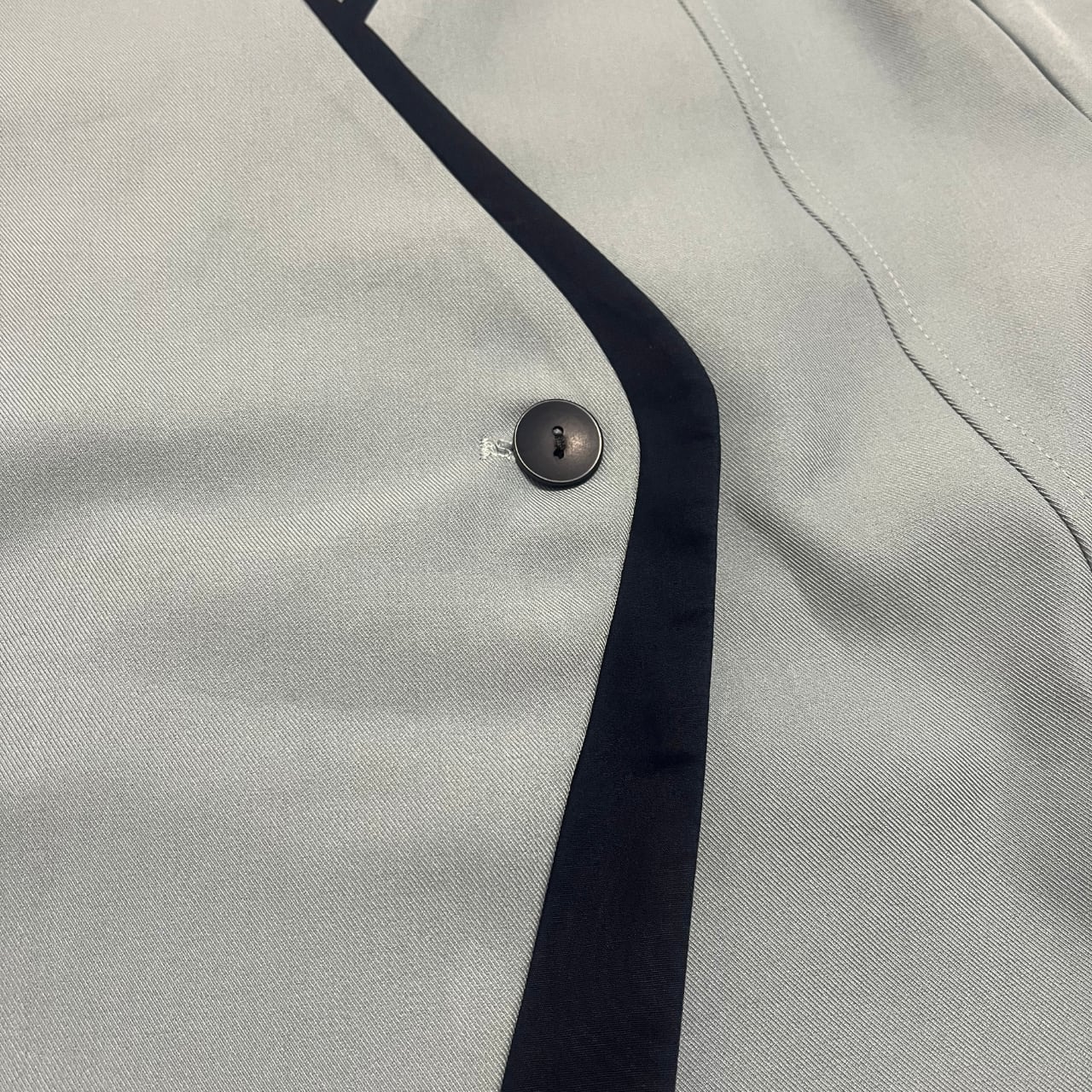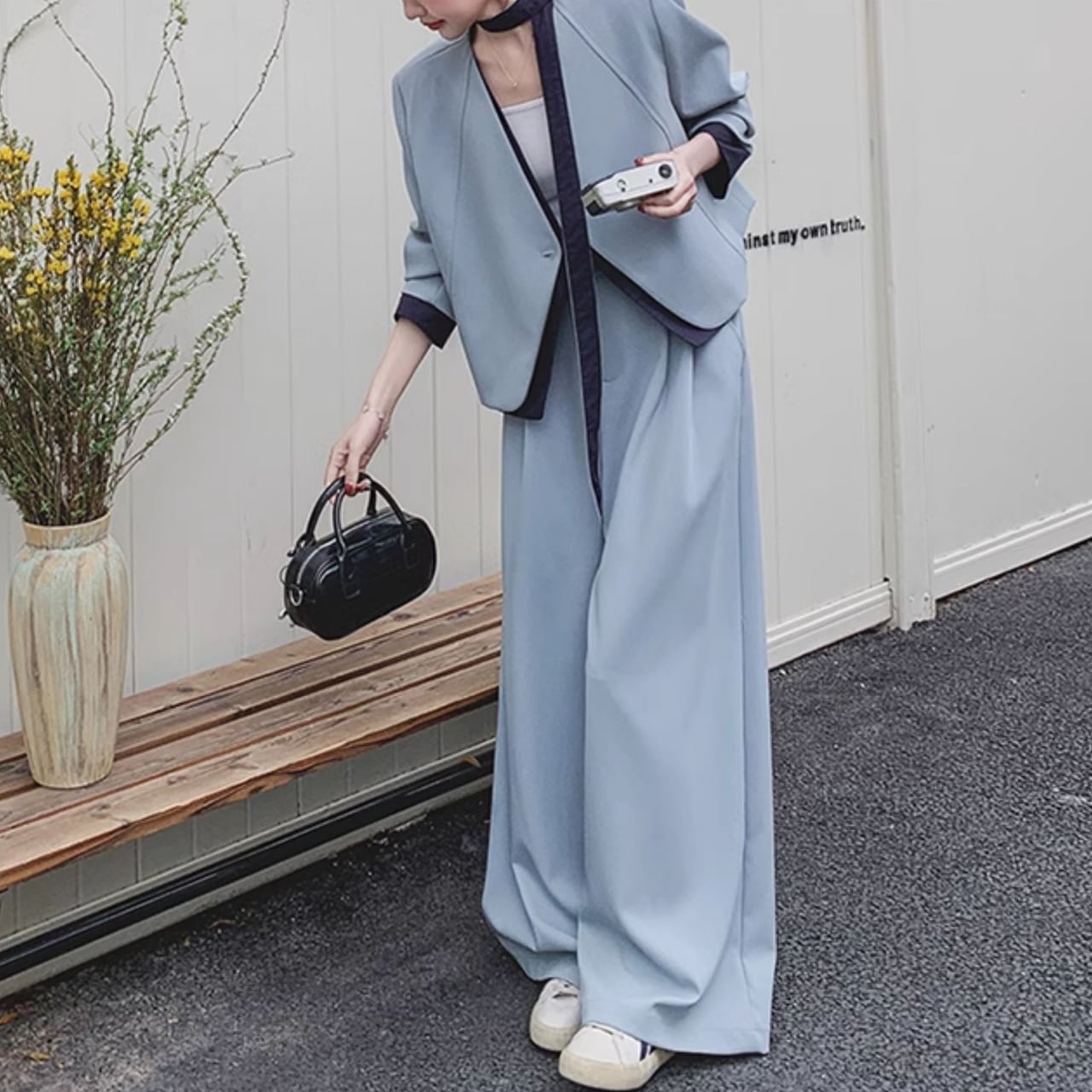 ジャケットは肩のラインを美しく見せるショート丈で、内側にはネイビーのレイヤード風デザインをあしらい、一枚で重ね着のような奥行きのあるスタイリングが完成します。