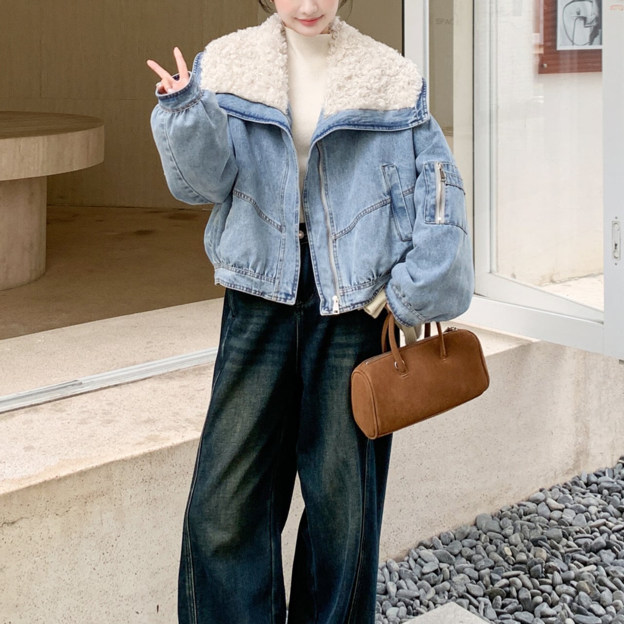 もこもこのボアと淡いデニムが絶妙にマッチした、ショート丈ジャケット。