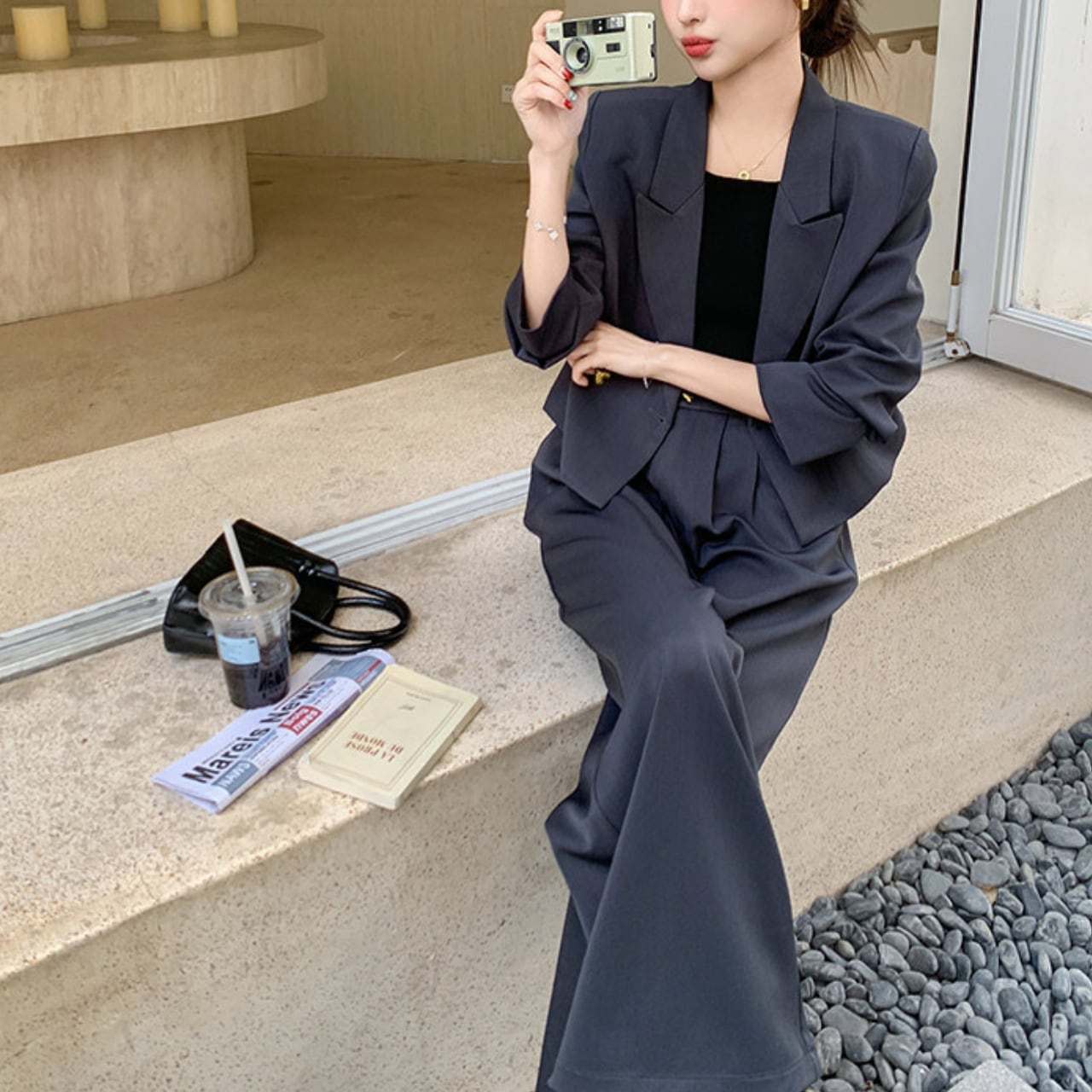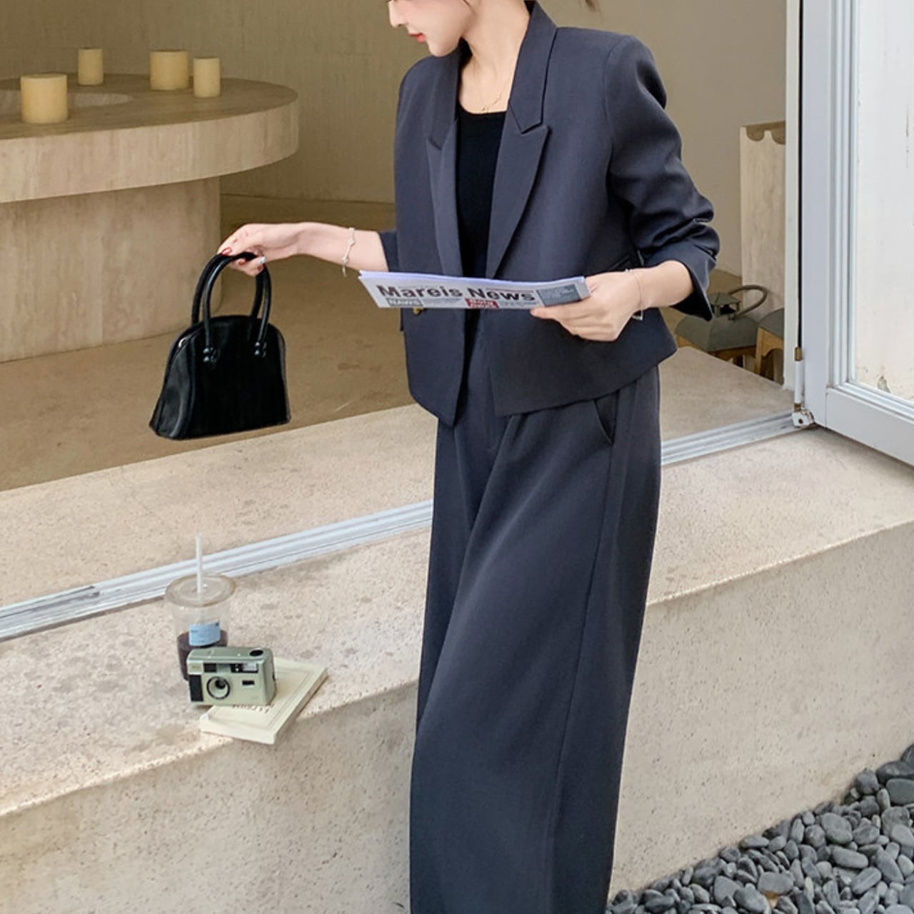 ハートデザインのボタンが魅力的なジャケットと、ワイドレッグパンツがセットになったアイテム。