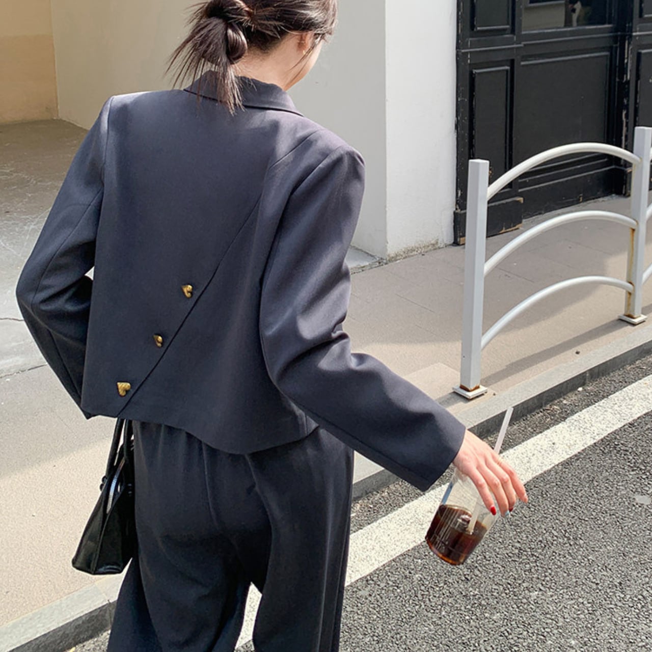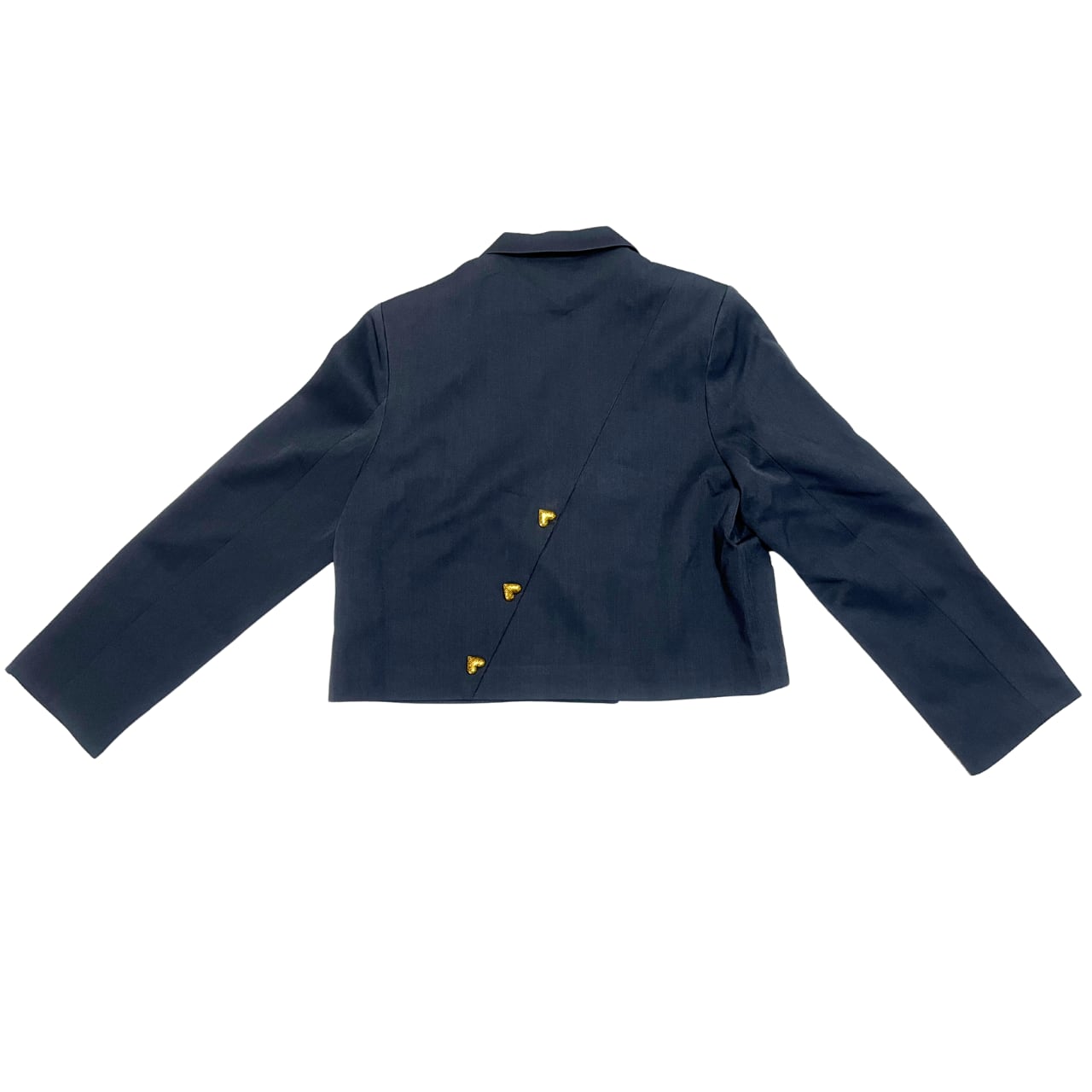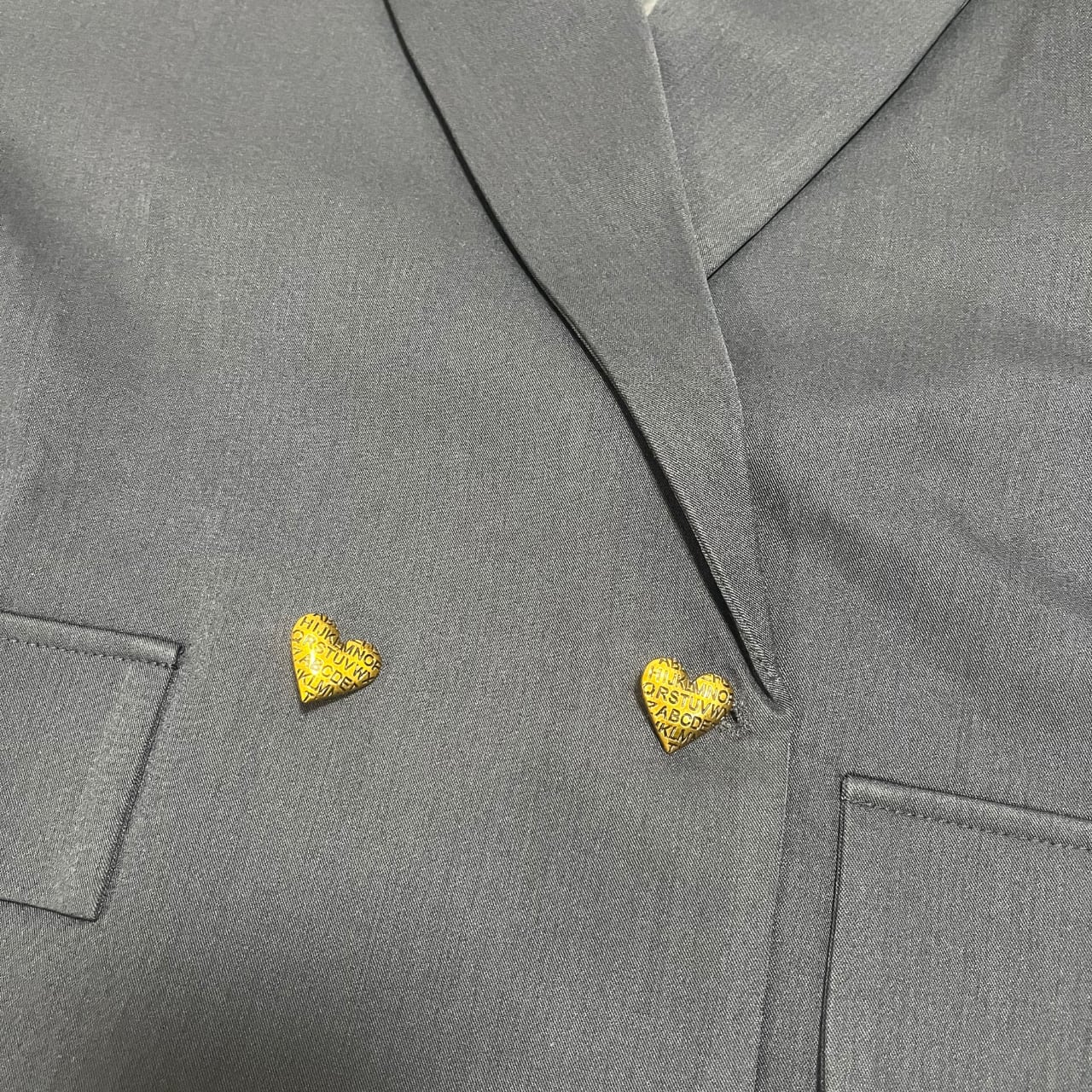 ジャケットはしっかりとした生地感で、ゴールドのハートボタンが全体のアクセントに。