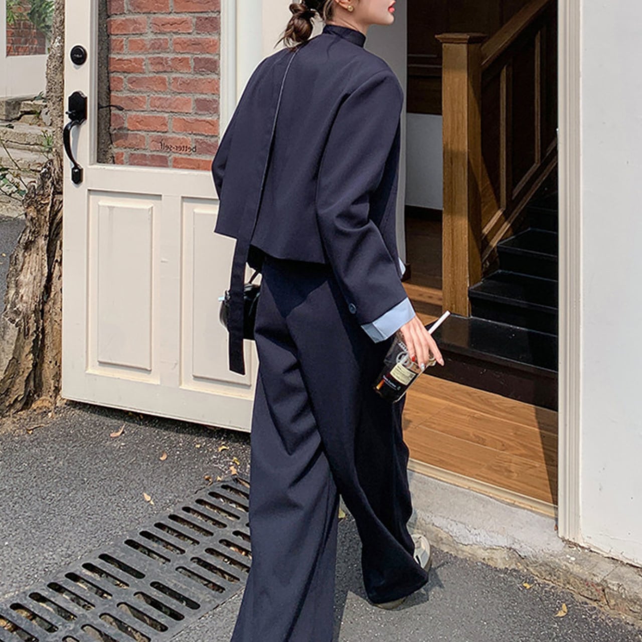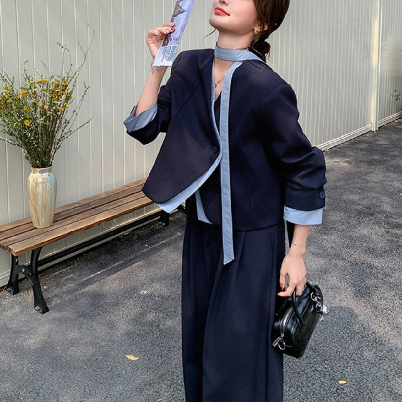 ネイビージャケットにライトブルーのシャツ風ディテールを施した、計算されたデザイン。